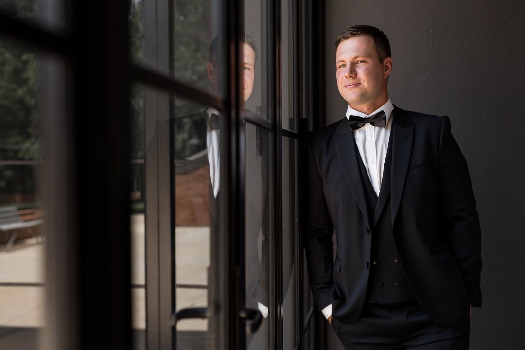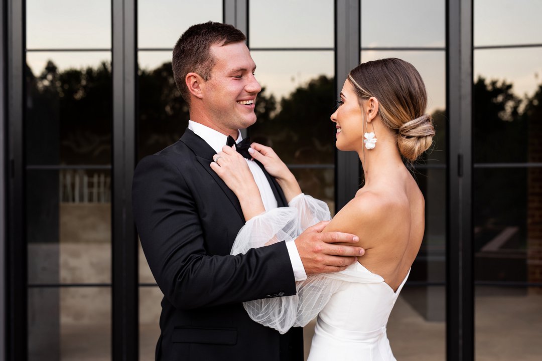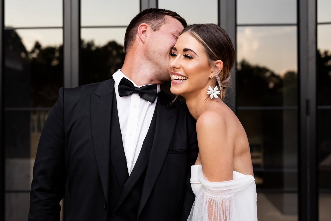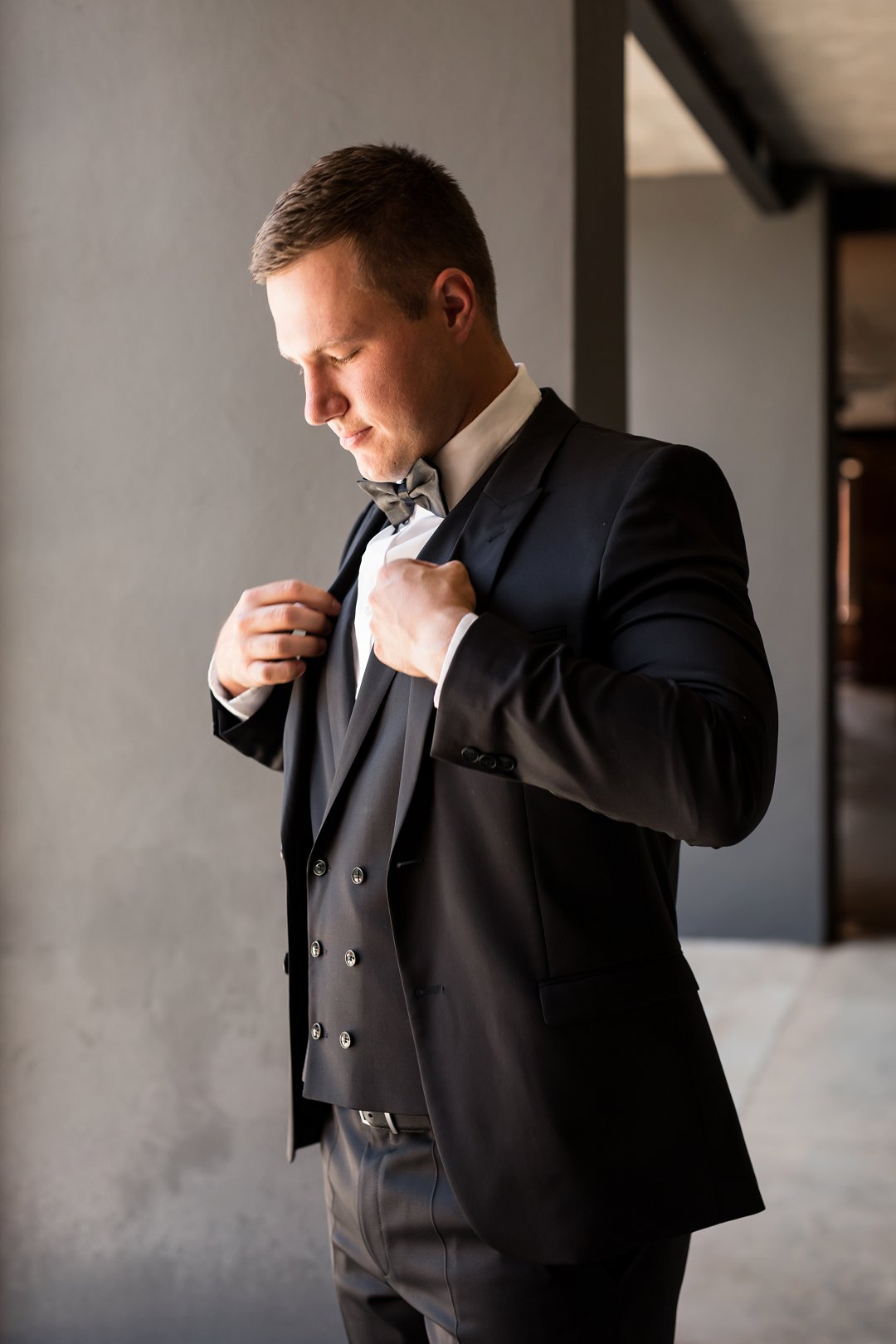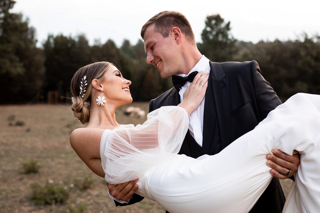 Henko het ʼn swart troupak gedra met ʼn onder baadjie en strikdas Van Hugo Boss. My trourok se inspirasie was baie modern en minimalisties maar steeds uniek gewees, ek het twee rokke gekombineer van die ontwerper Alena Leena, die Monstera rok in Crepe wat baie “slim fit” was met “mermaid cups” en ʼn lae V-rug gekombineer met die moue van die ARMERIA rok om ʼn sagte en unieke element by te dra aan die rok.