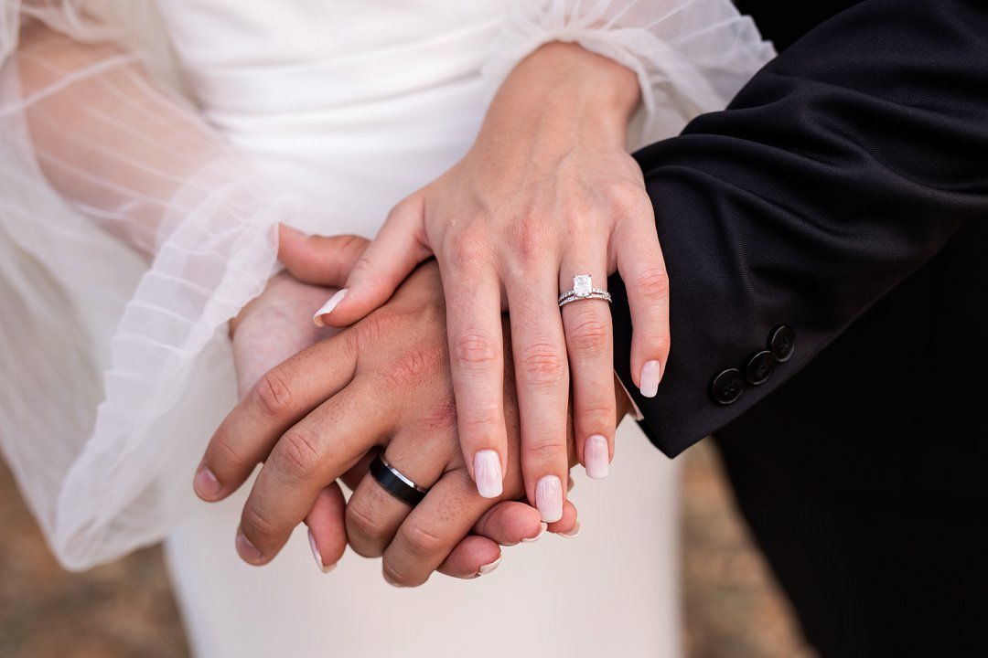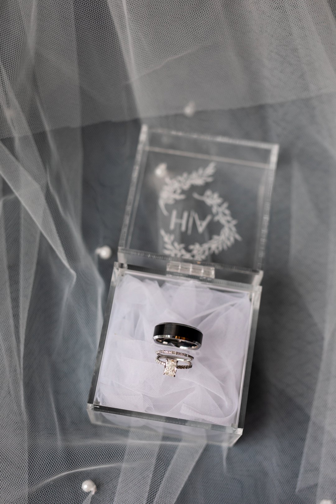 Henko het ʼn swart Tungsten ring gedra van Ben & Co. My trouring is ʼn Radiant 1.6 ct Diamant “set as a solitare with an invisible halo in Platinum”.