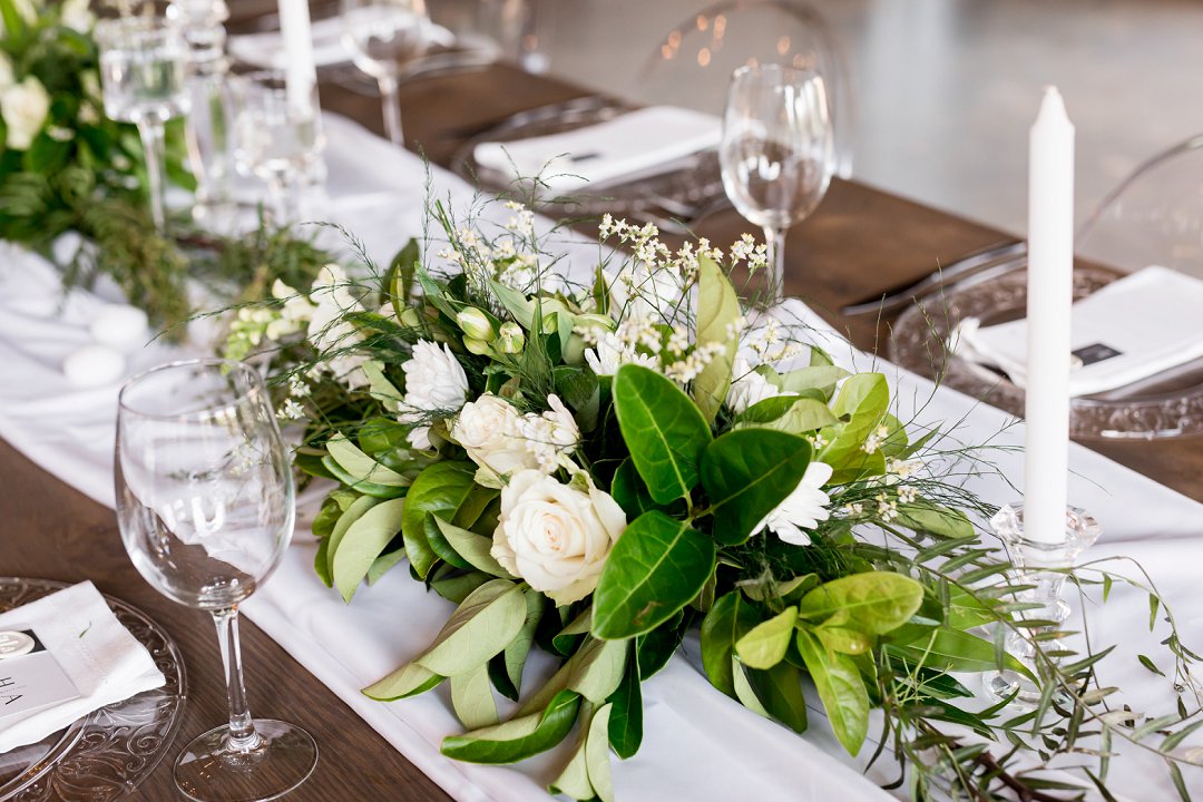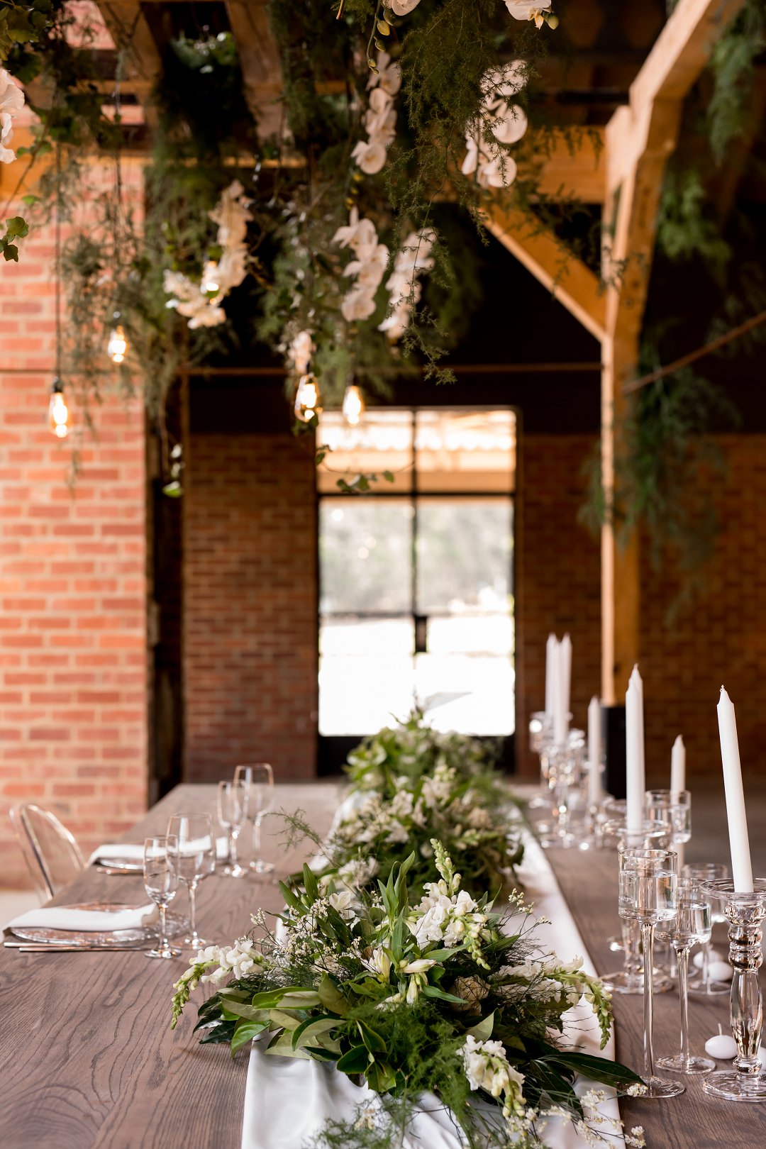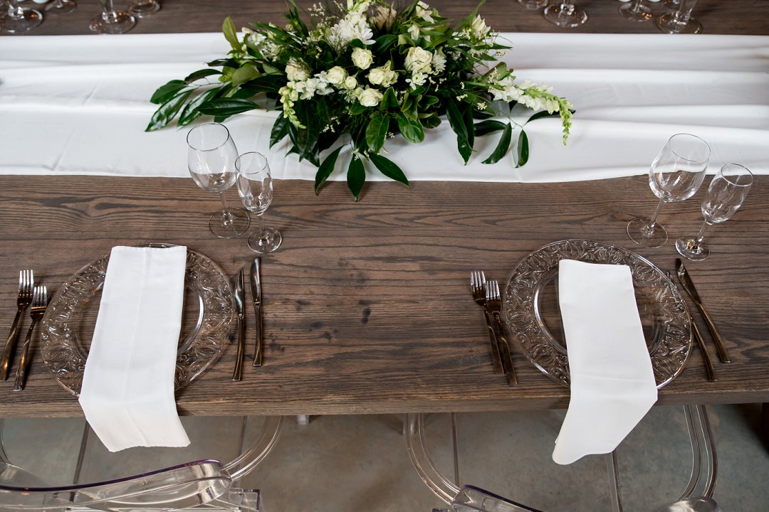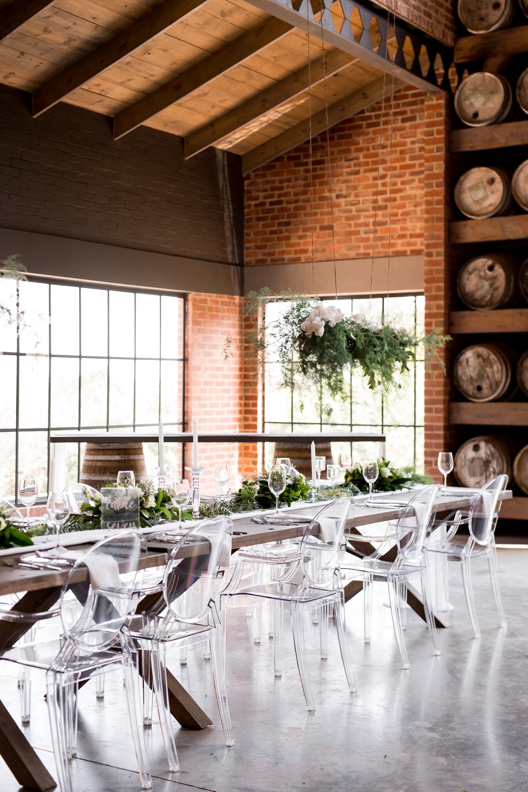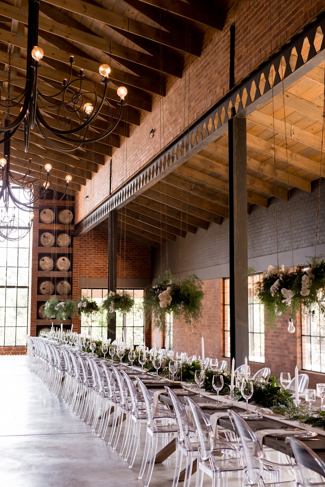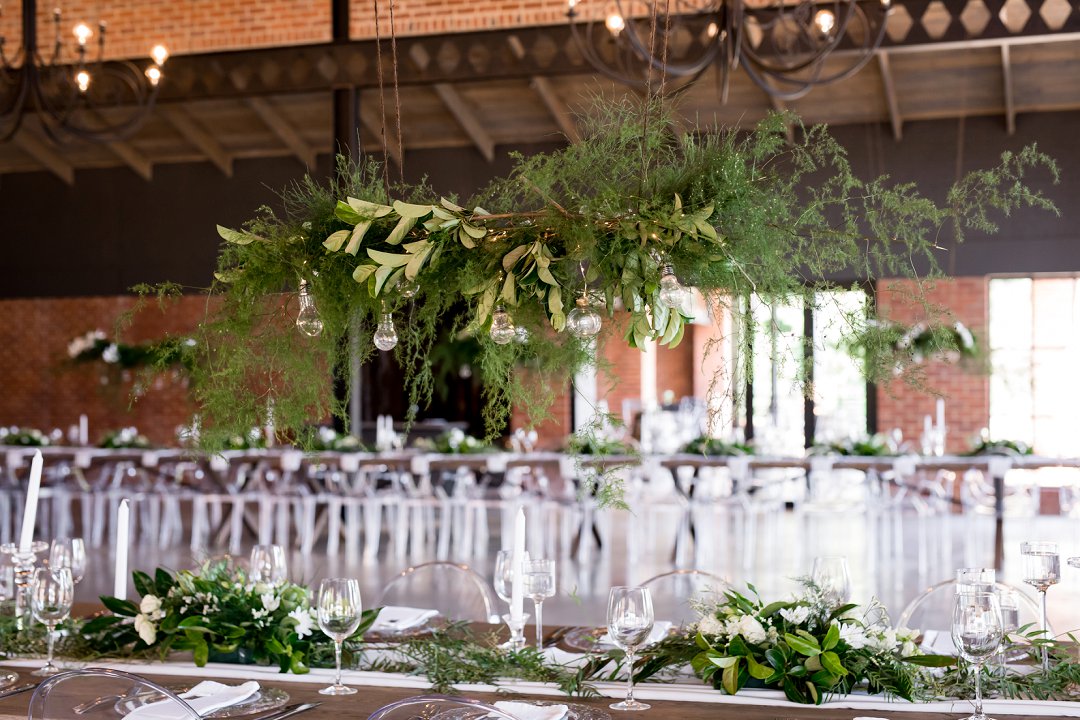 Die deurskynende stoele by die twee lang tafels skep die moderne gevoel en gee die trou dekor ʼn interessante element. Groen en Wit blom ontwerpe trek jou aandag op die tafels. Die groenigheid en orgideë wat bo die lang tafels hang, vul die venue spasie mooi op.