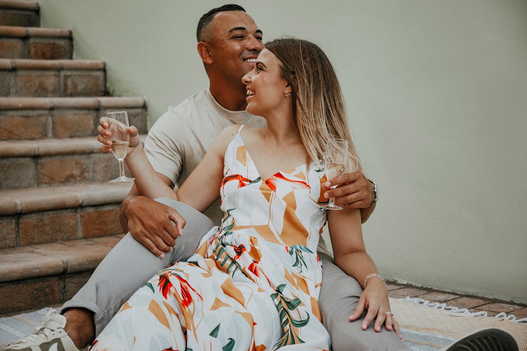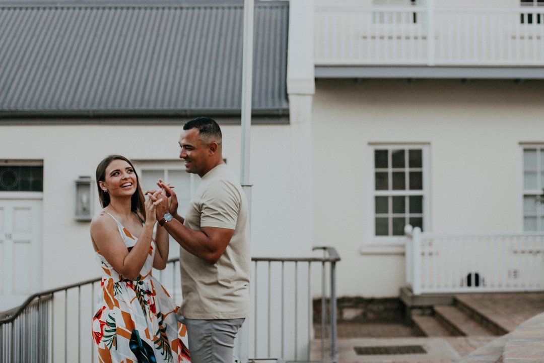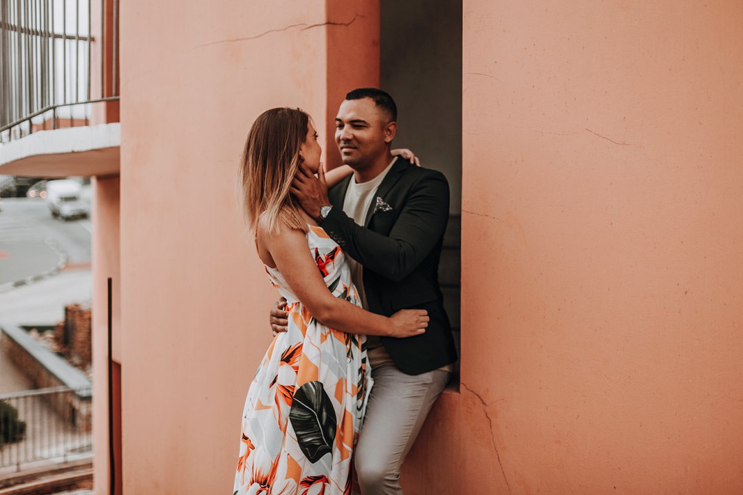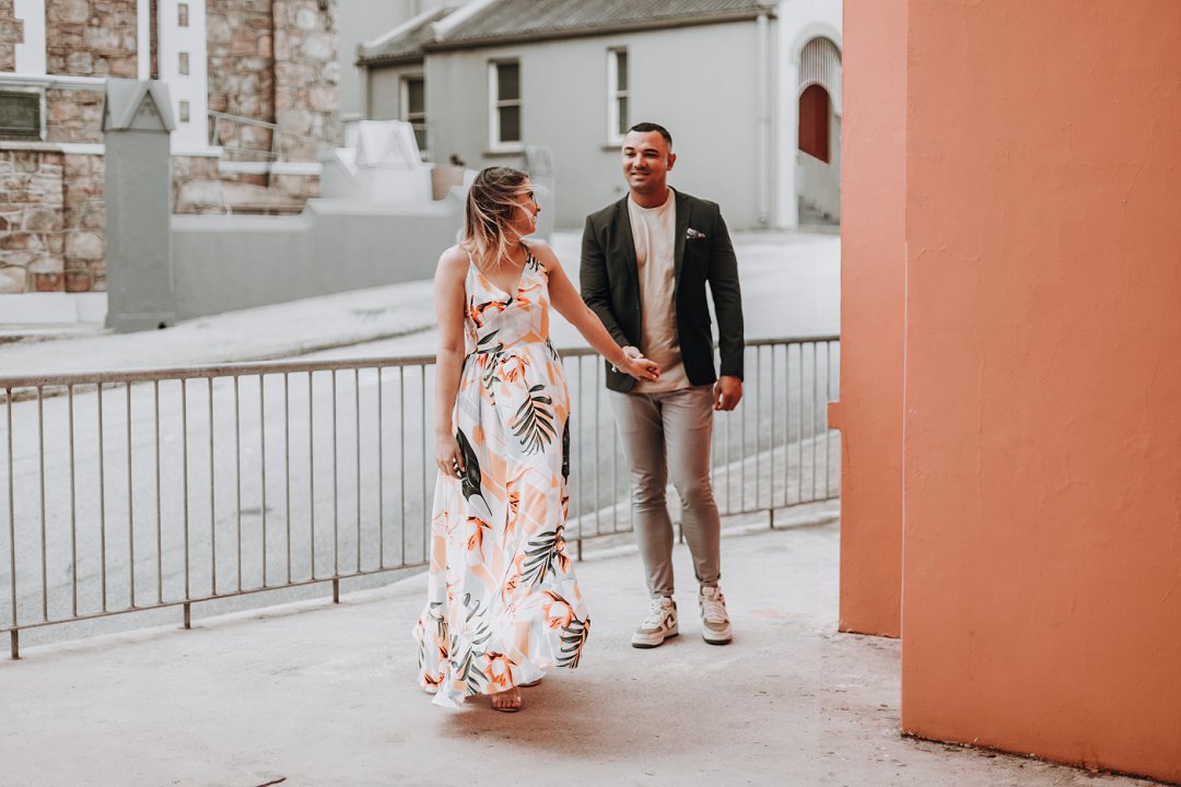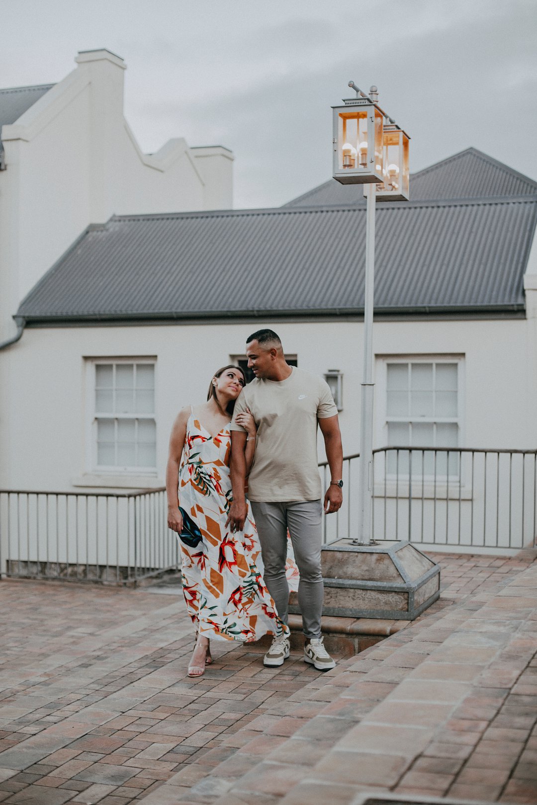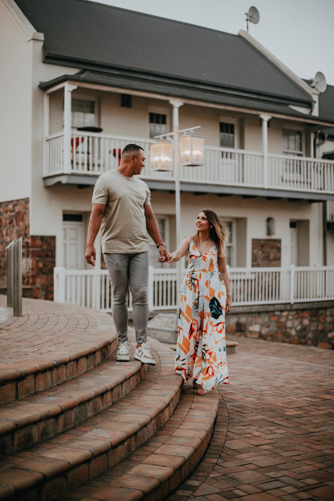 Die paartjie se uitrustings het só mooi gelyk in kontras met die geboue in die agtergrond. Tiffany se vloeiende blomme rok gee die fotosessie ʼn vakansie atmosfeer. Jy kan sien die paartjie het die fotosessie vreeslik geniet en het tot ʼn glasie vonkelwyn geniet! Dit is mos hoe dit gedoen moet word.