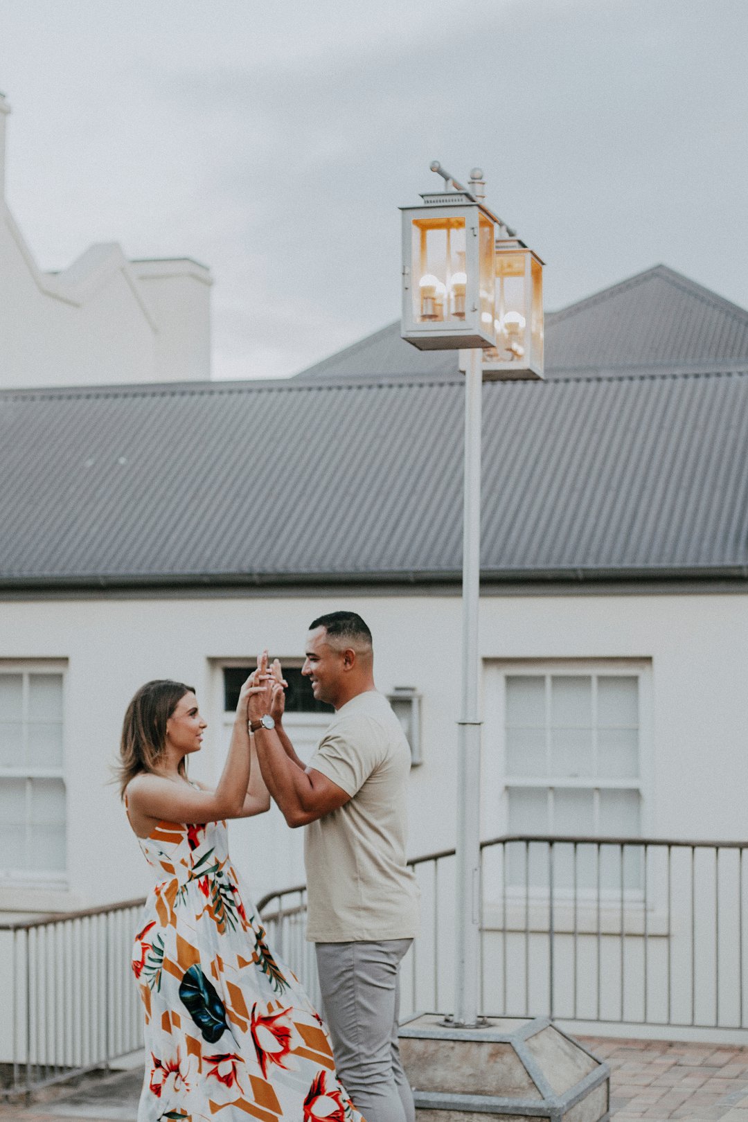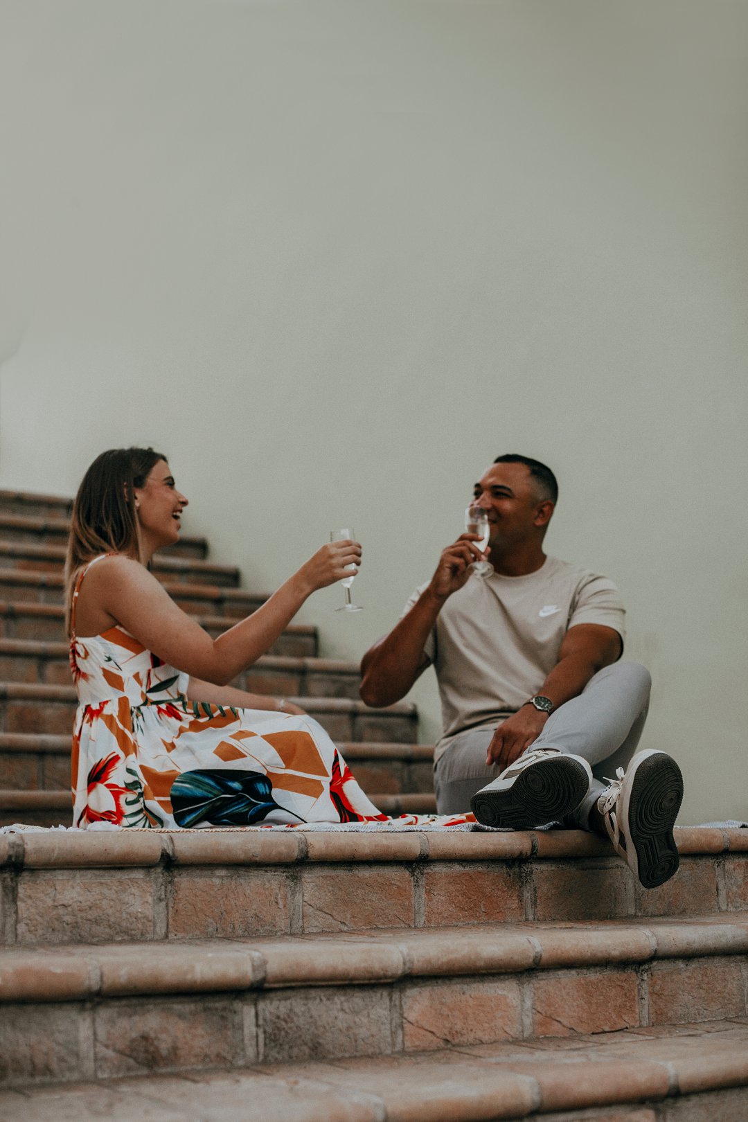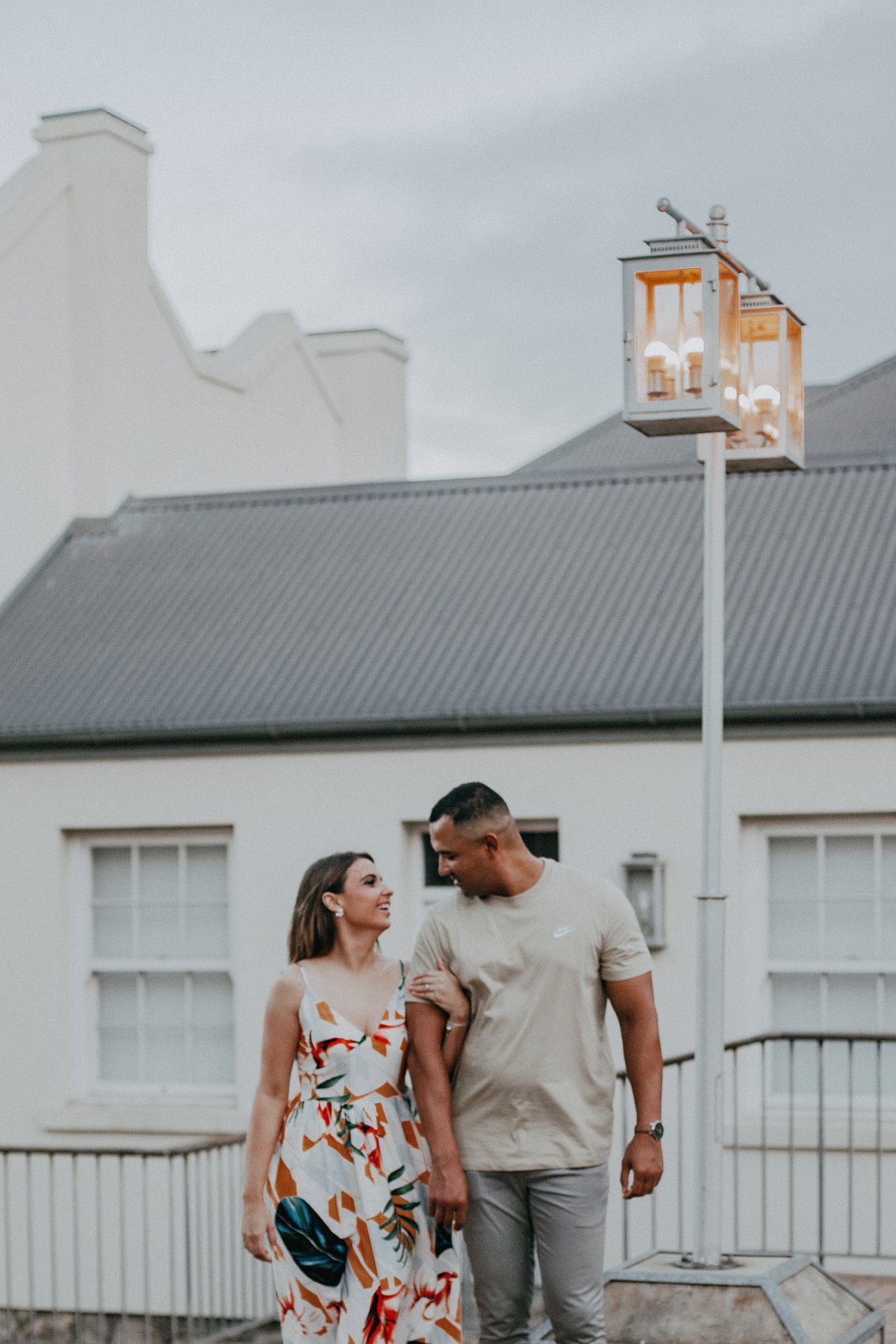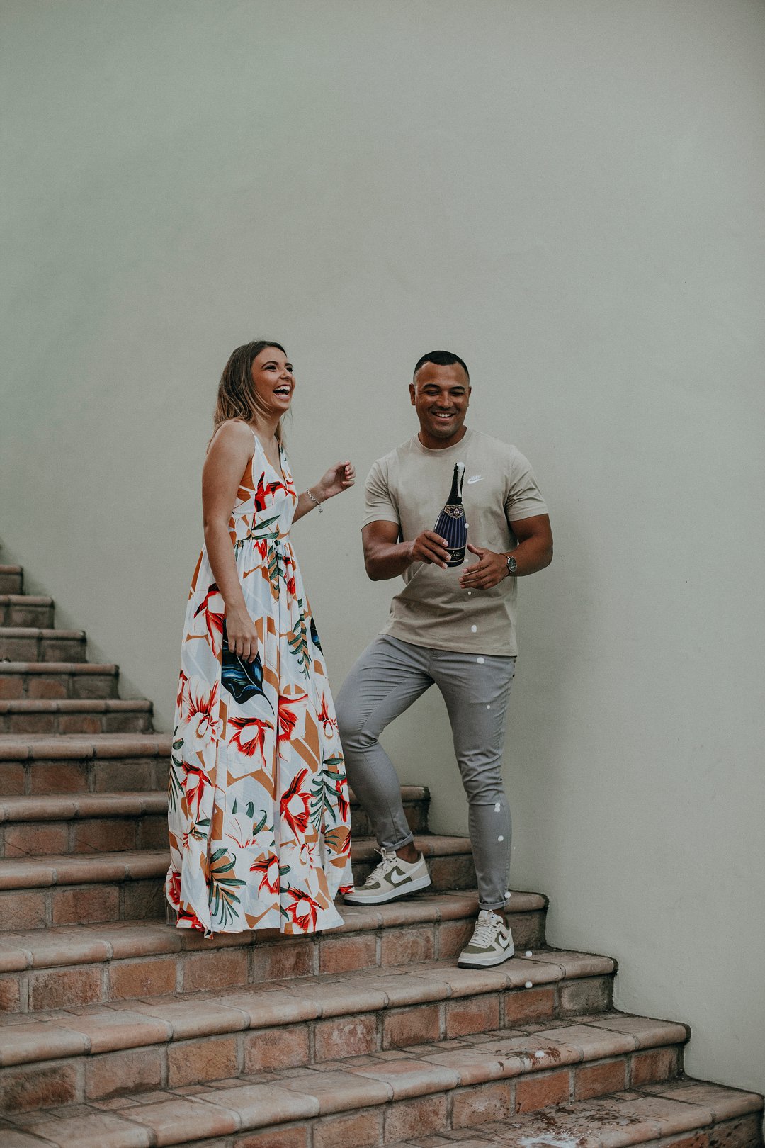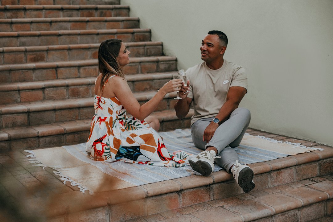 Die paartjie se uitrustings het só mooi gelyk in kontras met die geboue in die agtergrond. Tiffany se vloeiende blomme rok gee die fotosessie ʼn vakansie atmosfeer. Jy kan sien die paartjie het die fotosessie vreeslik geniet en het tot ʼn glasie vonkelwyn geniet! Dit is mos hoe dit gedoen moet word.