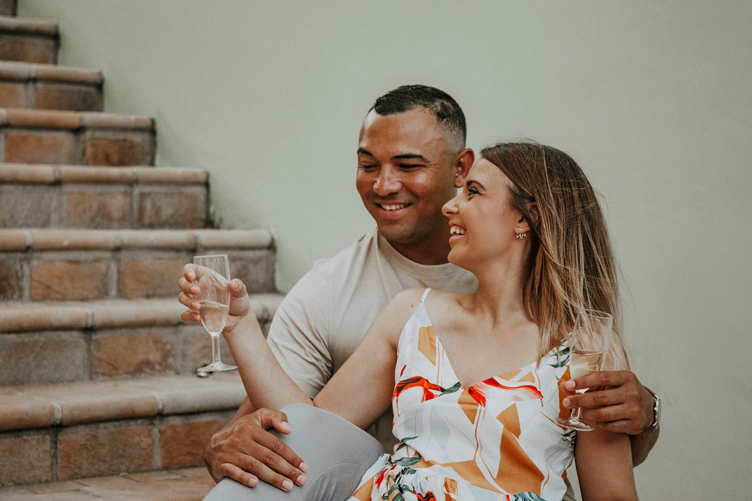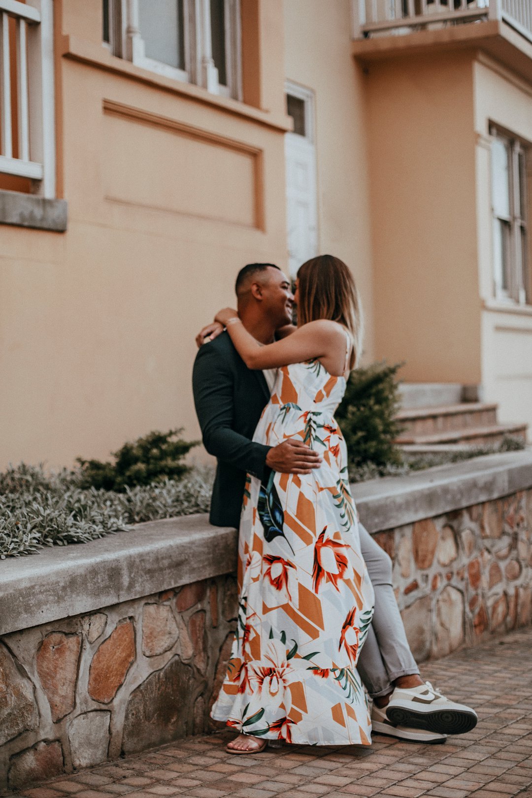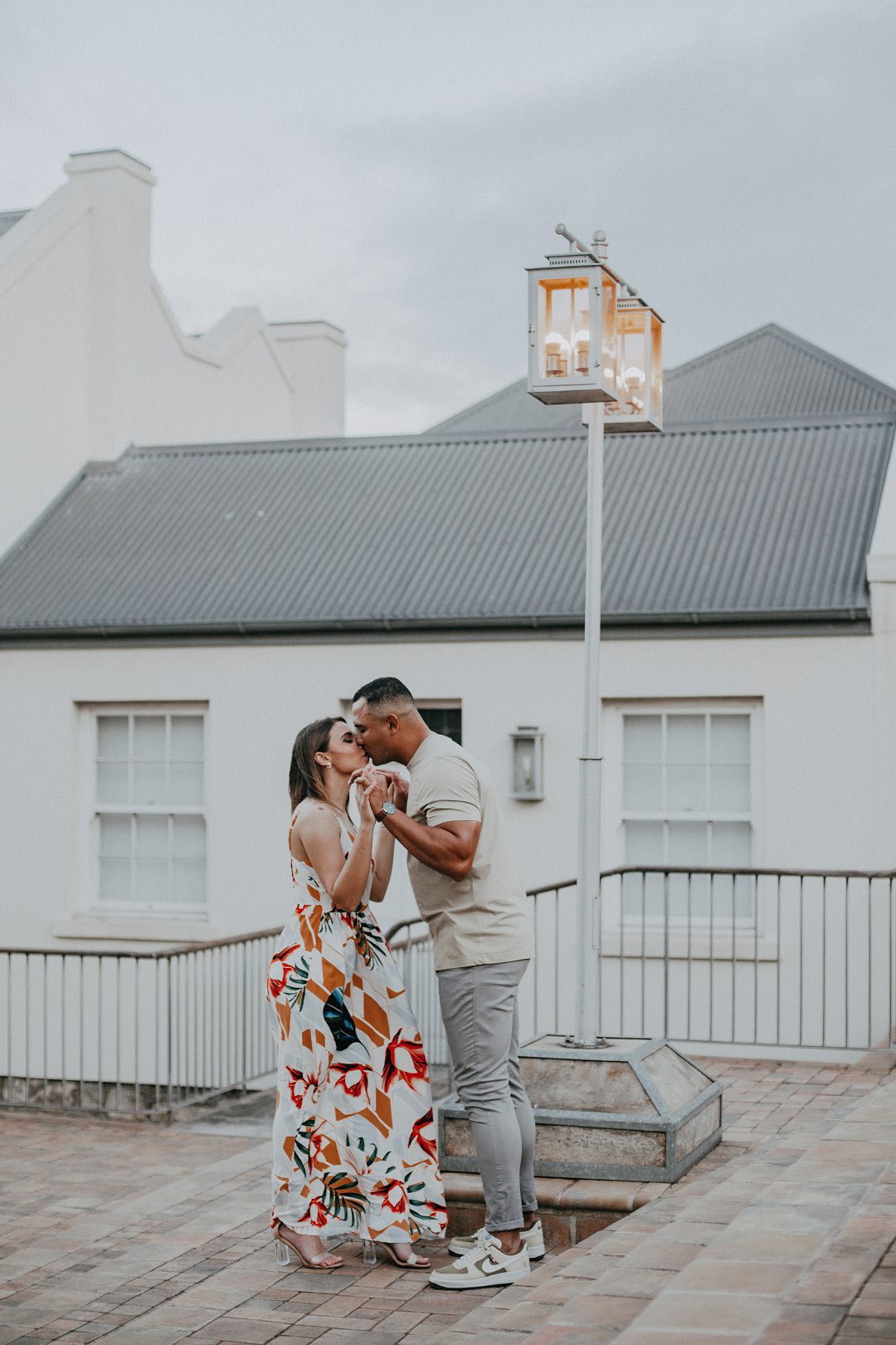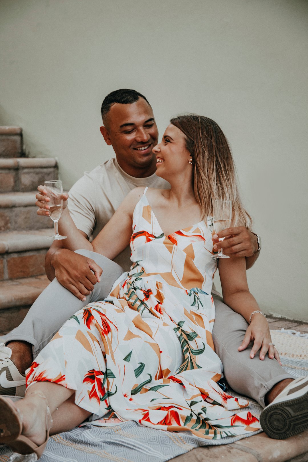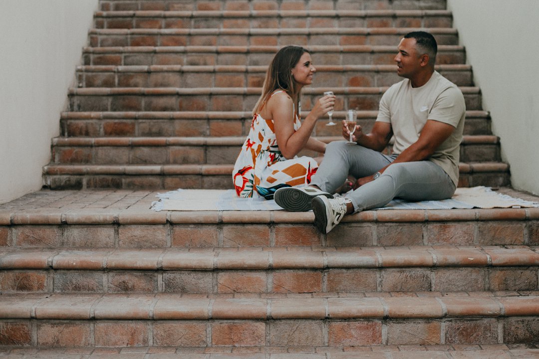 Die paartjie se uitrustings het só mooi gelyk in kontras met die geboue in die agtergrond. Tiffany se vloeiende blomme rok gee die fotosessie ʼn vakansie atmosfeer. Jy kan sien die paartjie het die fotosessie vreeslik geniet en het tot ʼn glasie vonkelwyn geniet! Dit is mos hoe dit gedoen moet word.