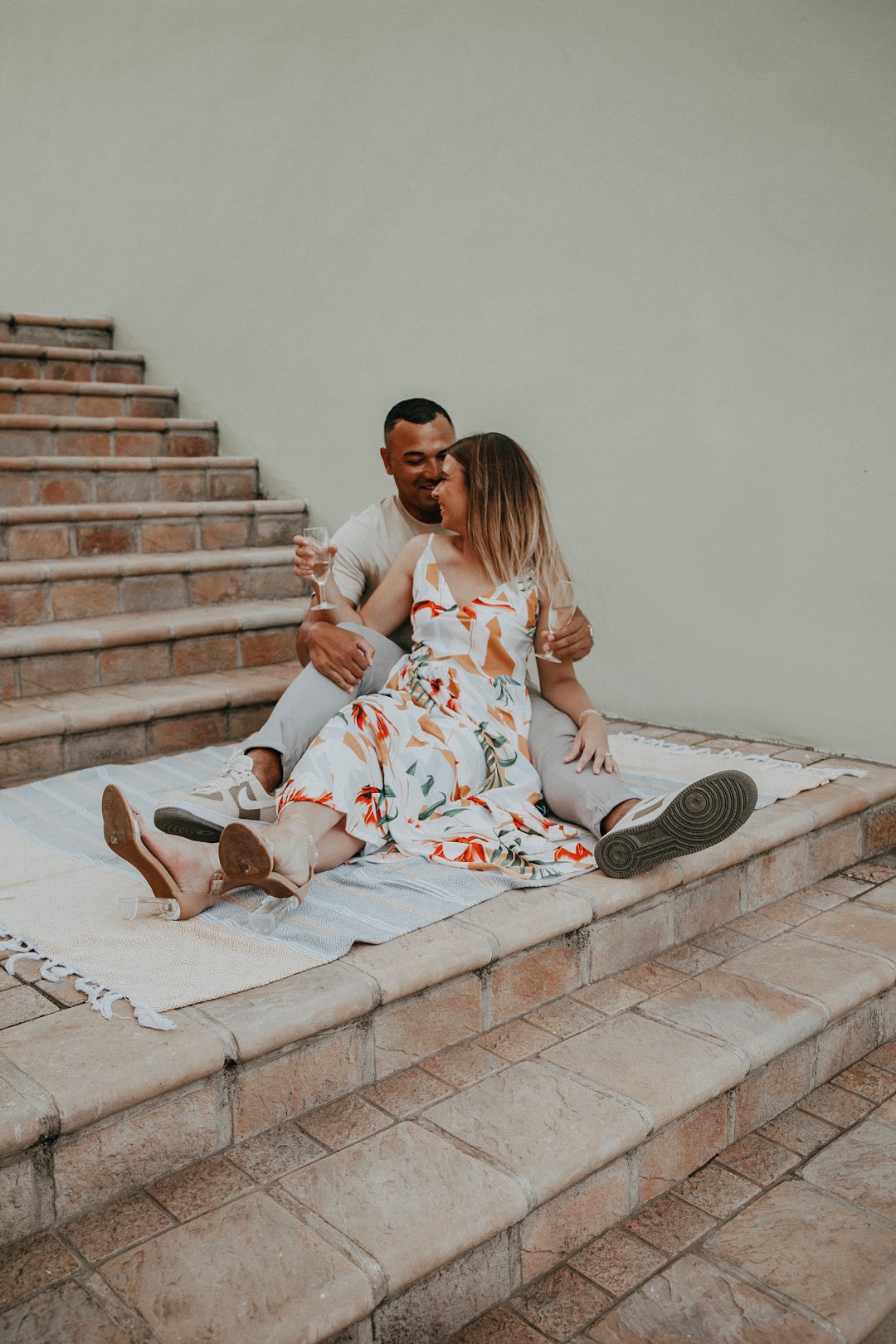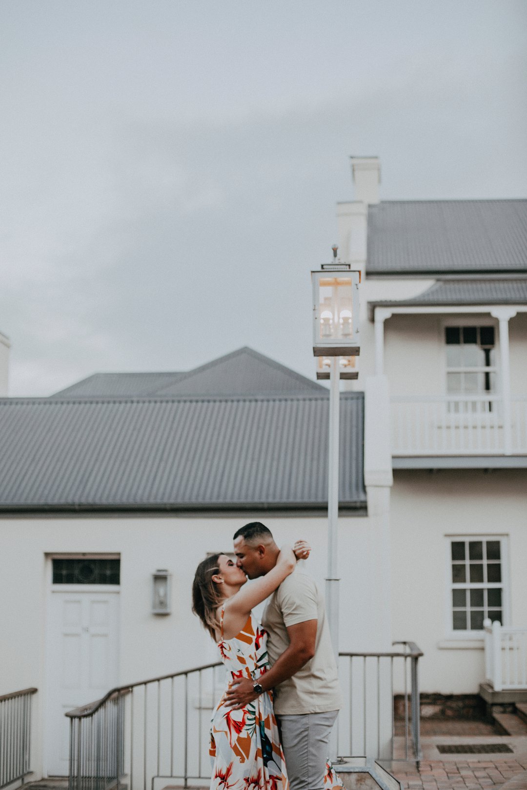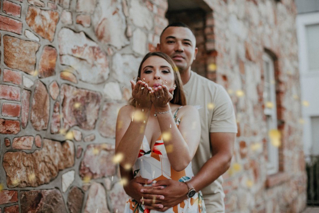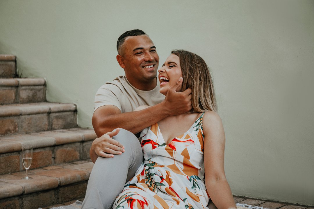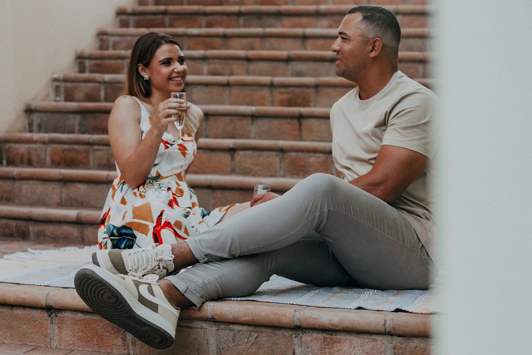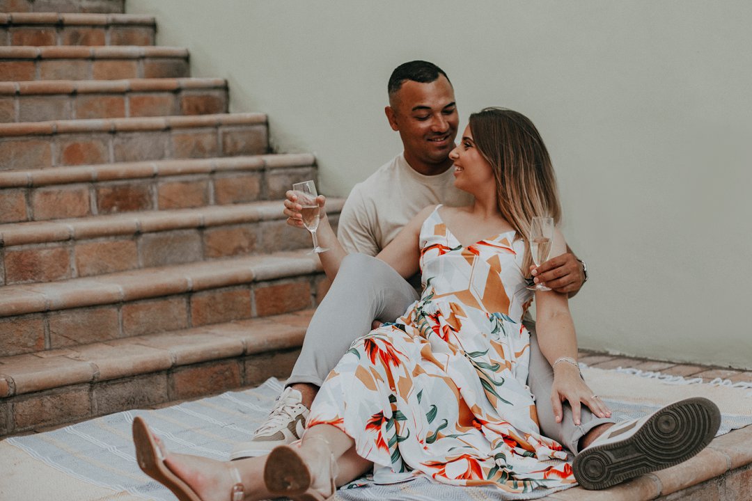 Die paartjie se uitrustings het só mooi gelyk in kontras met die geboue in die agtergrond. Tiffany se vloeiende blomme rok gee die fotosessie ʼn vakansie atmosfeer. Jy kan sien die paartjie het die fotosessie vreeslik geniet en het tot ʼn glasie vonkelwyn geniet! Dit is mos hoe dit gedoen moet word.