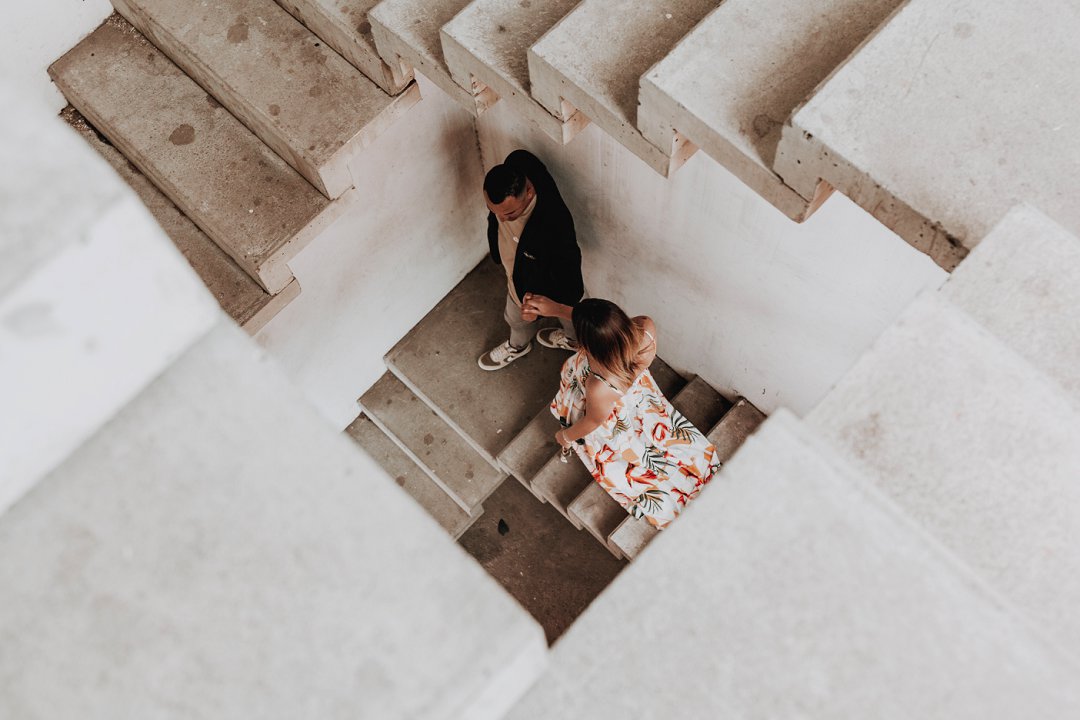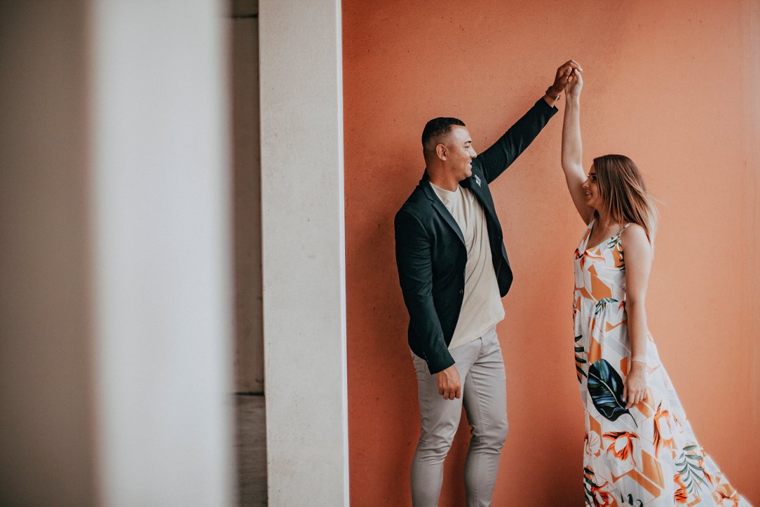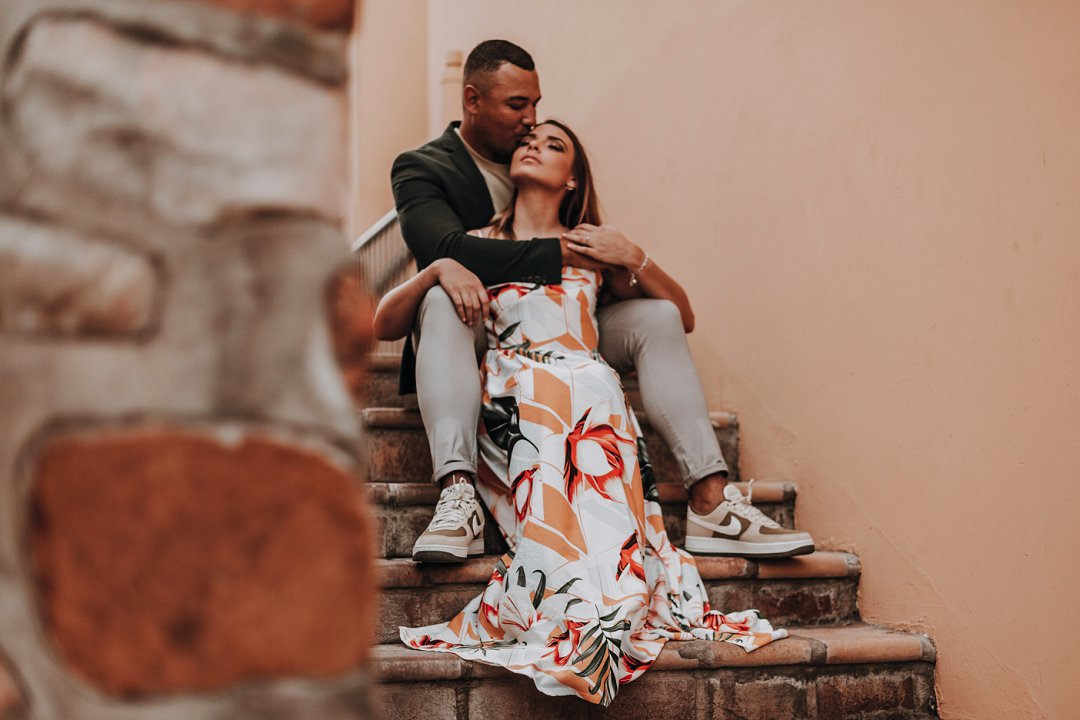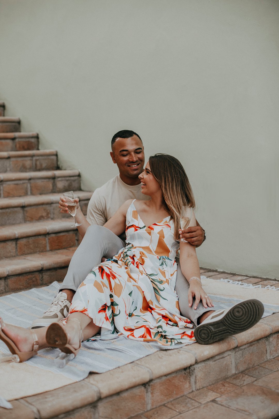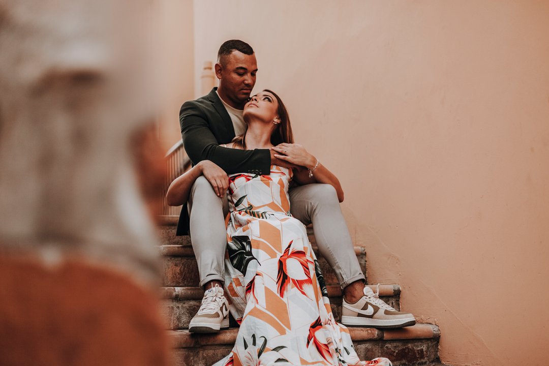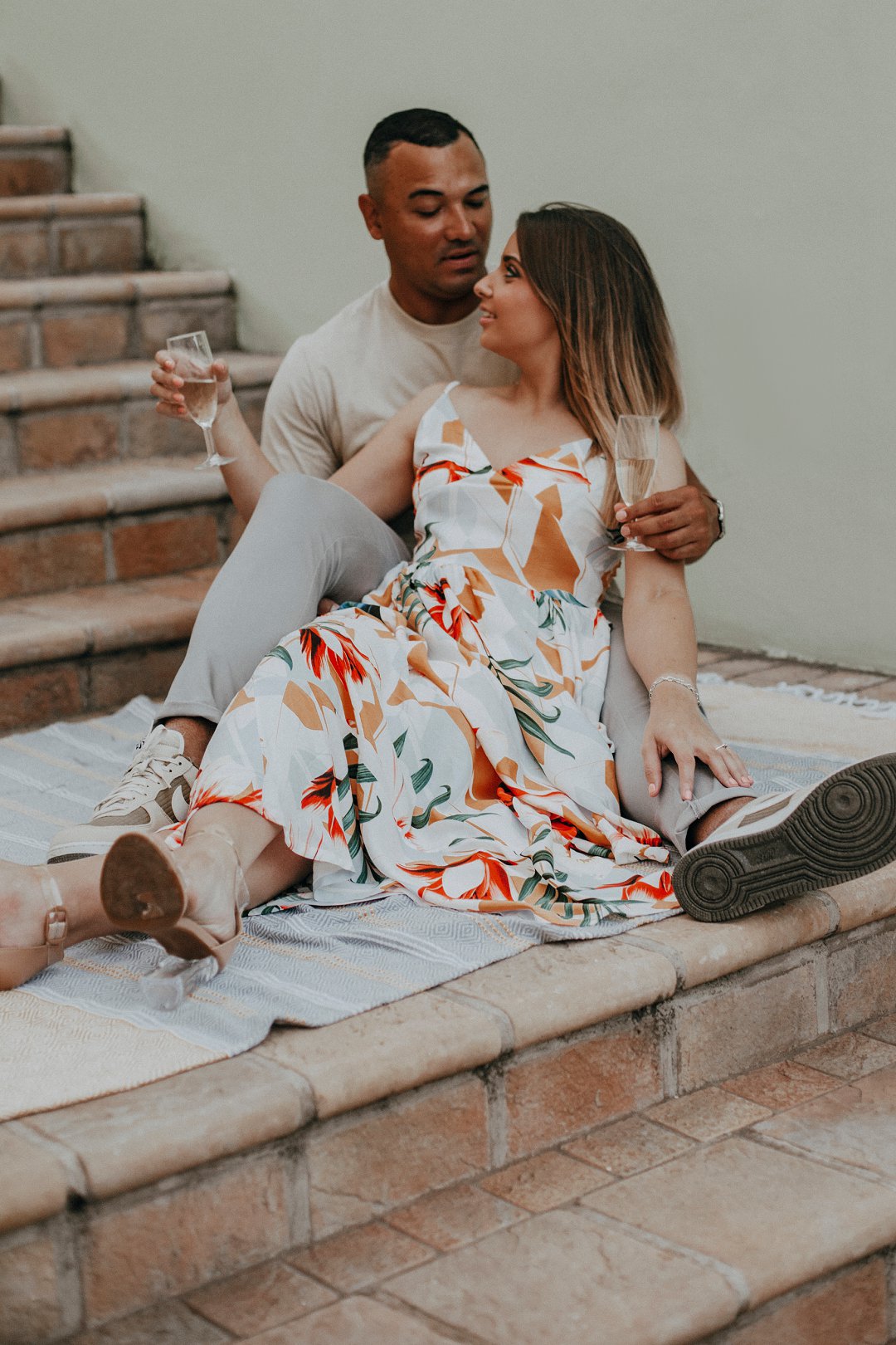 Die paartjie se uitrustings het só mooi gelyk in kontras met die geboue in die agtergrond. Tiffany se vloeiende blomme rok gee die fotosessie ʼn vakansie atmosfeer. Jy kan sien die paartjie het die fotosessie vreeslik geniet en het tot ʼn glasie vonkelwyn geniet! Dit is mos hoe dit gedoen moet word.