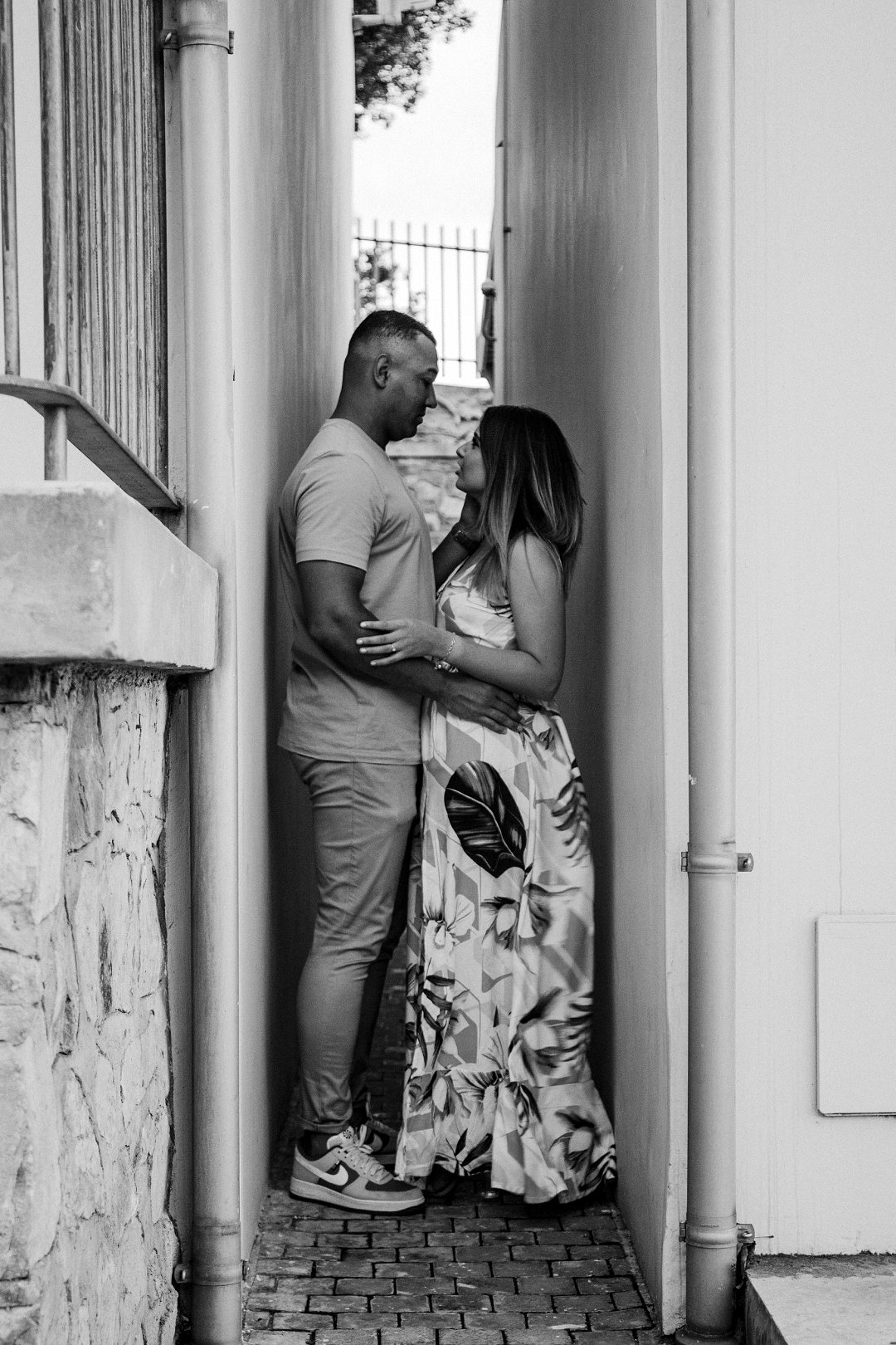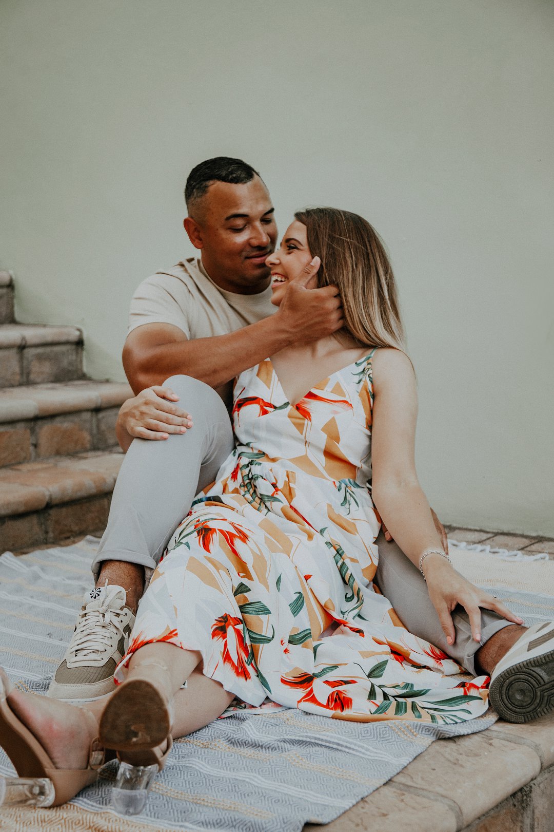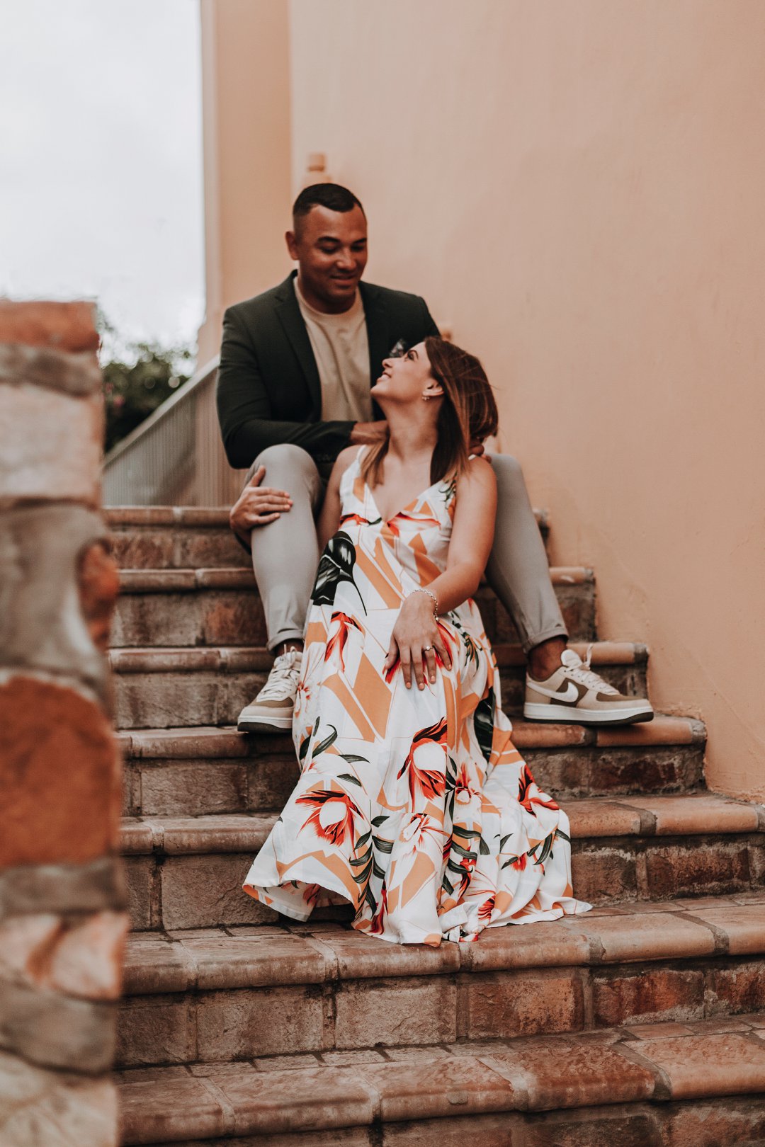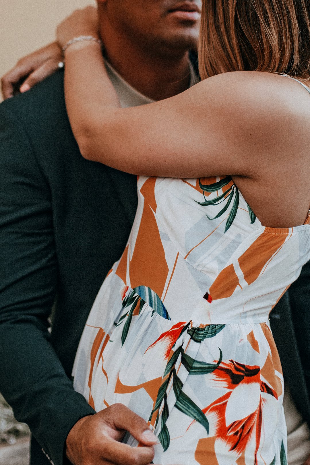 Die paartjie se uitrustings het só mooi gelyk in kontras met die geboue in die agtergrond. Tiffany se vloeiende blomme rok gee die fotosessie ʼn vakansie atmosfeer. Jy kan sien die paartjie het die fotosessie vreeslik geniet en het tot ʼn glasie vonkelwyn geniet! Dit is mos hoe dit gedoen moet word.