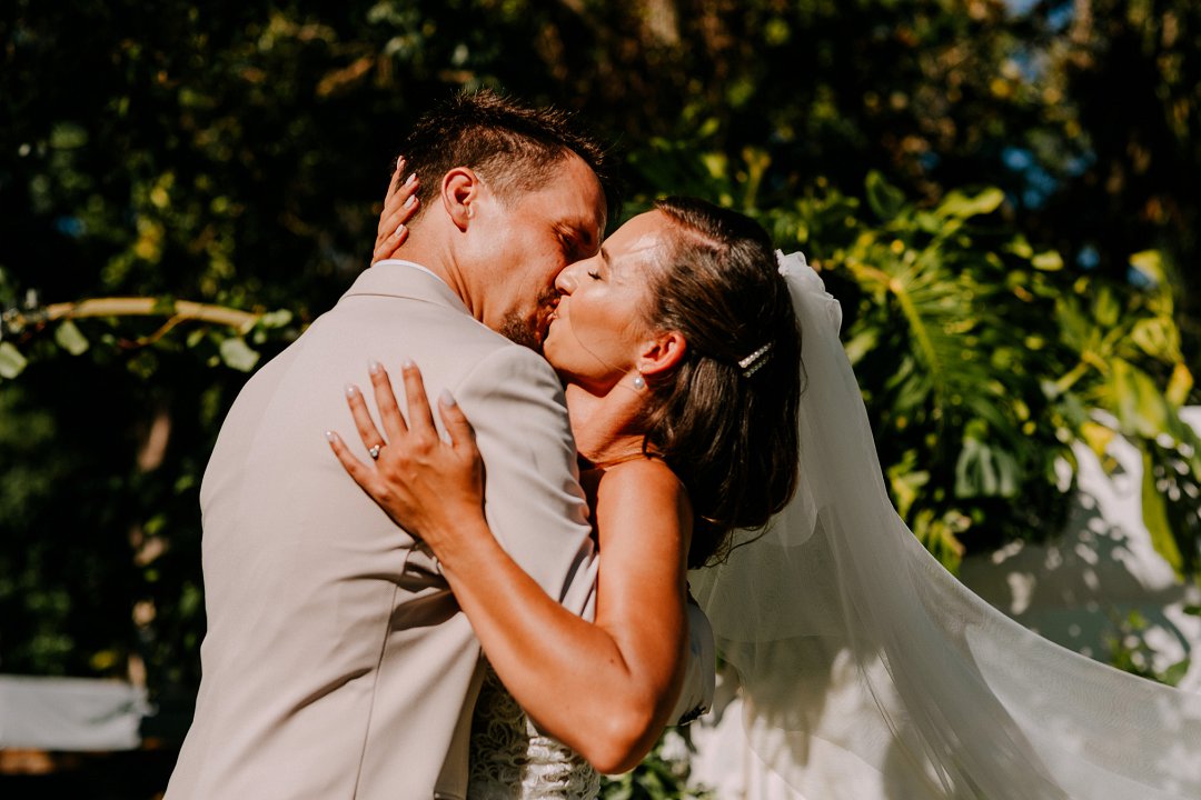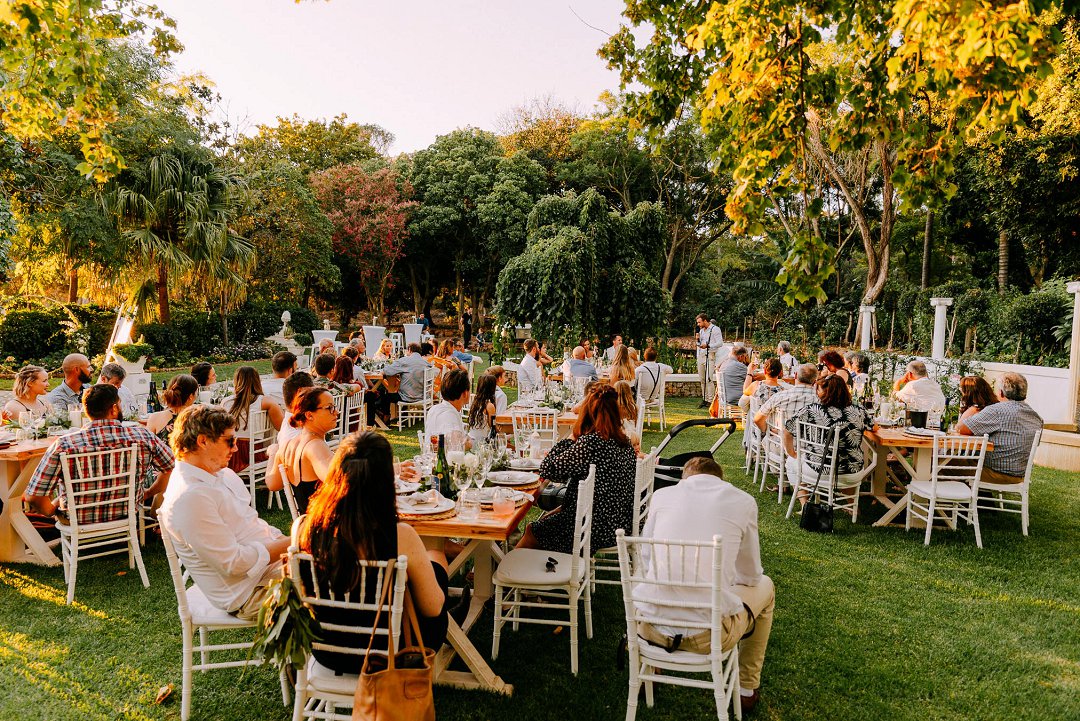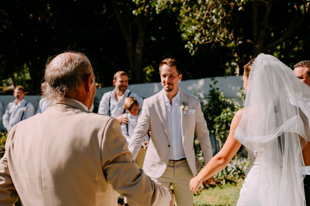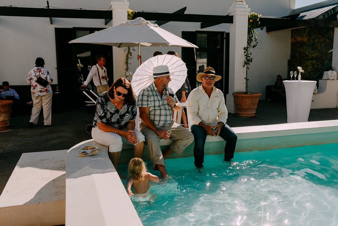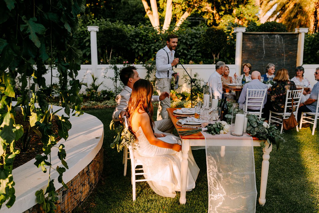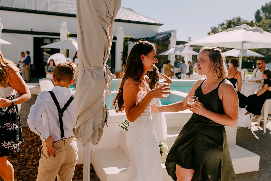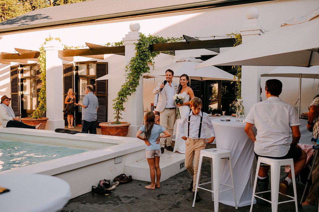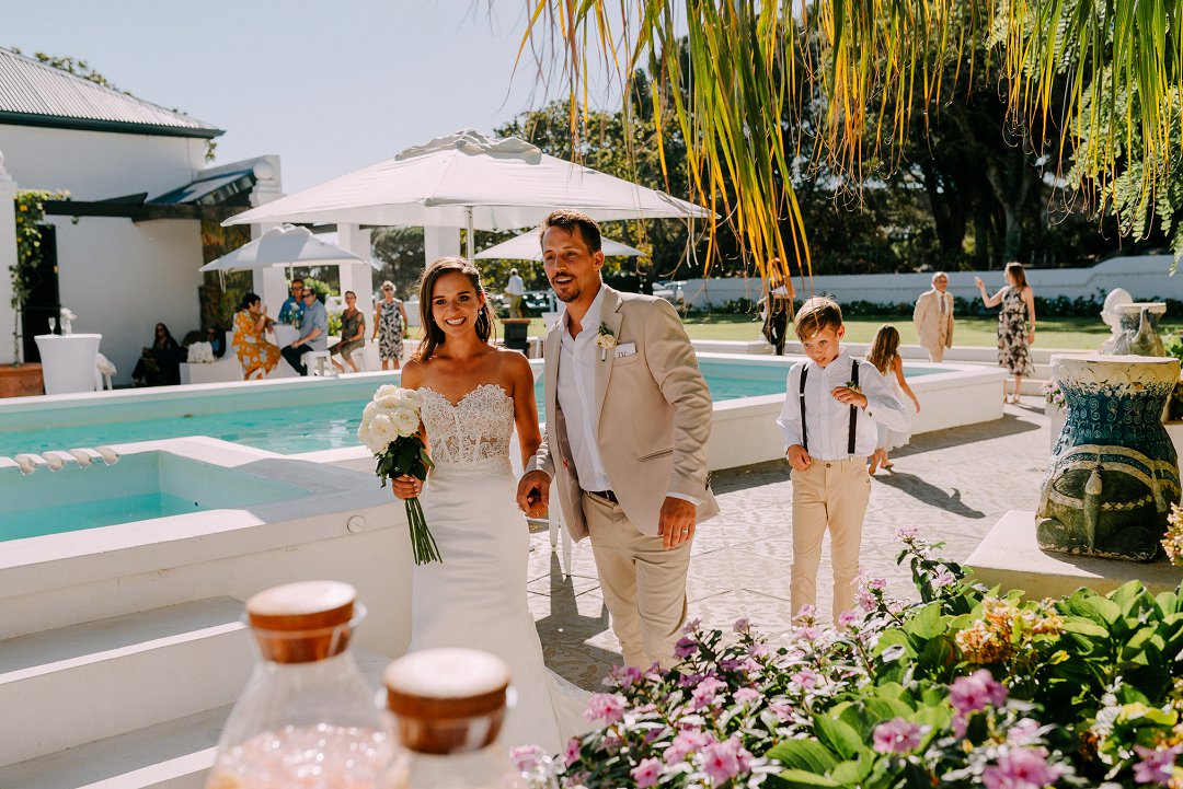 Met opgewondenheid deel ons Jean en Courtney se buitelug tuin troue in Somerset-Wes op Mooi Troues. Die paartjie het sulke mooi weer gehad op hul troudag en die sonlig het alles so mooi opgehelder. Van die gaste het met hul voete in die swembad gesit terwyl ander gesellig met mekaar gesels het. Hulle seremonie was ook buite tussen en onder die bome en versorgde tuine van hul trou venue.