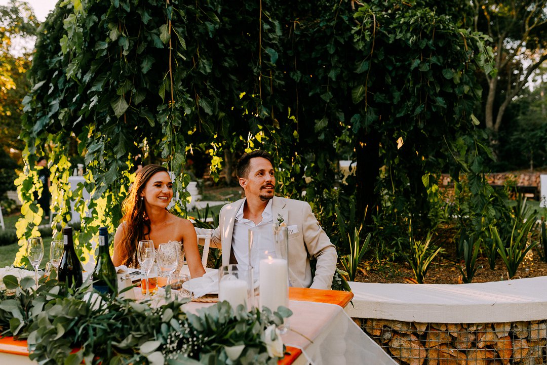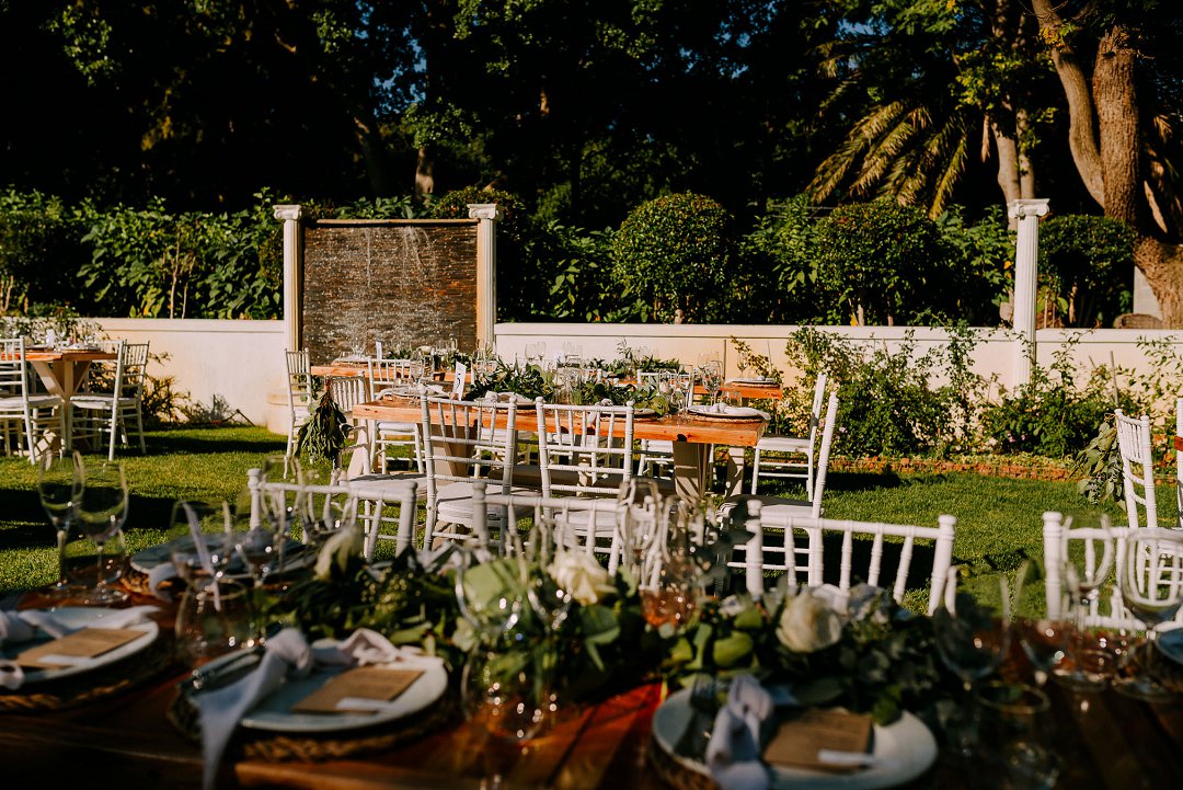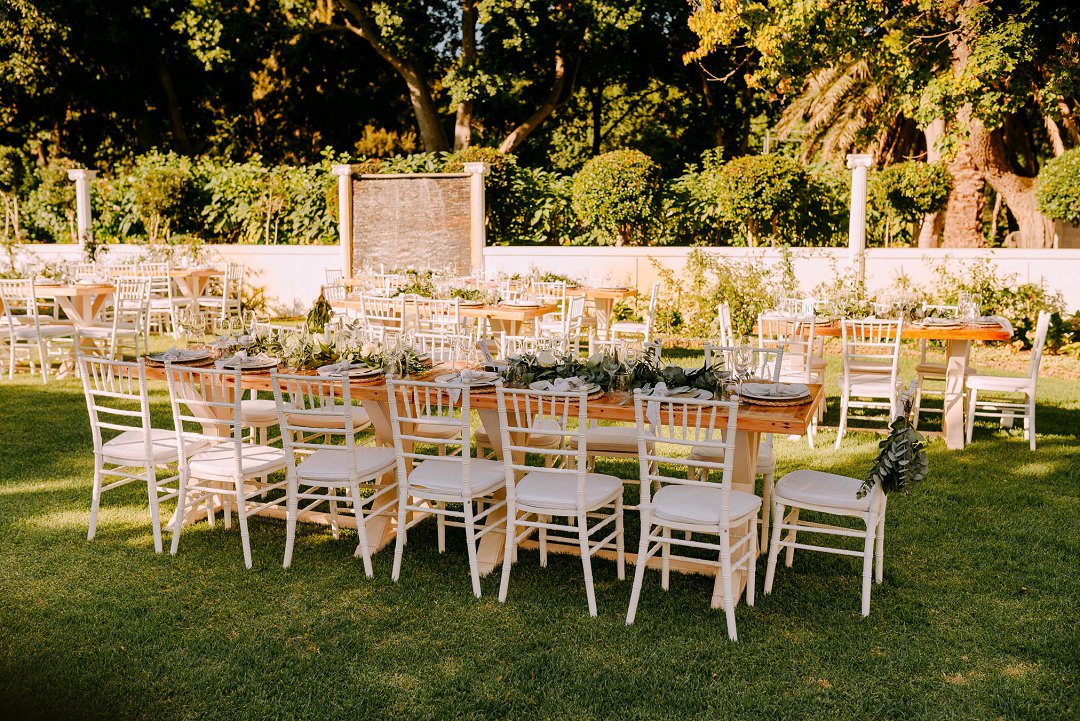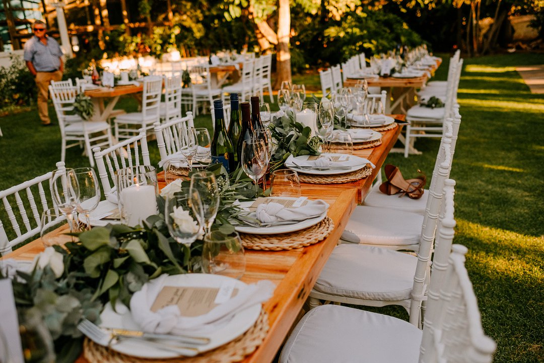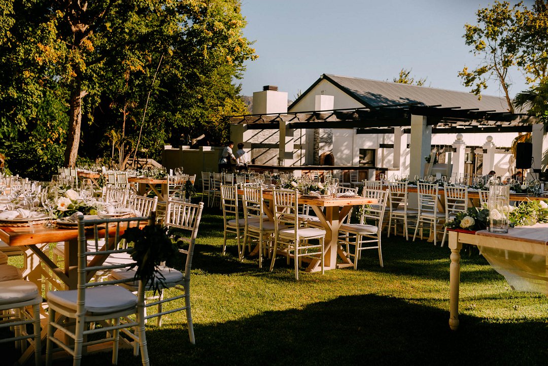 Courtney en Jean se onthaal was buite in die pragtige tuine van die trou venue. Rou hout tafels was op die grasperk opgestel met die tikseltjies groenigheid, wit en aardse kleure wat deel gevorm het van hul trou dekor. ʼn Buitelug troue is altyd mooi, veral as die weer so mooi is soos by die paartjie se troudag. Alles is moontlik as jy ʼn fanatiese span trou diensverskaffers het. Mooi Troue se Trougids word deur honderde bruide jaarliks gebruik om trou diensverskaffers te vind vir hul troudag.