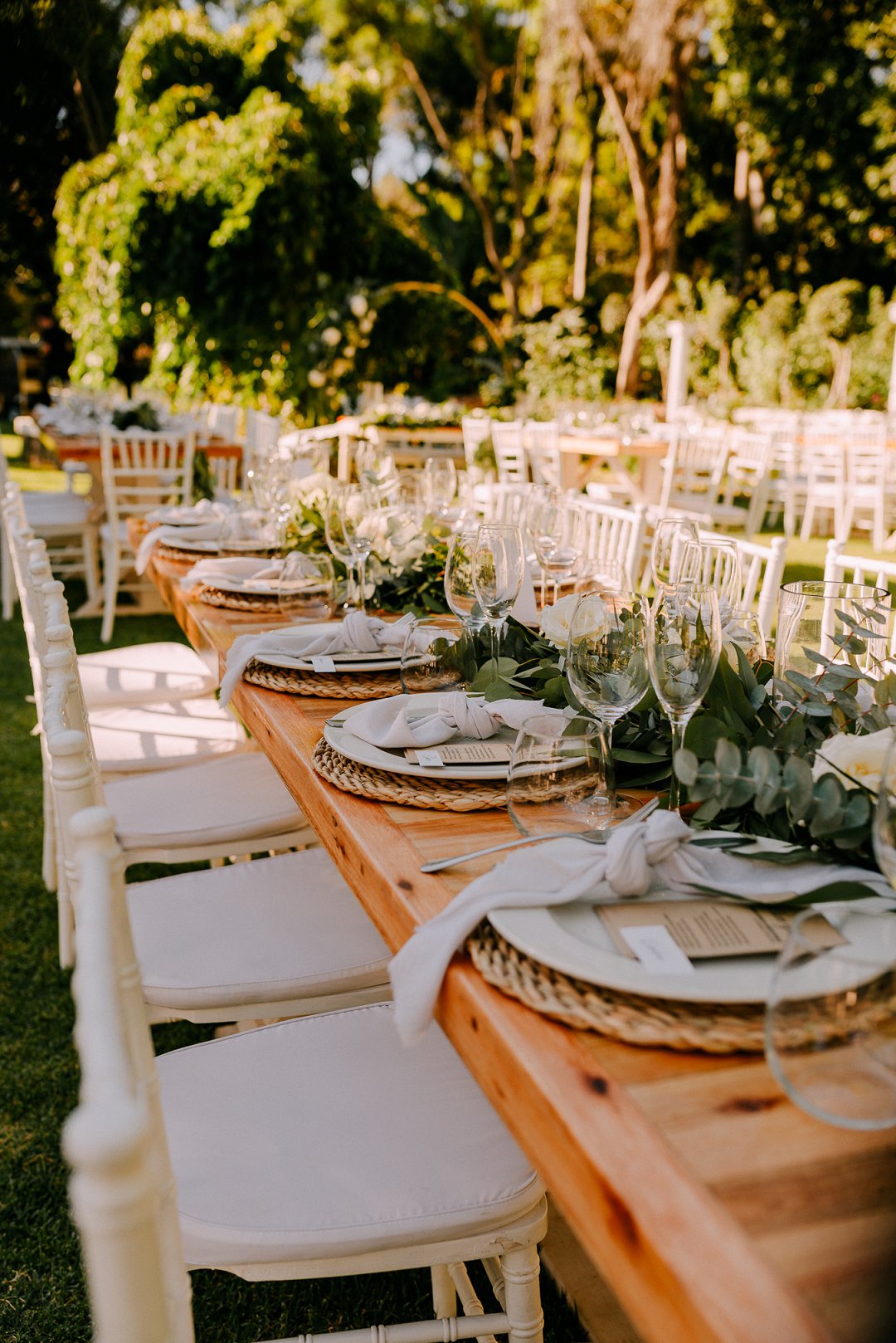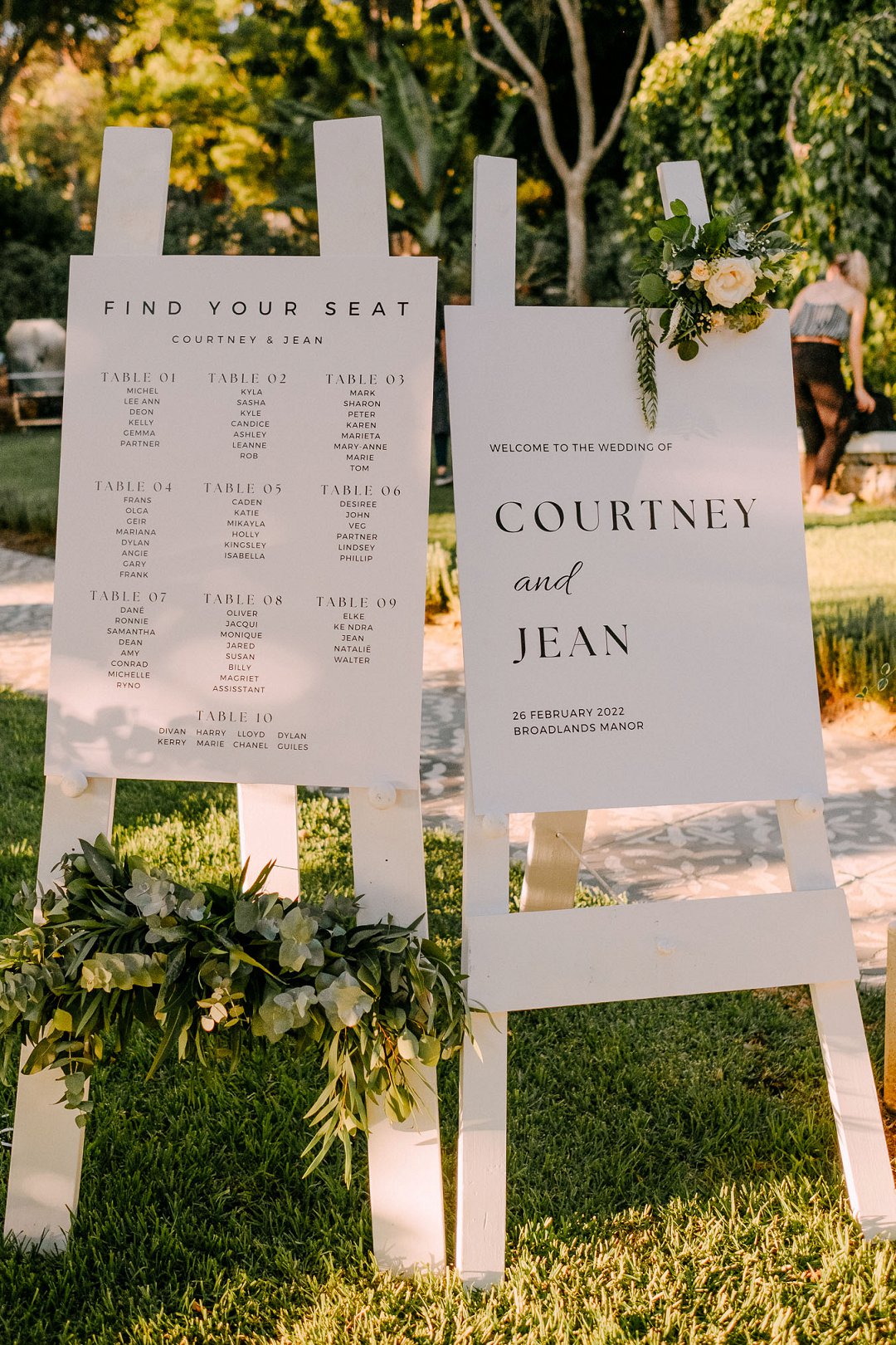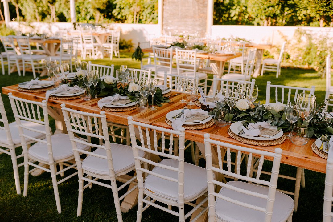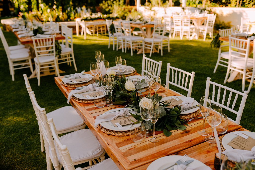 Courtney en Jean se onthaal was buite in die pragtige tuine van die trou venue. Rou hout tafels was op die grasperk opgestel met die tikseltjies groenigheid, wit en aardse kleure wat deel gevorm het van hul trou dekor. ʼn Buitelug troue is altyd mooi, veral as die weer so mooi is soos by die paartjie se troudag. Alles is moontlik as jy ʼn fanatiese span trou diensverskaffers het. Mooi Troue se Trougids word deur honderde bruide jaarliks gebruik om trou diensverskaffers te vind vir hul troudag.