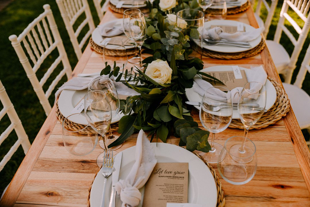 Die trou dekor wat ons gekies het was simplisties. Ons het baie natuurlike en vars kleure ingewerk om ʼn sagte en ontspanne atmosfeer te skep wat steeds elegansie toon. Enigiets groen, wit en bruin.