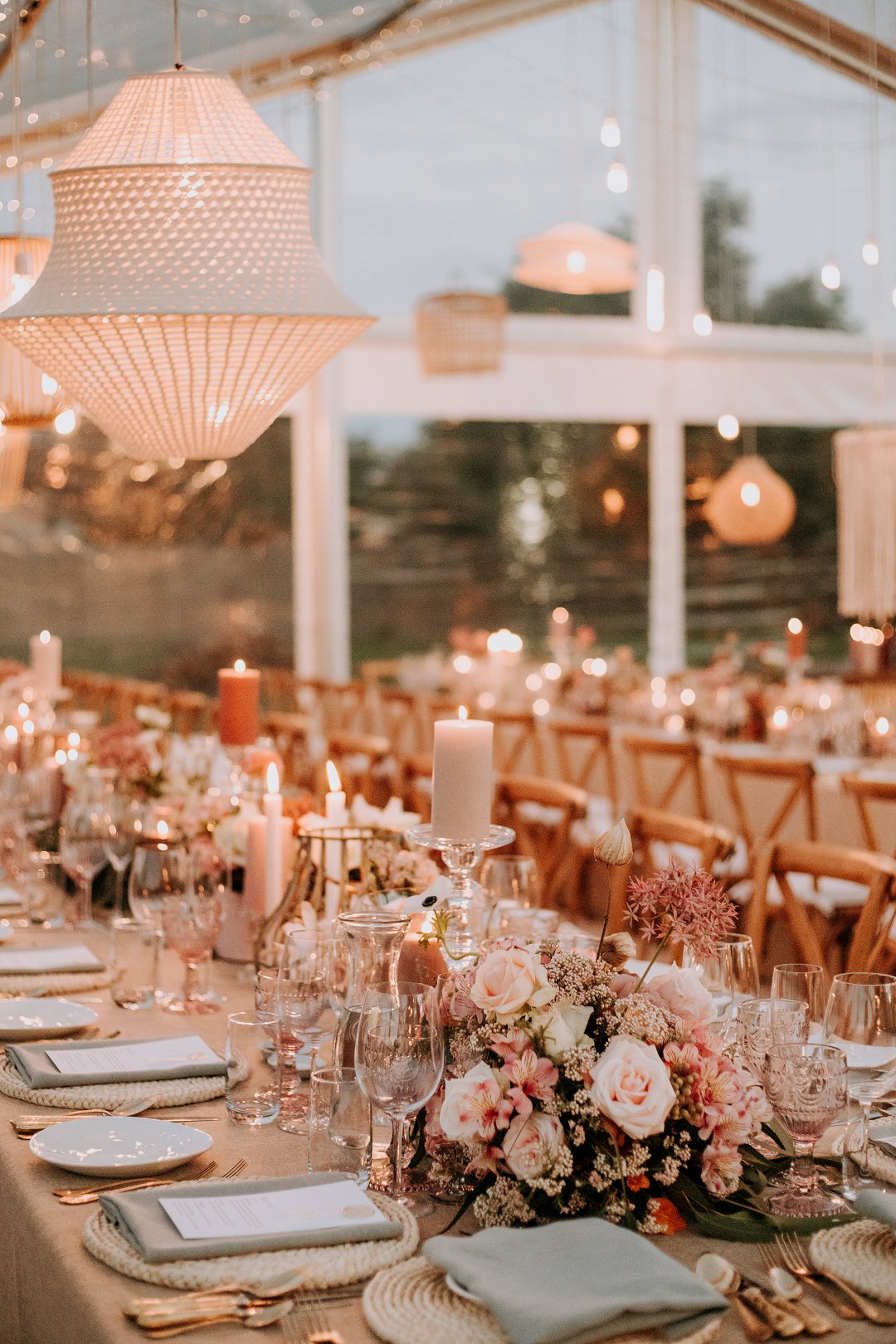 Die onthaal lokaal was ʼn glaskas tent omring deur die versorgde tuin gedurende die Lente. Hulle het vir ʼn Mediterreense tema gegaan met kleurskema en trou dekor. Met meer as 900 kerse, kan jy verseker wees dit ʼn prentjie mooi atmosfeer geskep het. Ligte skakerings van aarde kleure, pienke met tikseltjies goud en wit elemente tussen in, so besonders! Die groenigheid van die pragtige muurpapier trek onmiddellik jou aandag as jy die onthaal lokaal binnekom. Die sagte sandkleur tafeldoeke, fyn blom ontwerpe en groenigheid wat vanuit die dak hang bo die tafels is so mooi. Alles het net so mooi bymekaar gekom en die verskillende ligte wat deur die hele glaskas venue hang, skep ʼn romantiese atmosfeer.
