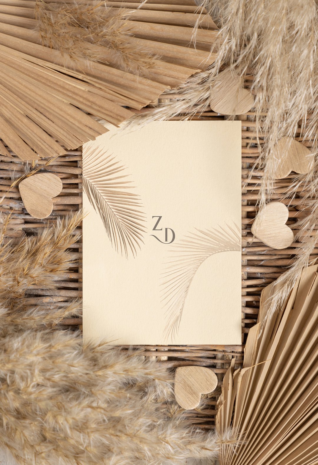 Dit werk perfek saam met die boheemse styl tema waar die uitgedroogde blom ontwerpe gebruik word. Hierdie spesifieke trou skryfbehoeftes stel se sagte kleurpalet en die uitgedroogde blom tema was perfek bymekaar. Gebruik van skakerings van aardse kleure en die uitgedroogde palmboom blare wat op die skryfbehoeftes gebruik word is só mooi.