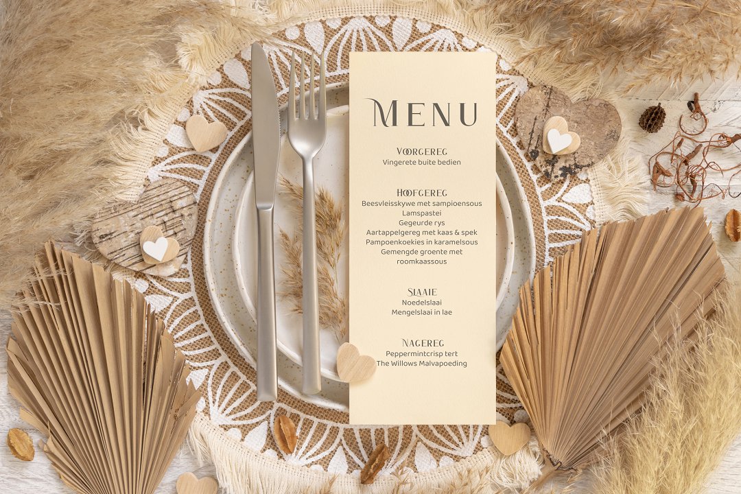 Die trou uitnodiging is een van die eerste indrukke wat jou gaste van jou troue sal kry. Wanneer gaste die venue binnekom, is die eerste dinge waarna hulle soek die sitplek kaartjie, asook die naamkaartjies op die tafels. Wanneer jou gaste by hul sitplek sit, is almal gewoonlik nuuskierig om te weet wat hulle gaan eet. Dus sal die spyskaart op die tafel ook deel wees van jou gaste se eerste indruk van die onthaal.