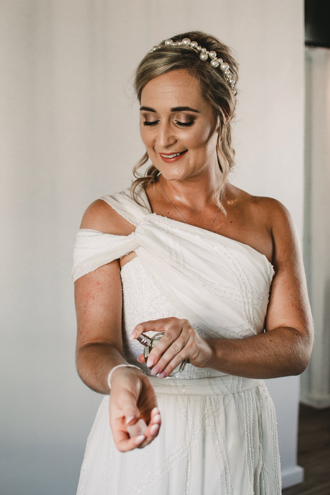 My trourok is spesifiek ontwerp rondom my pêrel kopband. Die rok was elegant genoeg om ʼn trourok te wees, maar afgerond om by die strand trou tema te pas. Die klein besonderhede (klein pêrelagtige kraletjies) op die rok het die pêrel kopband en oorbelle gekomplimenteer. Ek het geweet wat ek wou hê en my rok ontwerper het dit alles laat gebeur.