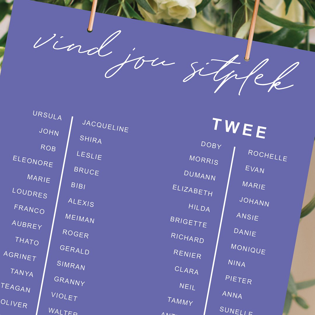 Hierdie skryfbehoefte ontwerp in perfek vir die paartjies wat opsoek is na ʼn meer simplistiese ontwerp vir hul welkombord en sitplekplan. Hierdie A1 grootte verwelkomings bord en bypassende A1 grootte sitplekplan is simplisties ontwerp in twee kleurskakerings van Veri Peri en Wit. Dit is ʼn moderne ontwerp vir paartjies wat hou daarvan om die nuutste tendense te volg.