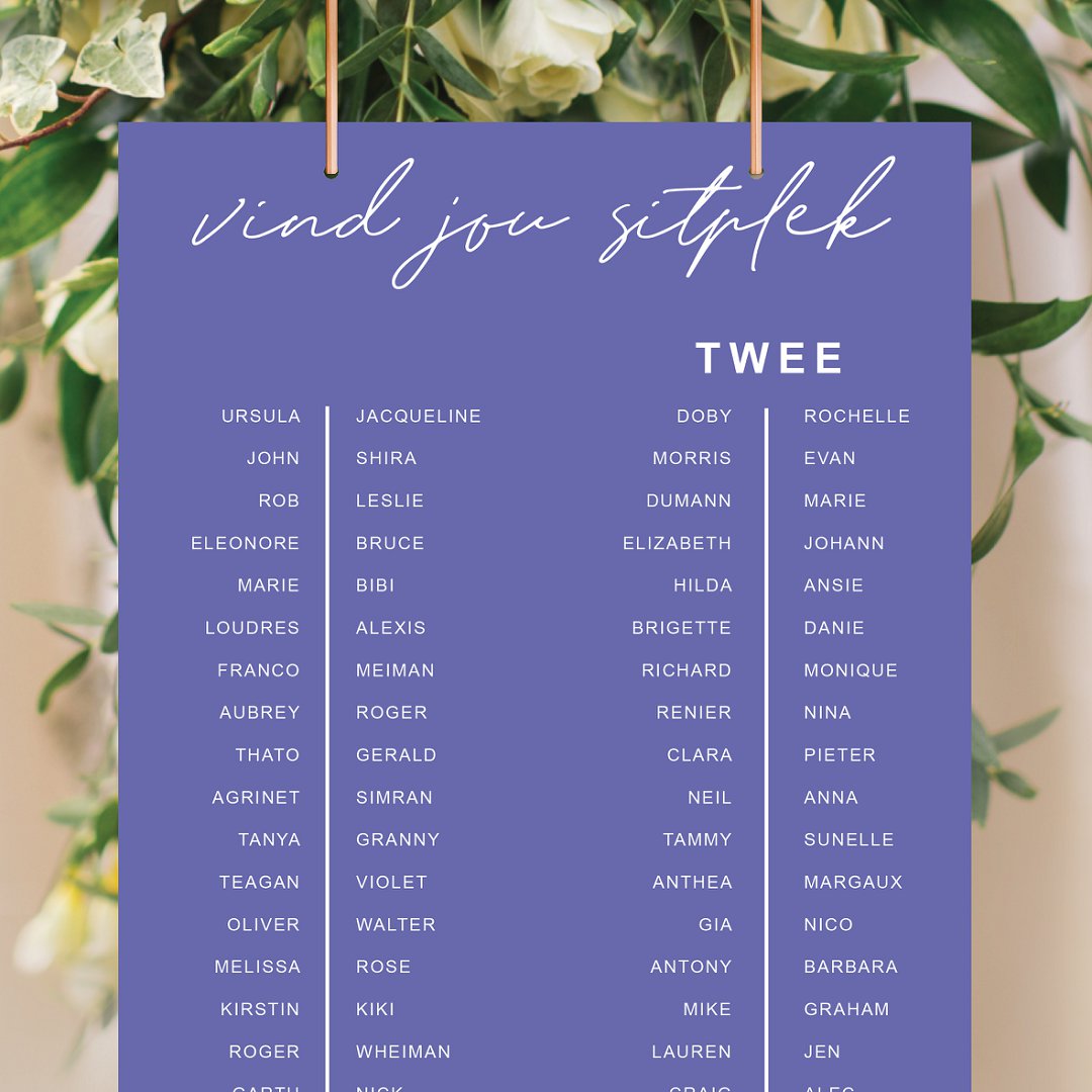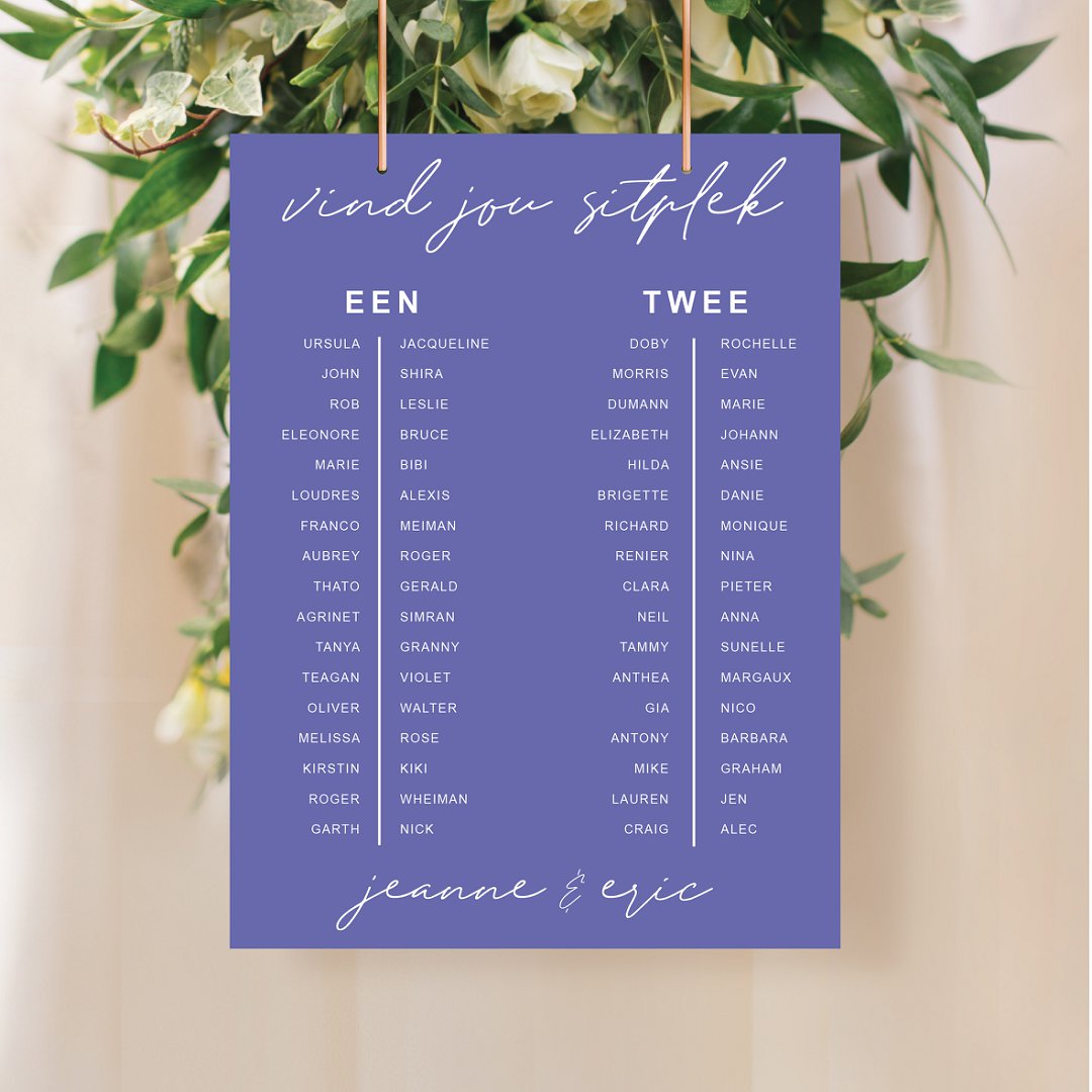 Hierdie skryfbehoefte ontwerp in perfek vir die paartjies wat opsoek is na ʼn meer simplistiese ontwerp vir hul welkombord en sitplekplan. Hierdie A1 grootte verwelkomings bord en bypassende A1 grootte sitplekplan is simplisties ontwerp in twee kleurskakerings van Veri Peri en Wit. Dit is ʼn moderne ontwerp vir paartjies wat hou daarvan om die nuutste tendense te volg.