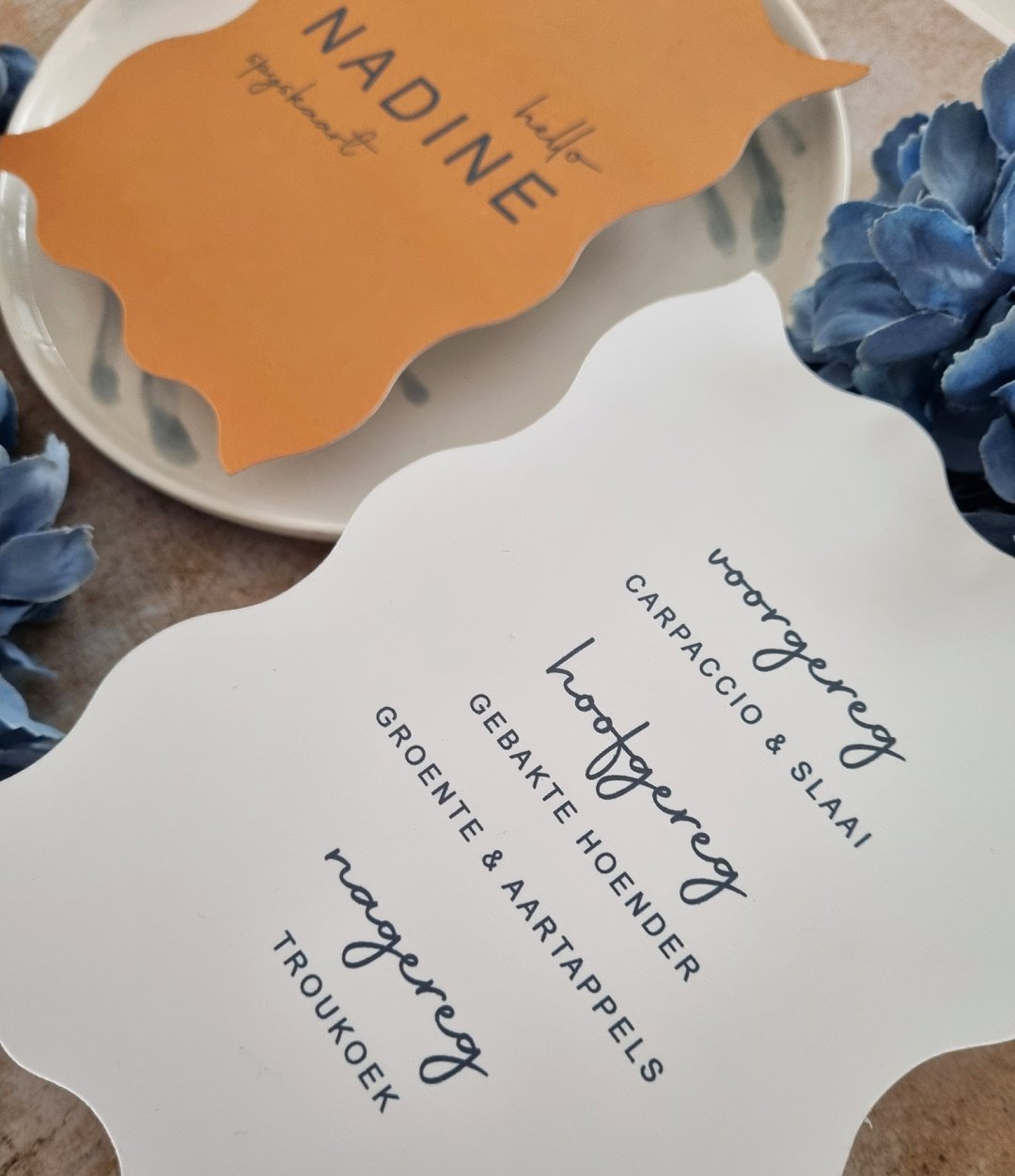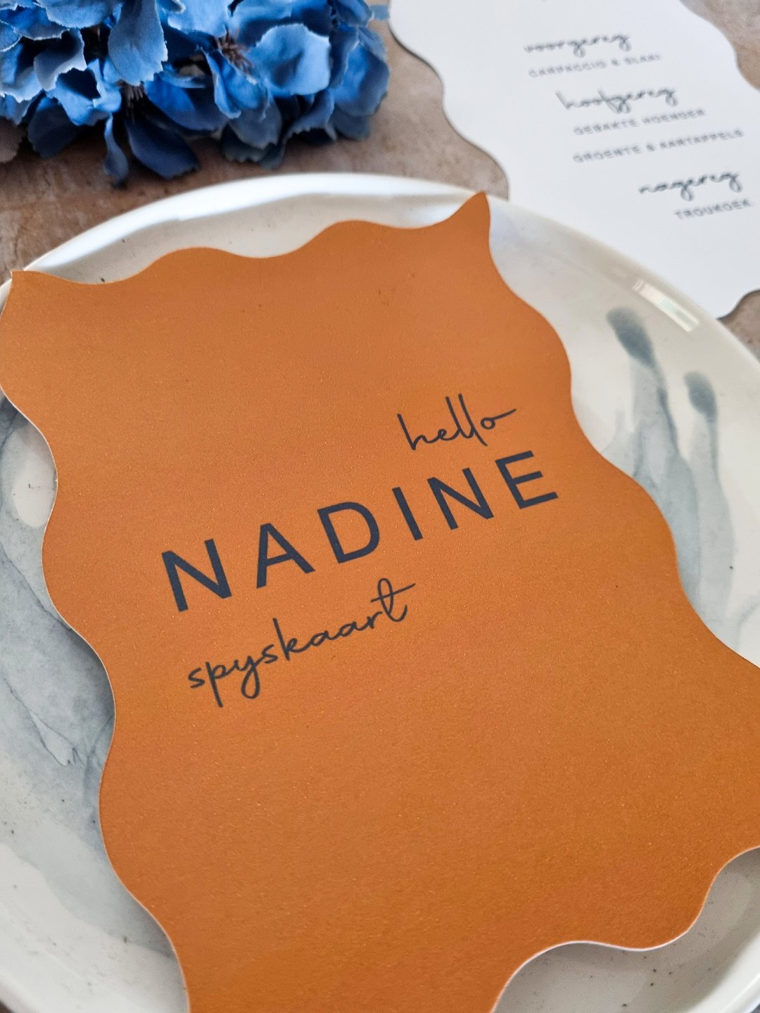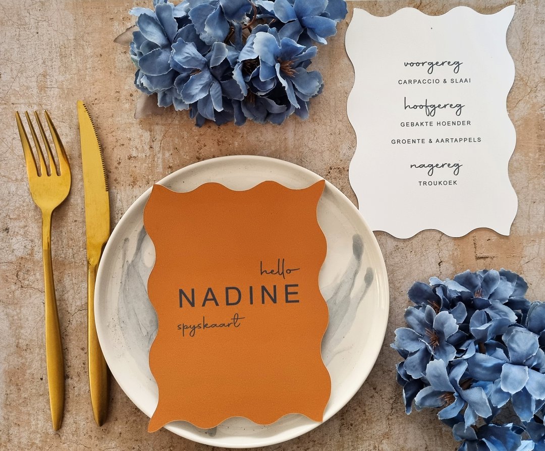 In die inskrywing nou op Mooi Troues deel ons ʼn Oranje en Blou spyskaart vir jul troudag. Hierdie moderne spyskaart vir jou troue is ontwerp deur die talentvolle trou skryfbehoefte ontwerper, Invitation Café. Dit is nie heeltemal oranje nie, maar meer ʼn gebrande oranje en donker blou en dié kleure komplimenteer mekaar perfek. Die ontwerp is ʼn A6 grootte plek kaartjies en spyskaart wat aan albei kante gedruk is.