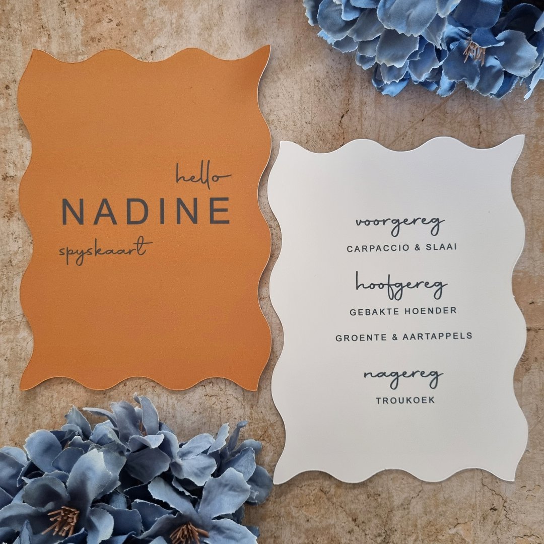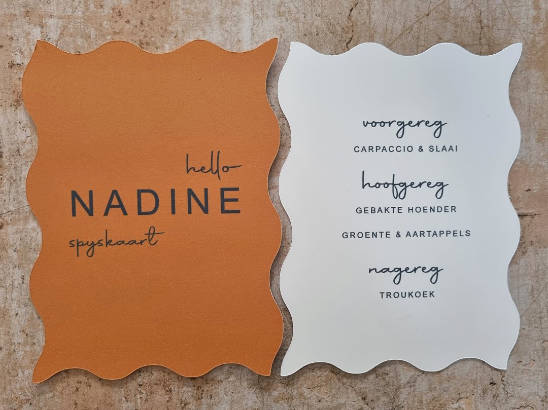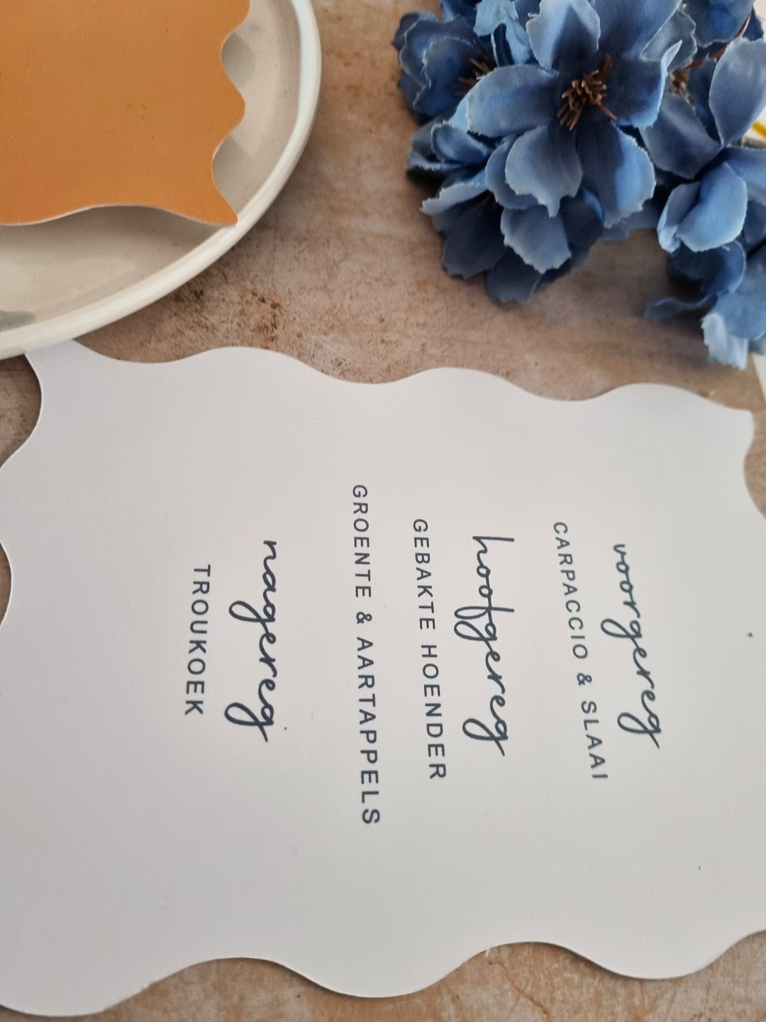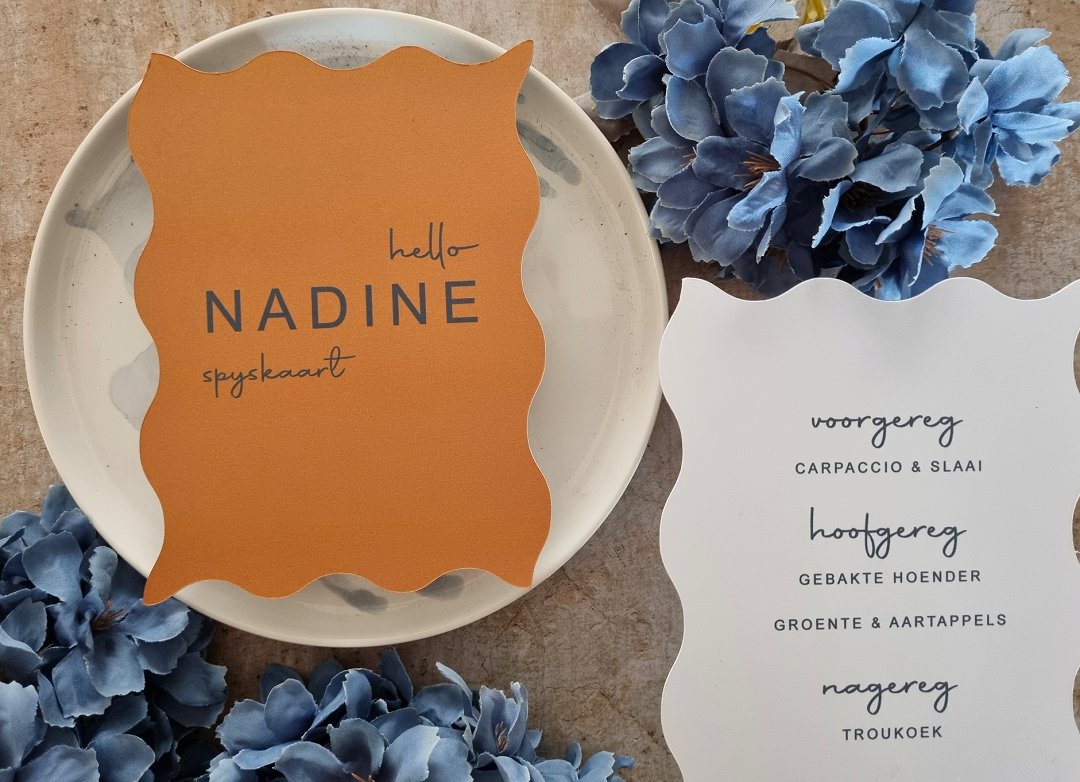 Die trou uitnodiging is een van die eerste indrukke wat jou gaste van jou troue sal kry. Wanneer gaste die venue binnekom, is die eerste dinge waarna hulle soek die sitplek kaartjie, asook die naamkaartjies op die tafels. Wanneer jou gaste by hul sitplek sit, is almal gewoonlik nuuskierig om te weet wat hulle gaan eet. Dus sal die spyskaart op die tafel ook deel wees van jou gaste se eerste indruk van die onthaal.