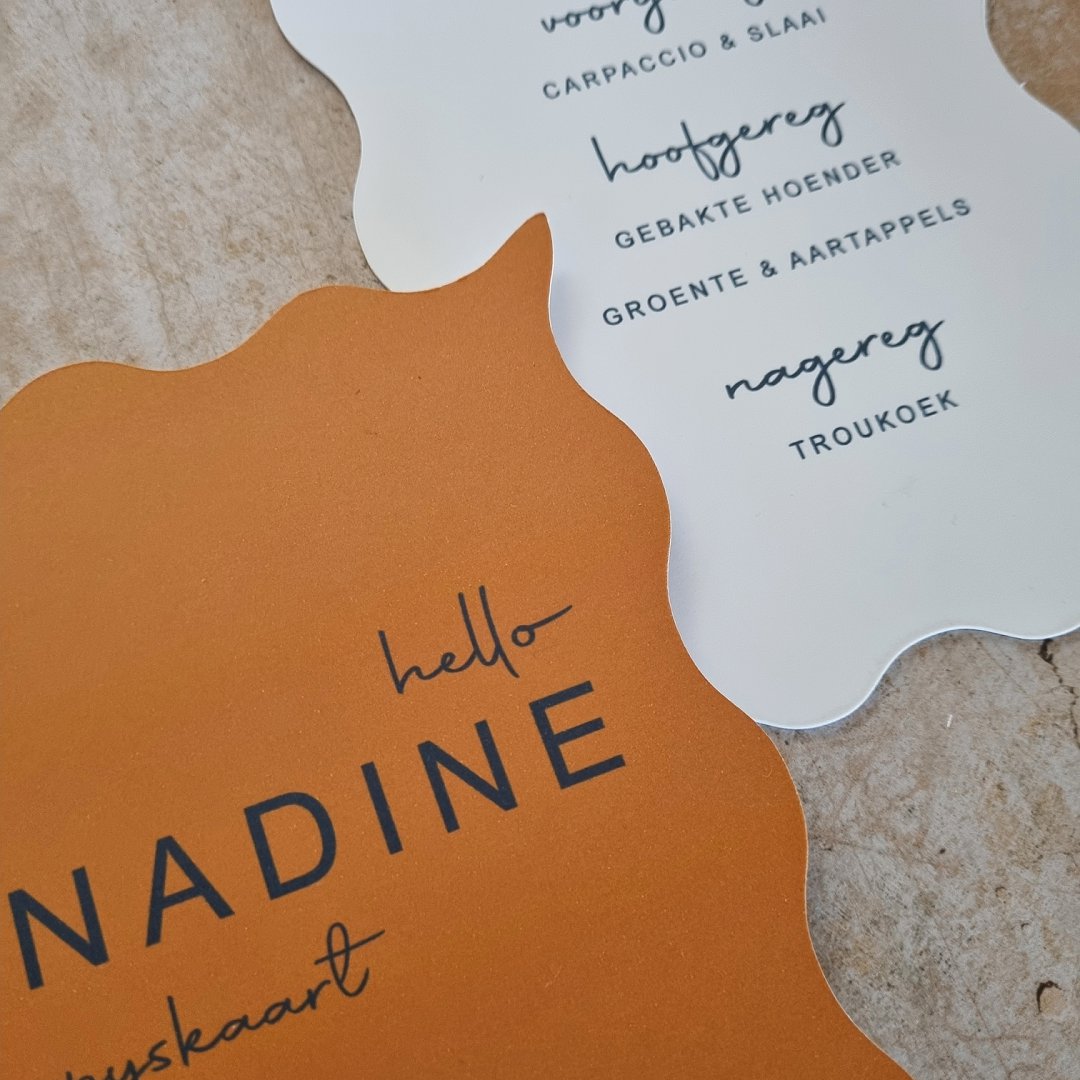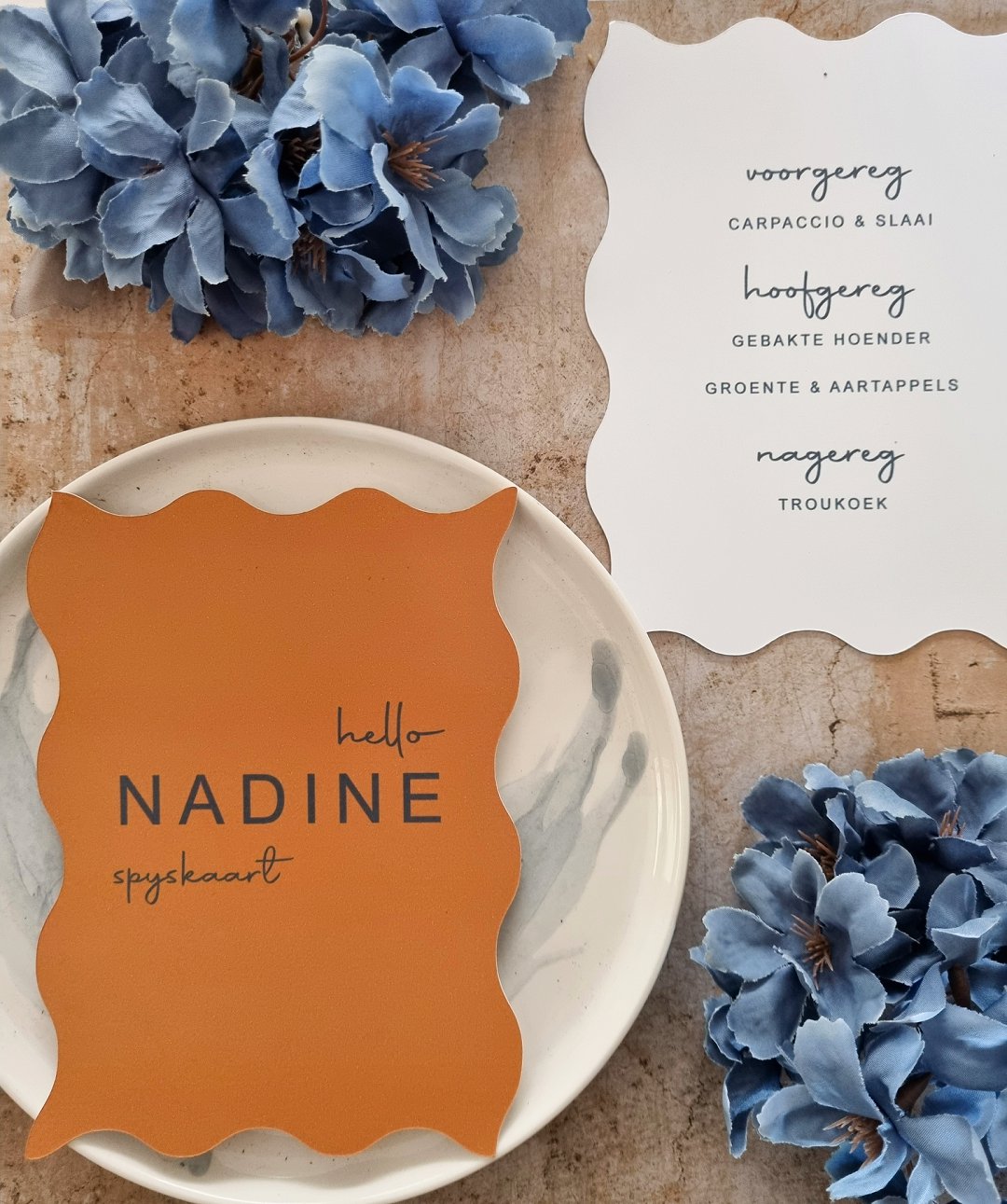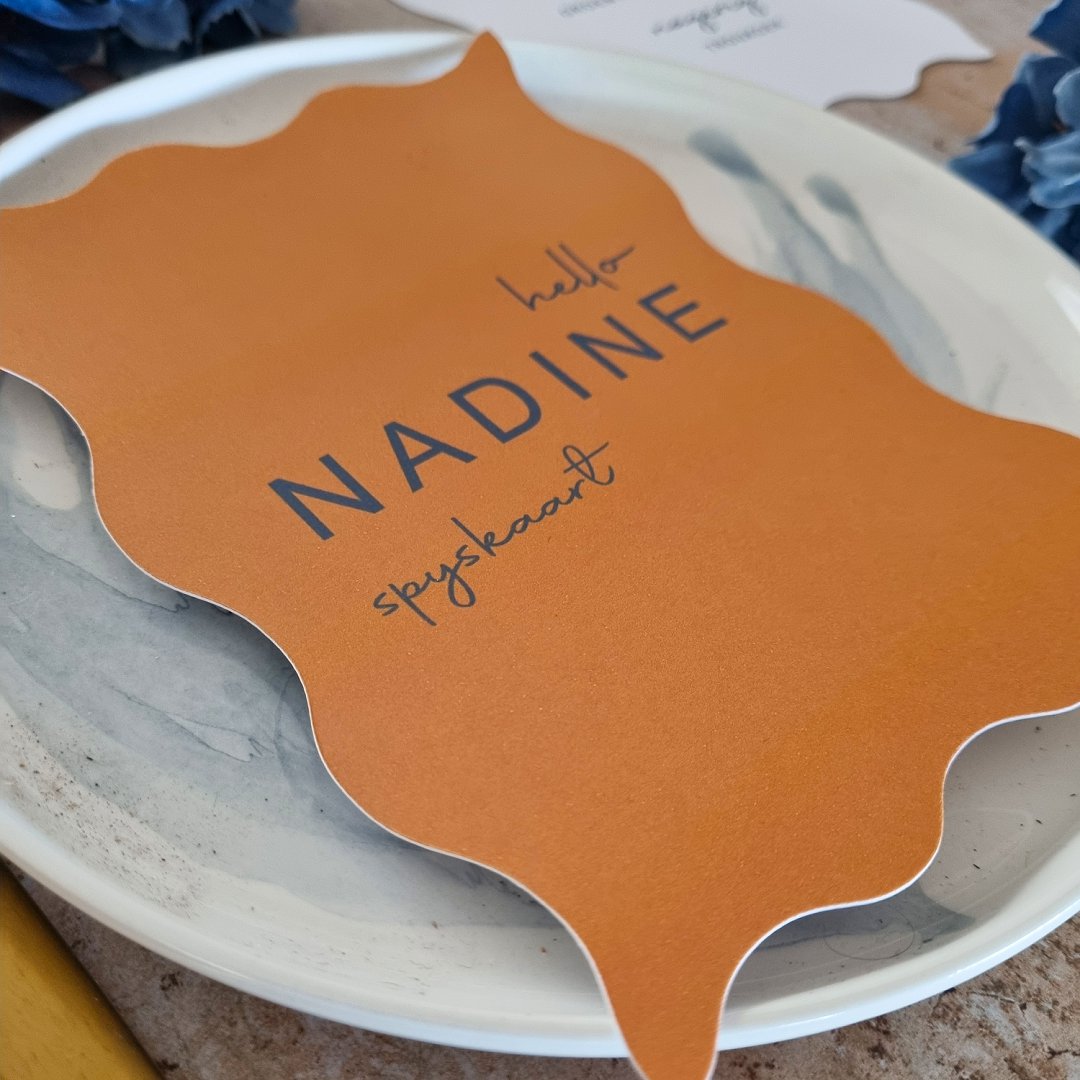 In die inskrywing nou op Mooi Troues deel ons ʼn Oranje en Blou spyskaart vir jul troudag. Hierdie moderne spyskaart vir jou troue is ontwerp deur die talentvolle trou skryfbehoefte ontwerper, Invitation Café. Dit is nie heeltemal oranje nie, maar meer ʼn gebrande oranje en donker blou en dié kleure komplimenteer mekaar perfek. Die ontwerp is ʼn A6 grootte plek kaartjies en spyskaart wat aan albei kante gedruk is.
