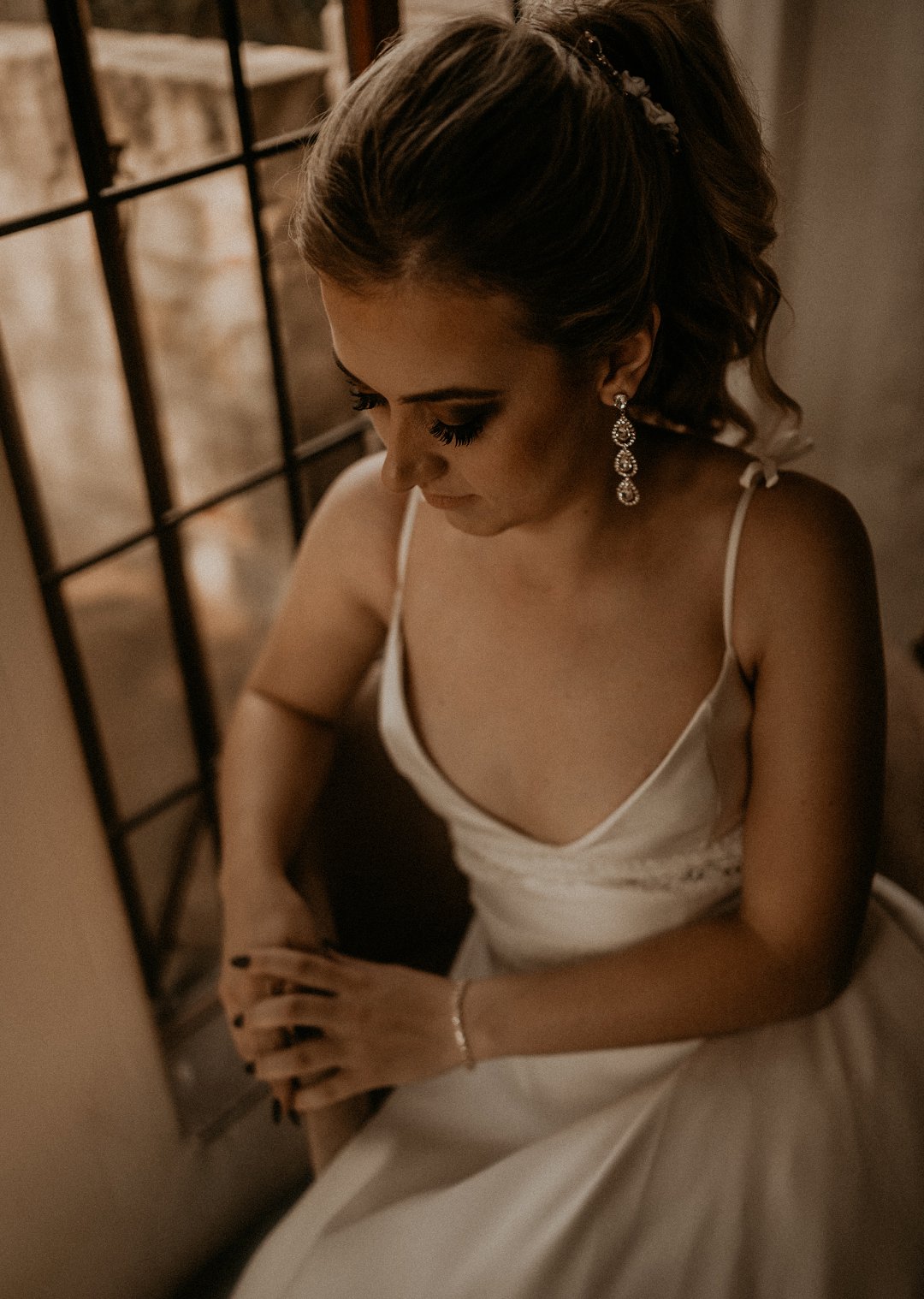 Om alles te kroon, was ʼn idee wat ons baie van gehou het om al ons gaste te vra om swart te dra. Dit was die perfekte agtergrond om ons wit rokke op die dag en in foto’s te beklemtoon. Sanel, van The Floristry Studio, het ons bygestaan met twee botaniese bruidsruikers wat heeltemal van groen gemaak is.