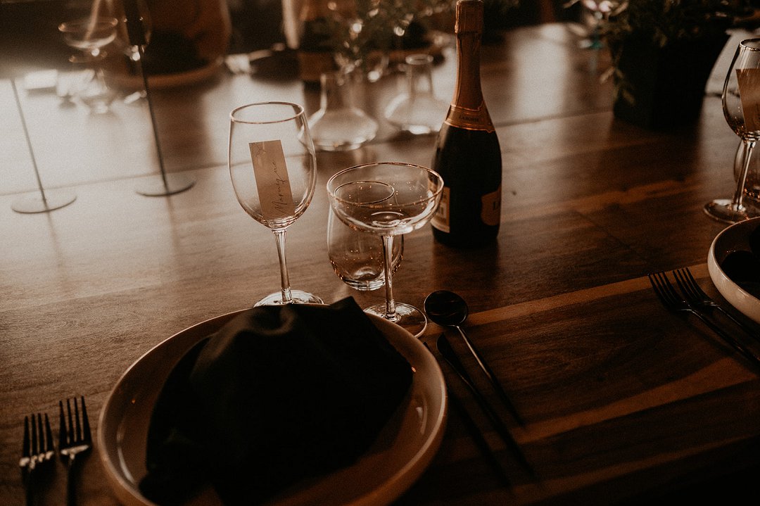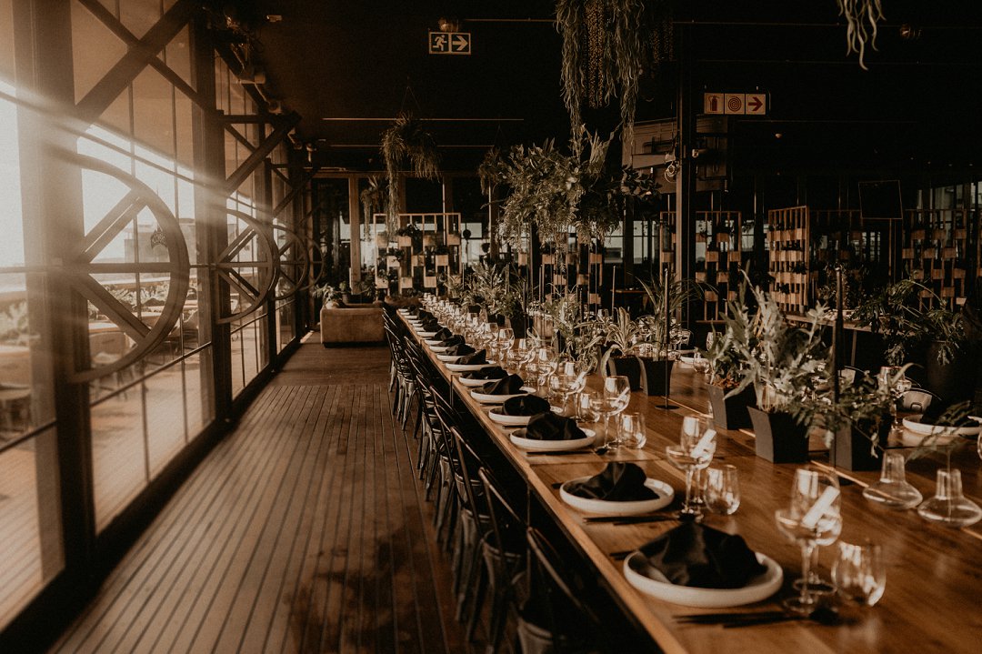 Die bruide het vir ʼn moderne, simplistiese trou dekor styl gegaan en elemente inkorporeer wat getrou is aan hulself. Swart, wit en groen met tikseltjies goud was die kleurskema van die paartjie se trou dekor en het perfek gepas by die moderne dak trou venue. Die kristalglase met goue rante bied weer daardie elegansie aan die paartjie se trou dekor. Die lang maer kerse op die tafels skep weer ʼn baie gesellige en warm atmosfeer in kontras met die industriële afwerkings van die trou venue.