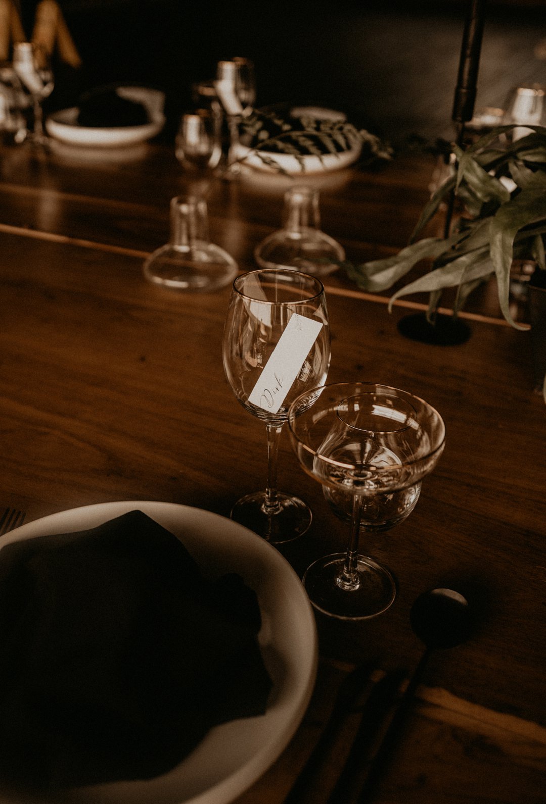Lee-Anne en Sanel het ʼn dramatiese, dog minimalistiese moderne atmosfeer geskep wat gepaard gaan met die groenigheid van die plante. Ons kleurskema was swart, wit en groen saam met ʼn paar goue afwerkings. Ons het een lang tafel gehad – ons wou hê al ons gaste moet ons omring op ons gelukkige dag en dit was perfek gedek! Die tafel was gedek met wit Nordiese onderborde, swart linne servette en swart maan eetgerei. Kristalglase met ʼn goue rand is gebruik. Om die atmosfeer te gee is swart kandelaars met swart kerse op die tafel geplaas.