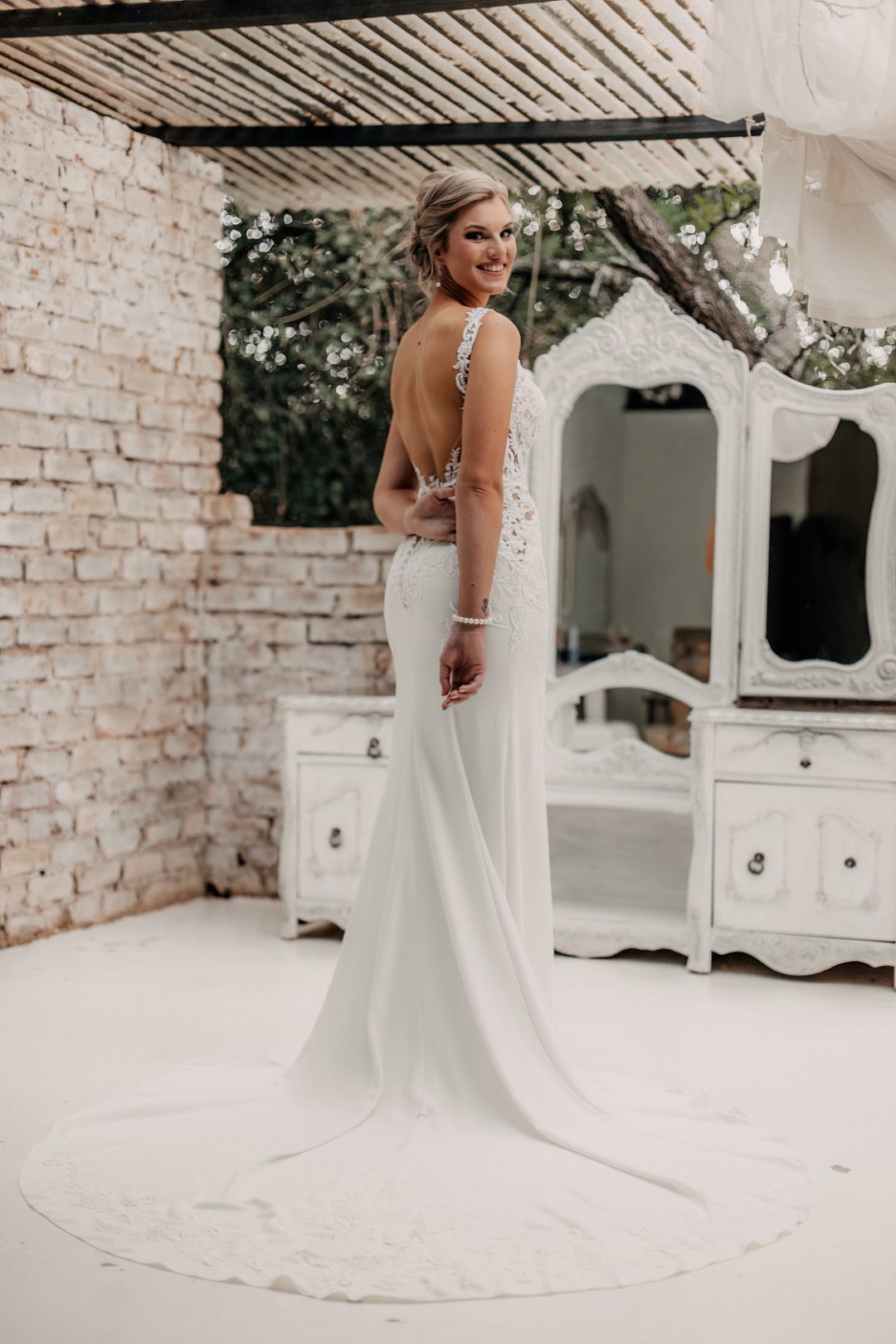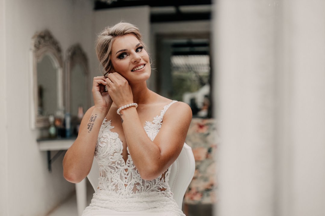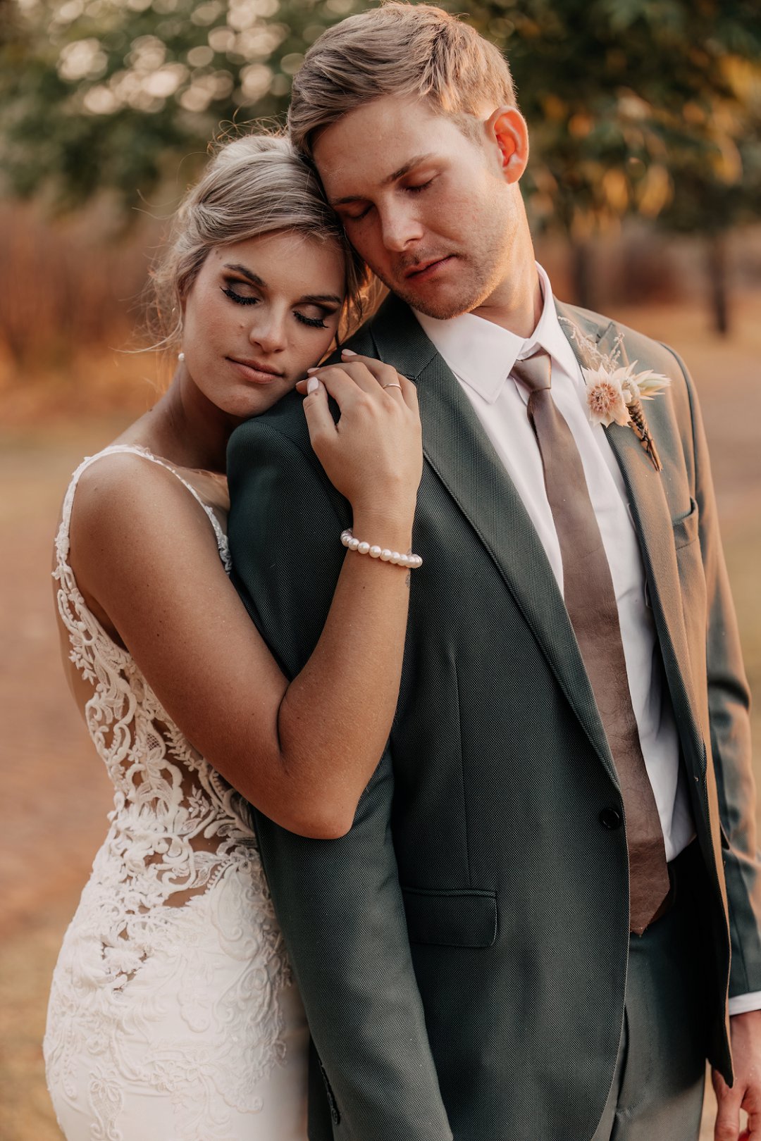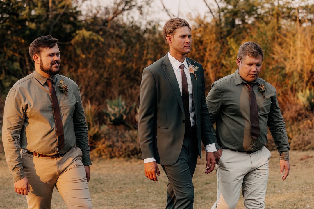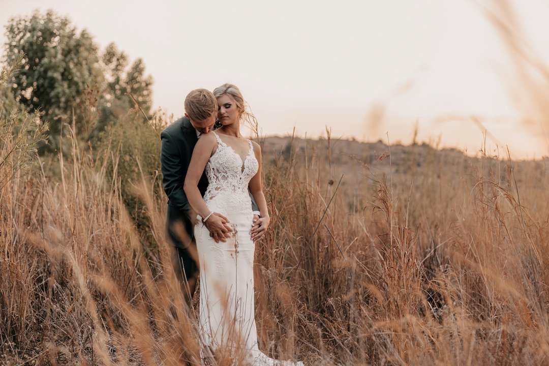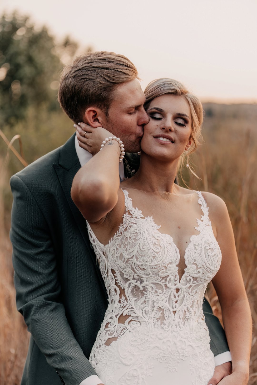 Erich het ʼn eenvoudige grys troupak aangehad met ʼn bruin leer das en bruin skoene. Dit is altyd ʼn wen kleur kombinasie vir bruidegomme. Ons is dol verlief op Gerhaldine se mooi trourok. Die fyn detail langs die kante en bokant van haar trourok se bors is besonders mooi.