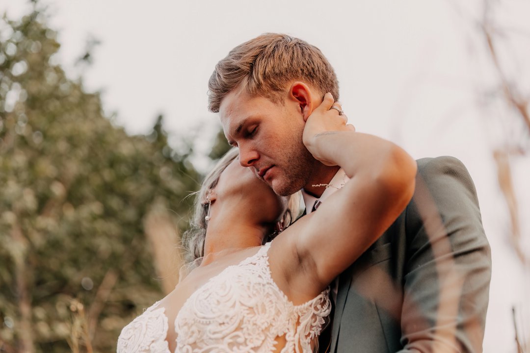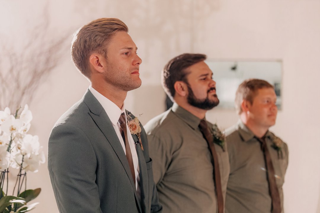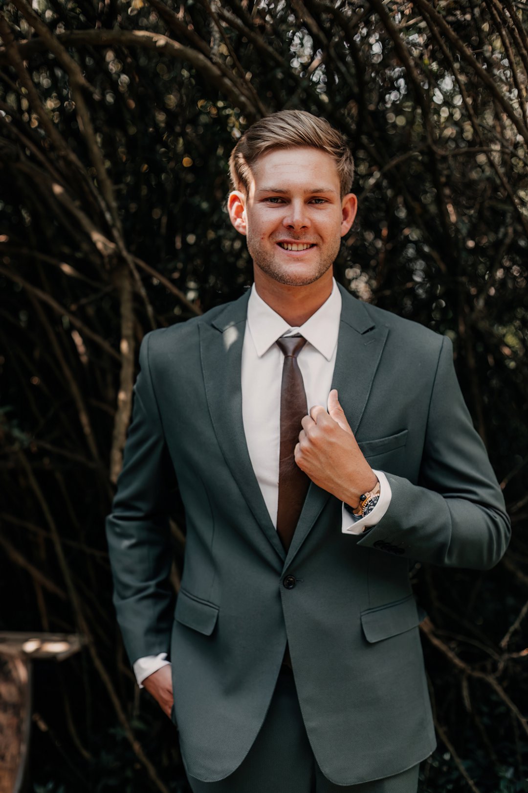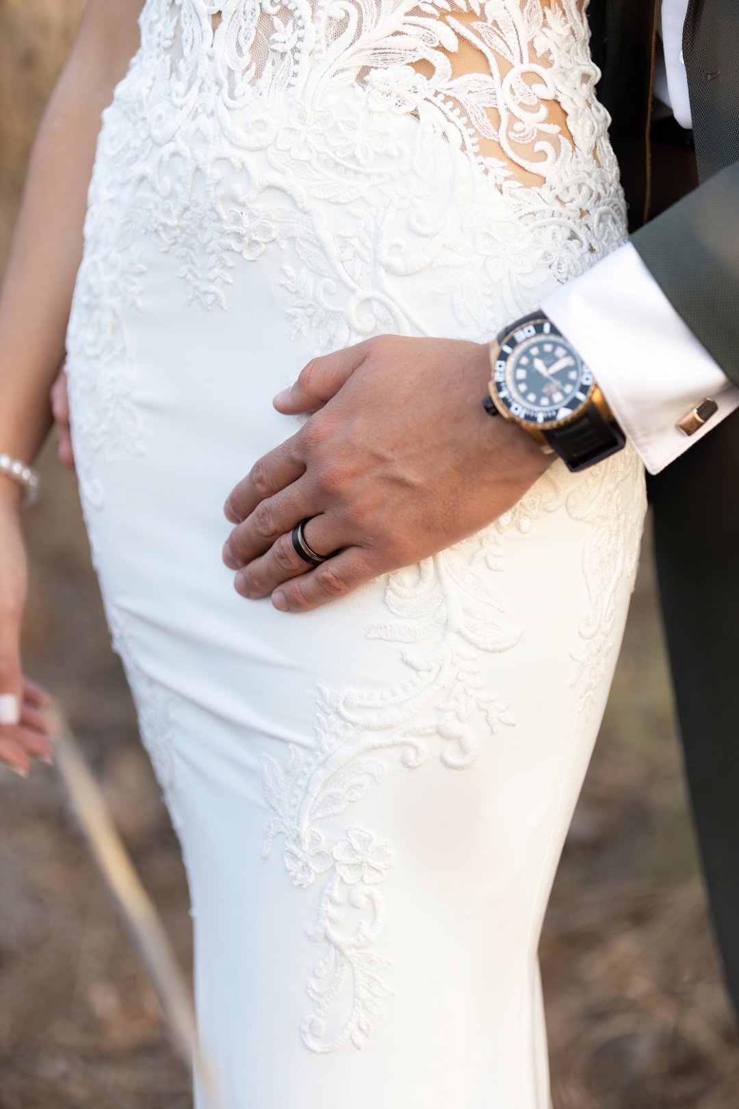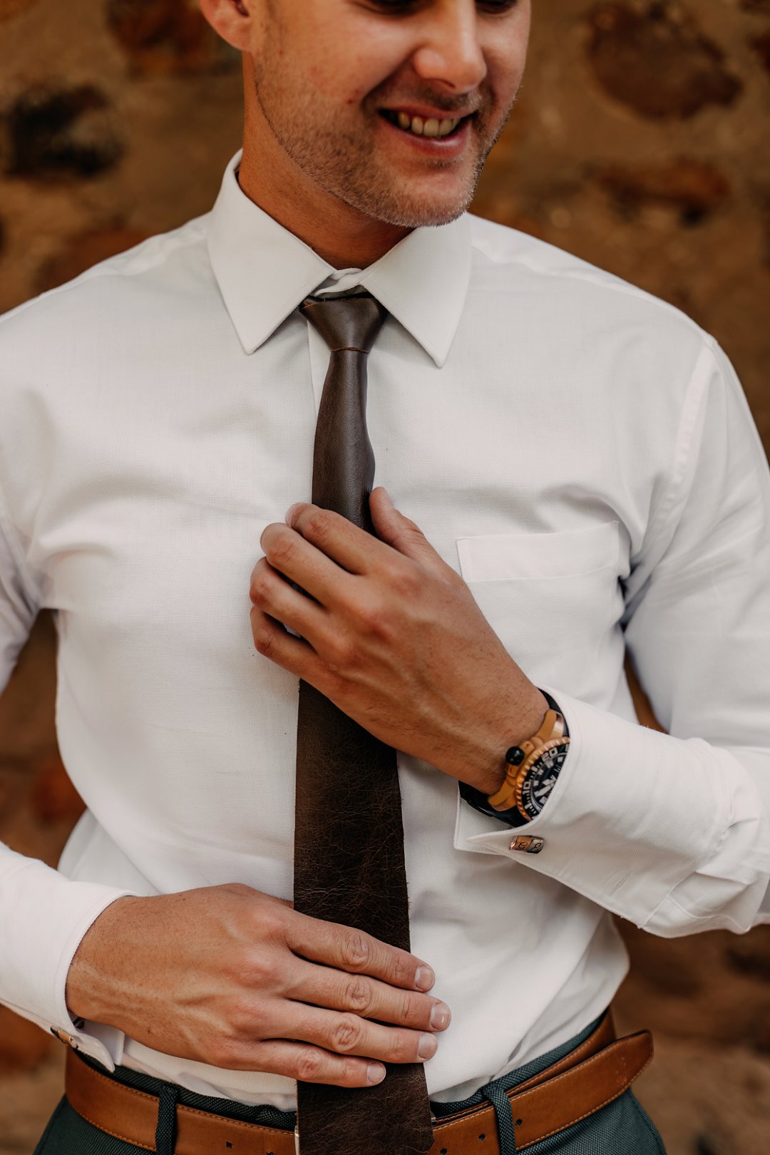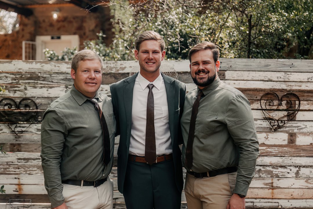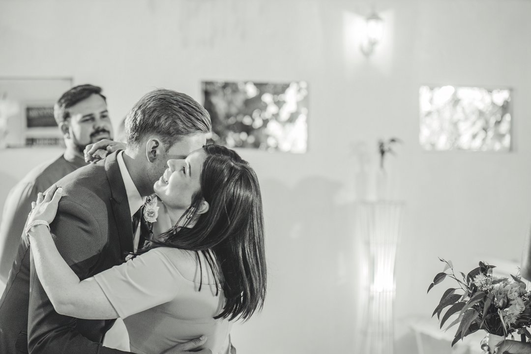 Erich het ʼn eenvoudige grys troupak aangehad met ʼn bruin leer das en bruin skoene. Dit is altyd ʼn wen kleur kombinasie vir bruidegomme. Ons is dol verlief op Gerhaldine se mooi trourok. Die fyn detail langs die kante en bokant van haar trourok se bors is besonders mooi.