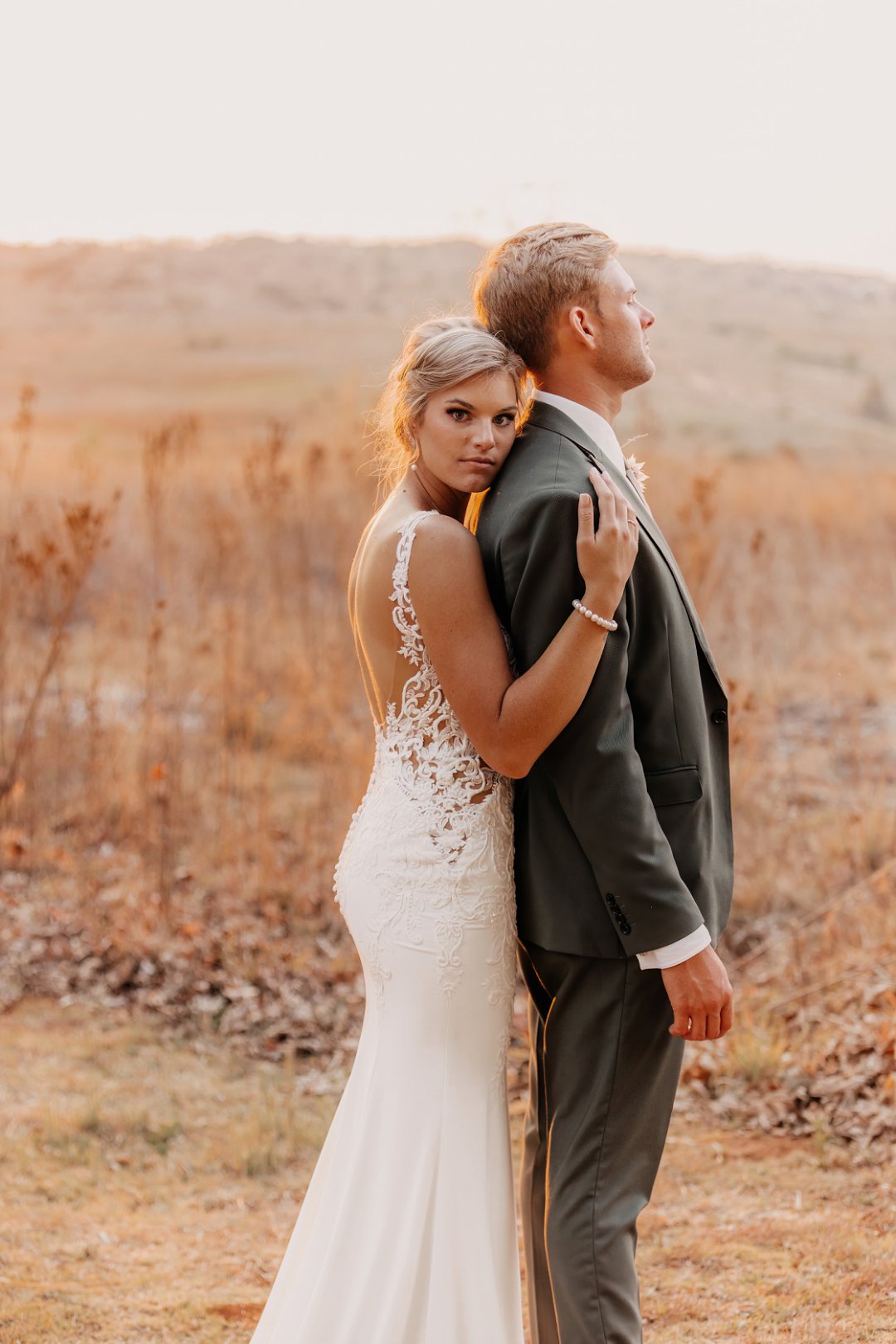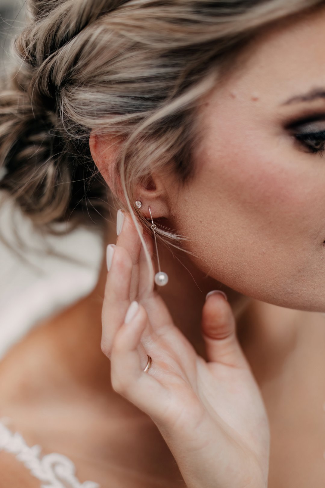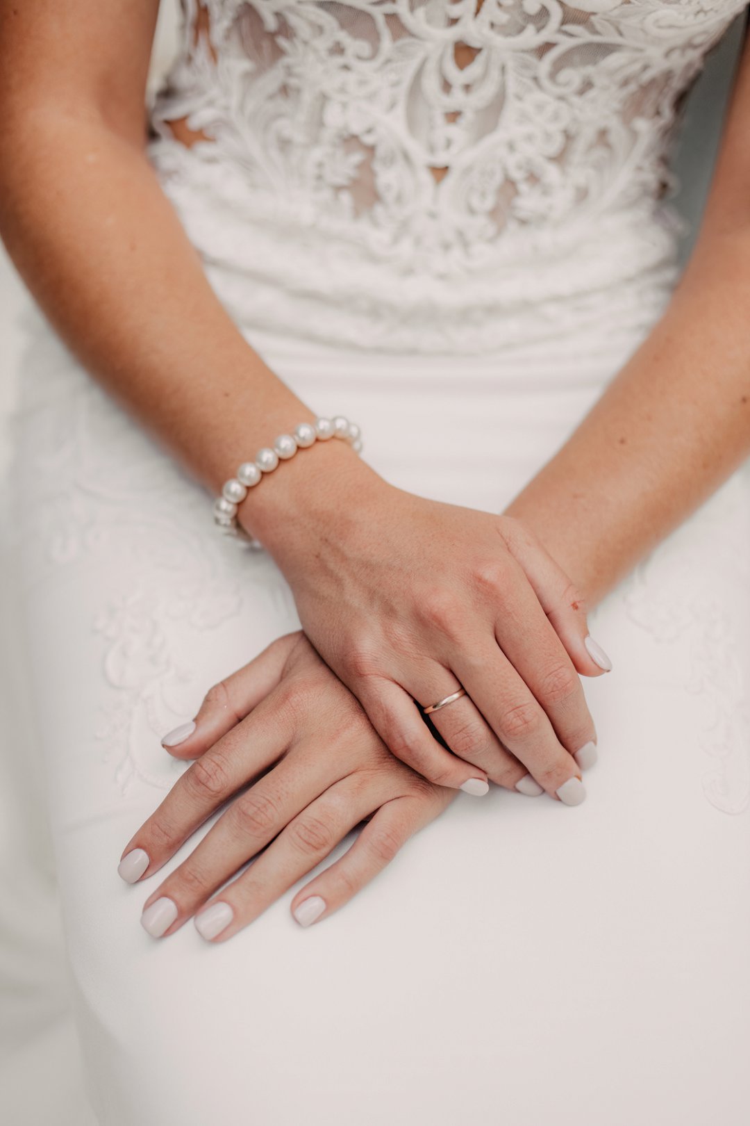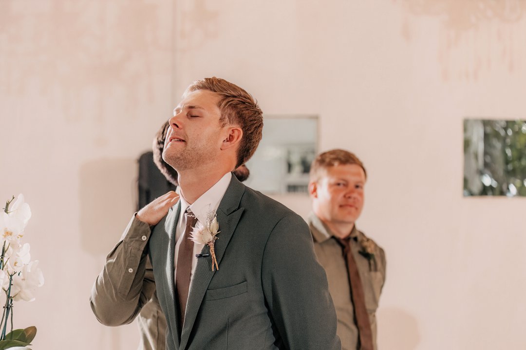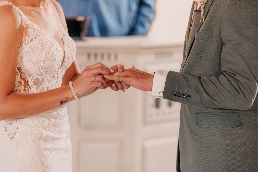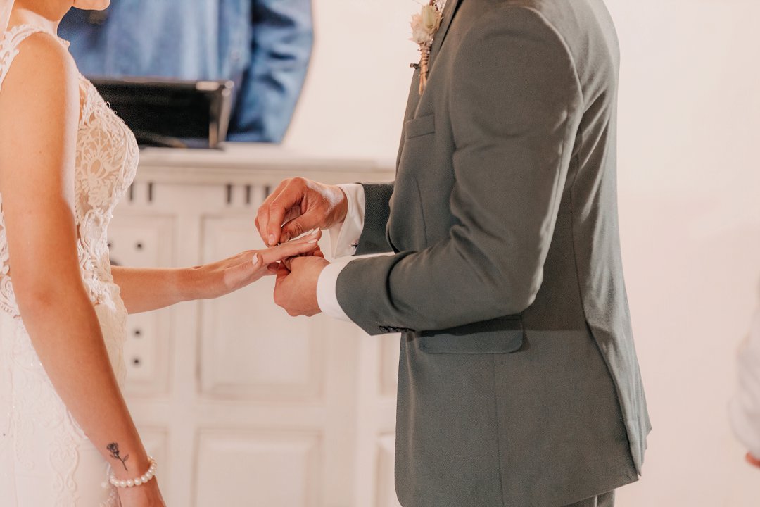 Erich het ʼn eenvoudige grys troupak aangehad met ʼn bruin leer das en bruin skoene. Dit is altyd ʼn wen kleur kombinasie vir bruidegomme. Ons is dol verlief op Gerhaldine se mooi trourok. Die fyn detail langs die kante en bokant van haar trourok se bors is besonders mooi.