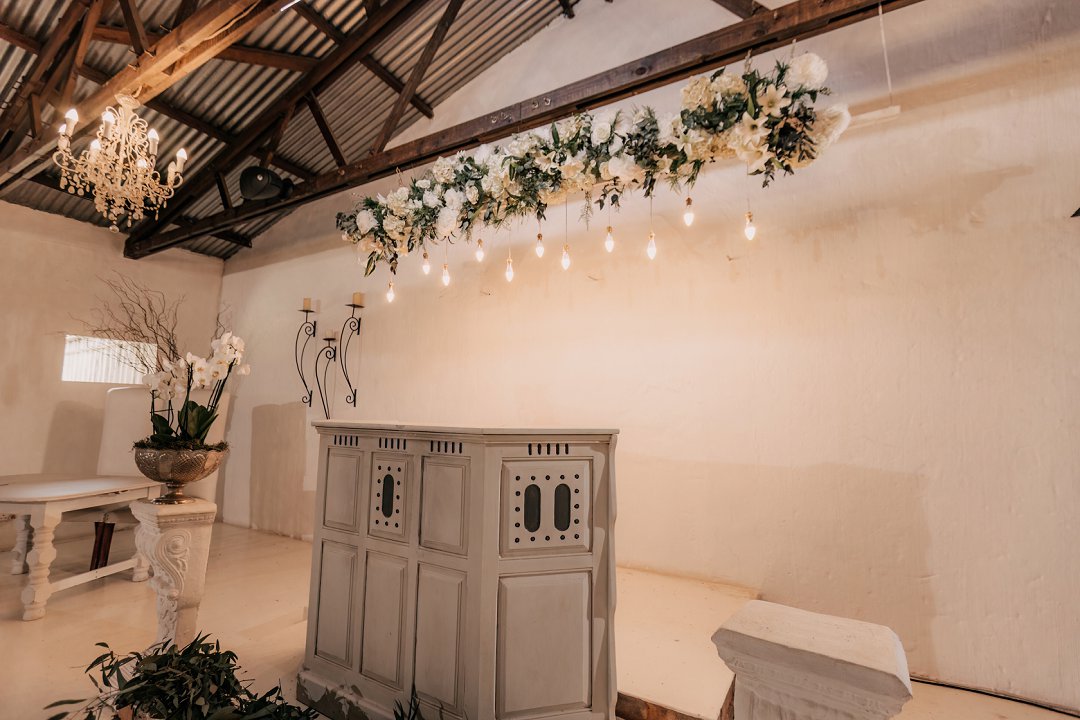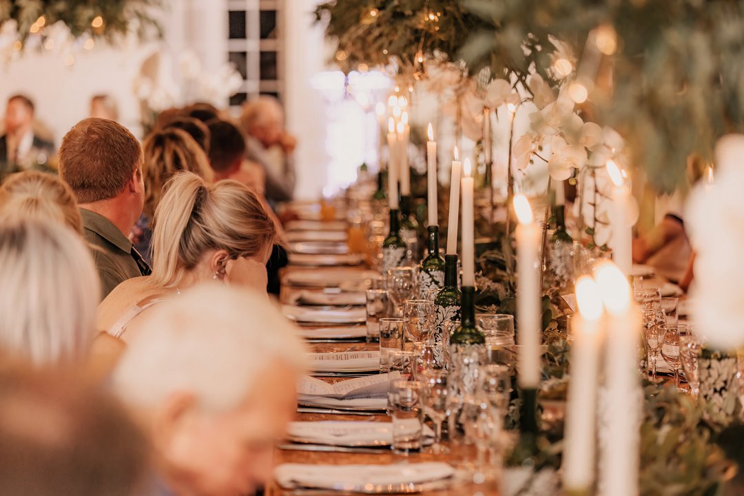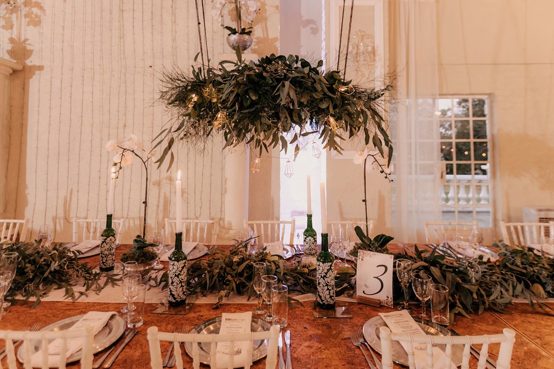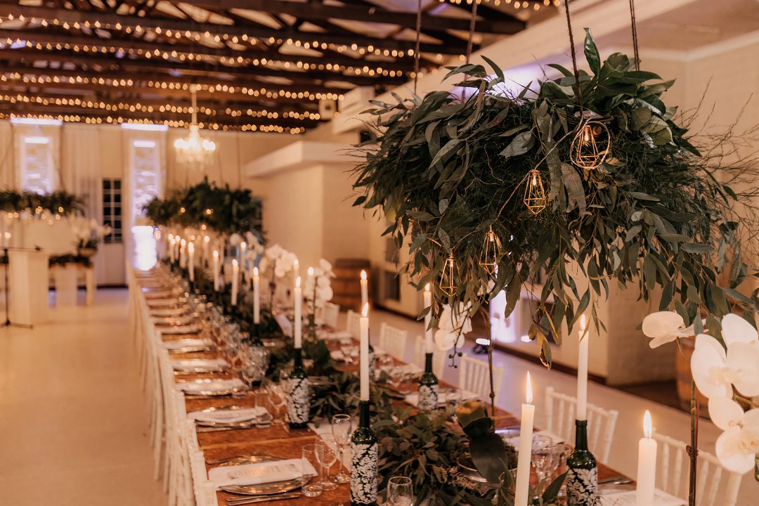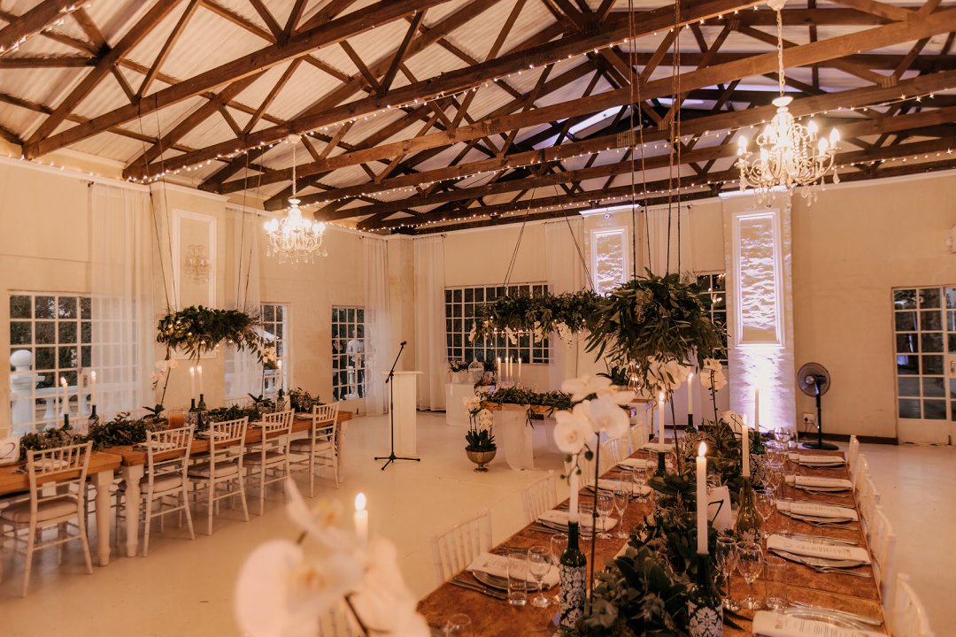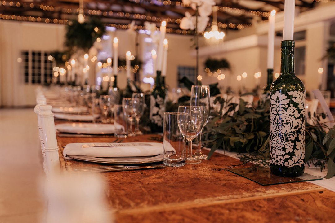 Daar was twee lang tafels met groenigheid op en tikseltjies wit tussen die blom ontwerpe. Ou wynbottels was herwin en gebruik as kersstaanders op die paartjie se tafels. Die dekor elemente was eenvoudig gehou om dit ʼn meer klassieke gevoel te gee.