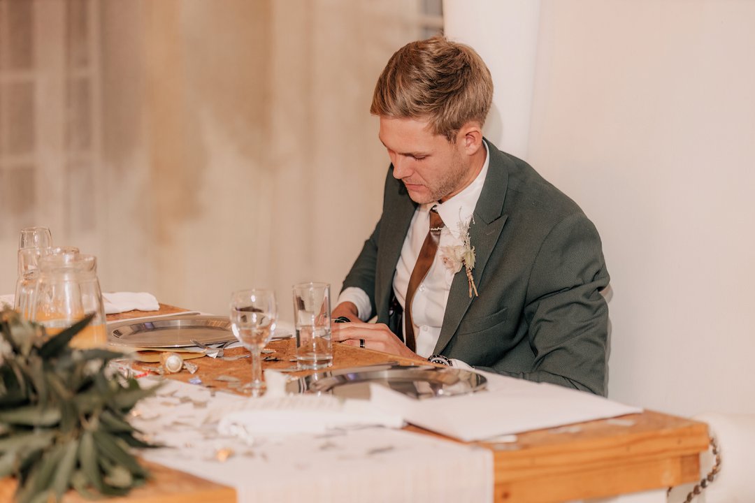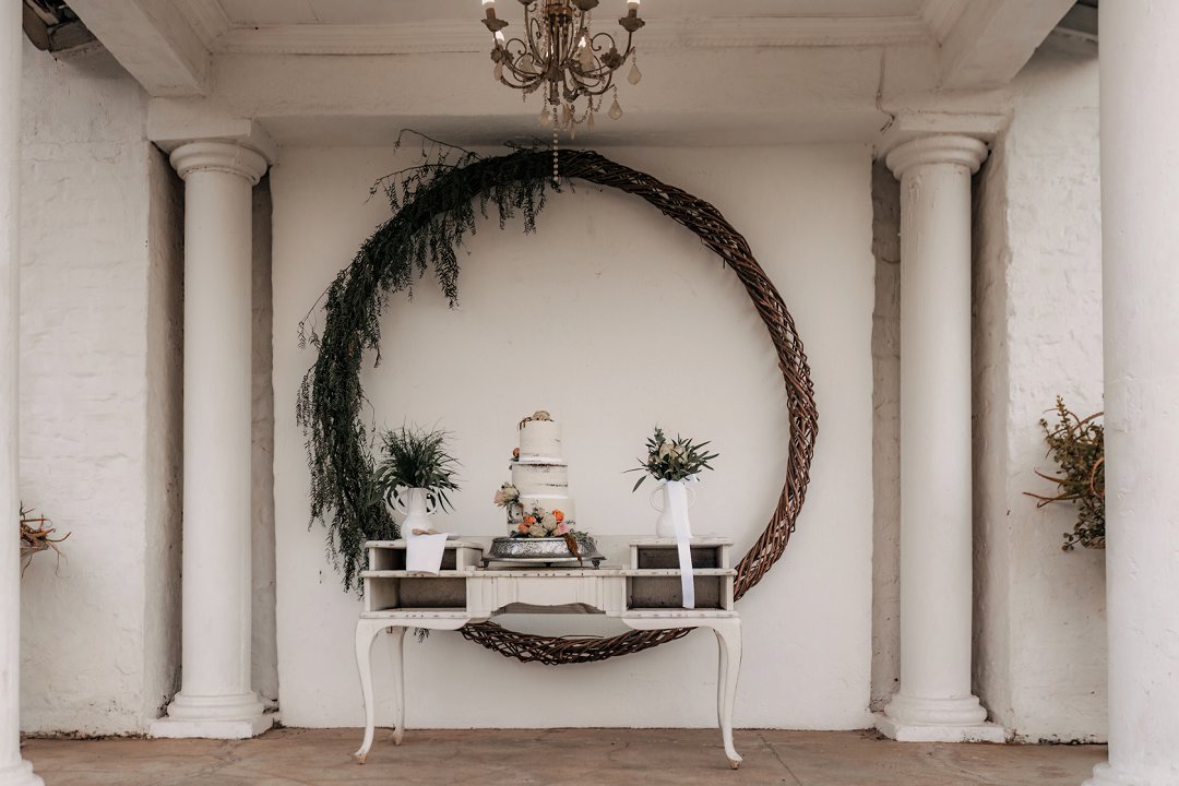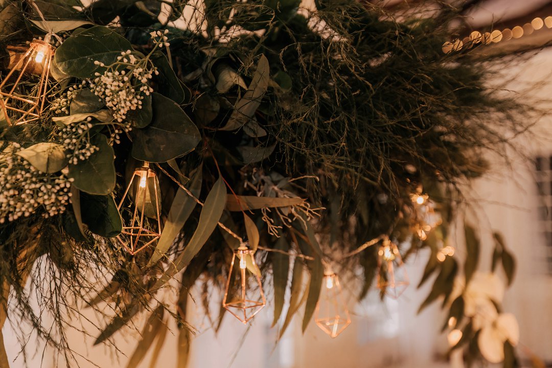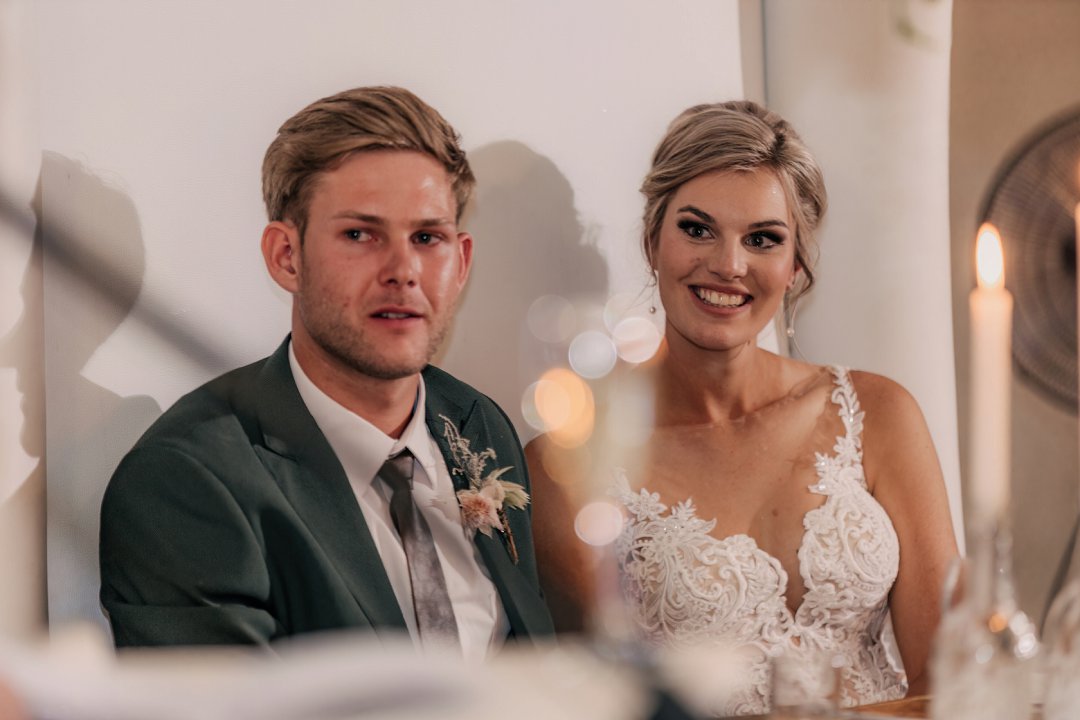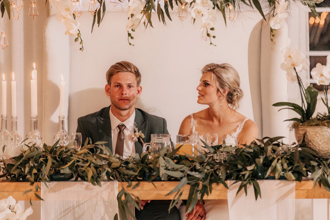 Daar was twee lang tafels met groenigheid op en tikseltjies wit tussen die blom ontwerpe. Ou wynbottels was herwin en gebruik as kersstaanders op die paartjie se tafels. Die dekor elemente was eenvoudig gehou om dit ʼn meer klassieke gevoel te gee.