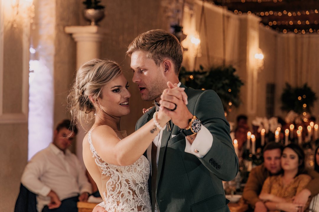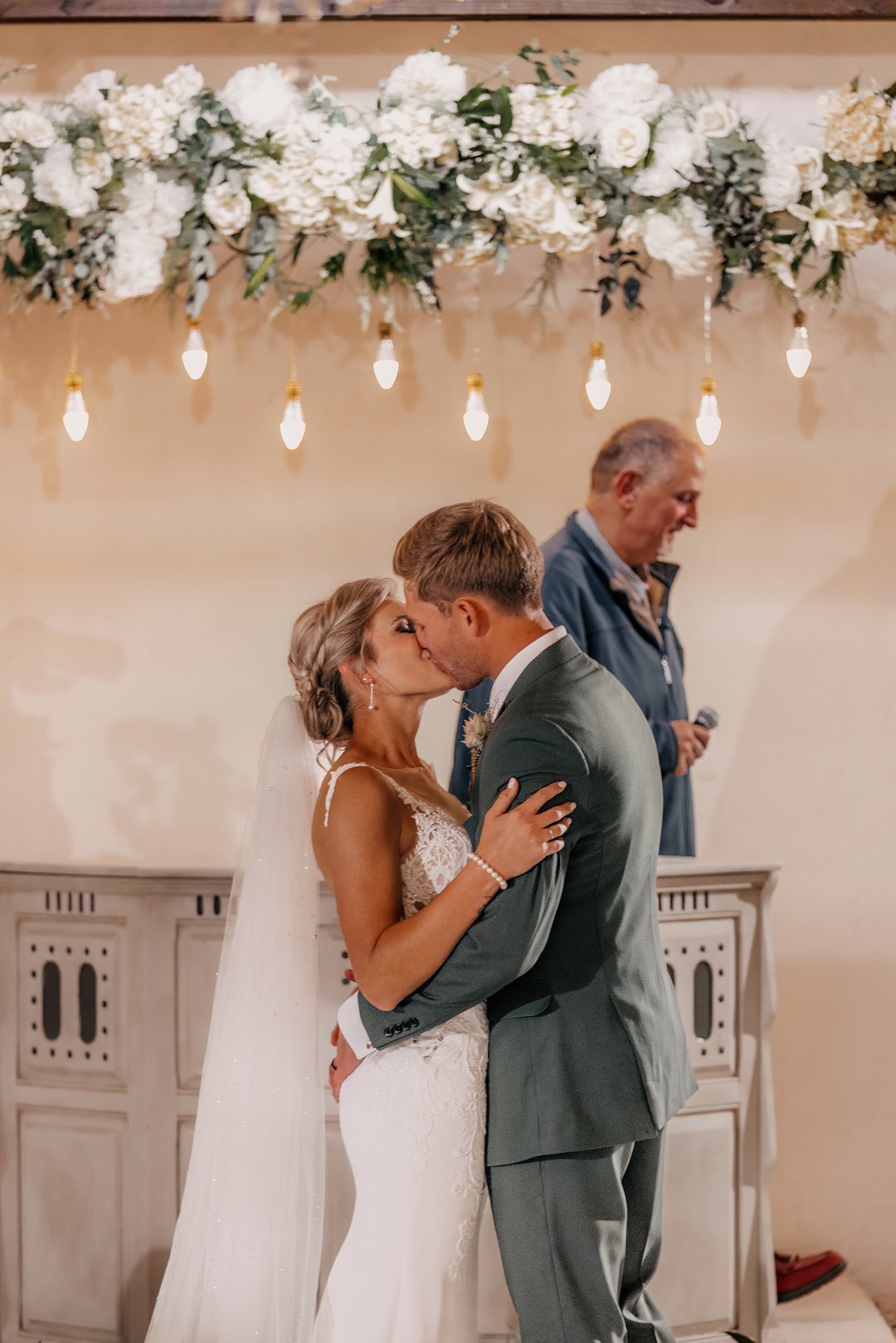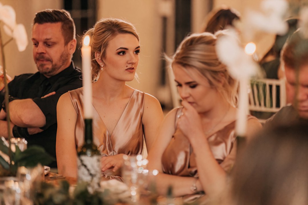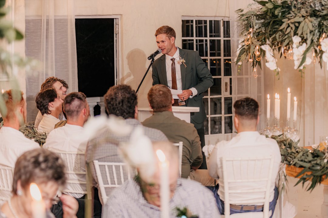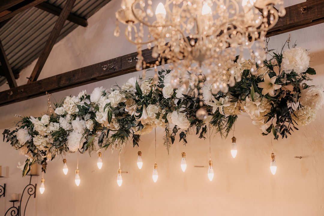 Daar was twee lang tafels met groenigheid op en tikseltjies wit tussen die blom ontwerpe. Ou wynbottels was herwin en gebruik as kersstaanders op die paartjie se tafels. Die dekor elemente was eenvoudig gehou om dit ʼn meer klassieke gevoel te gee.