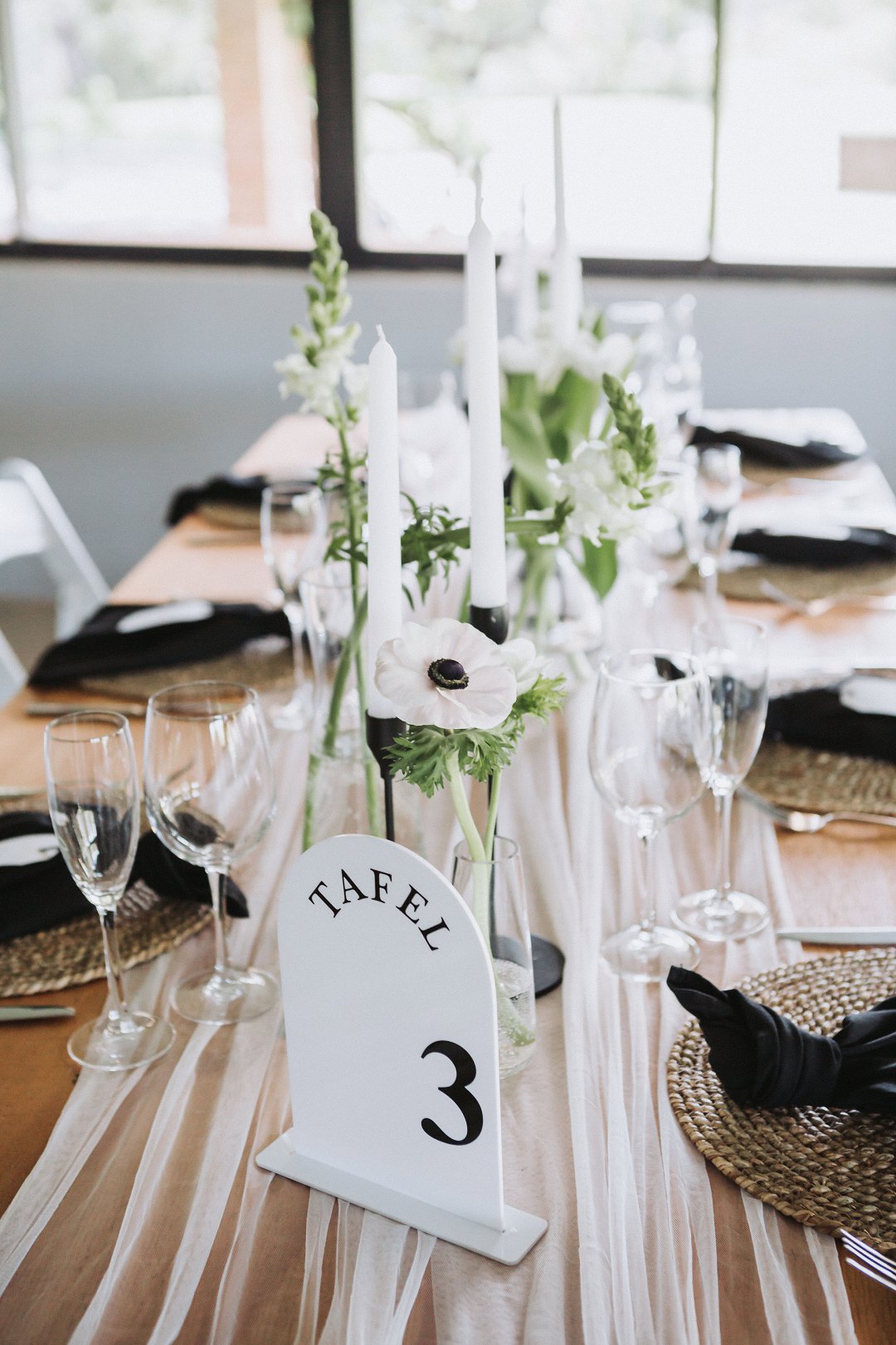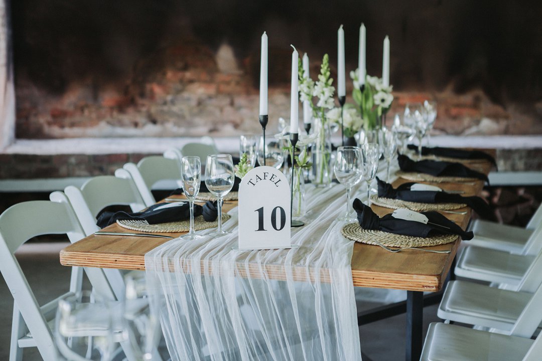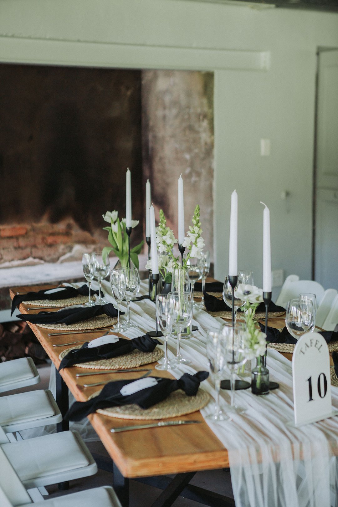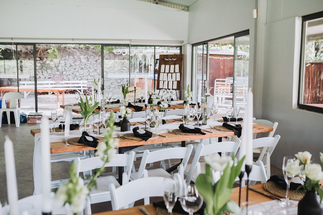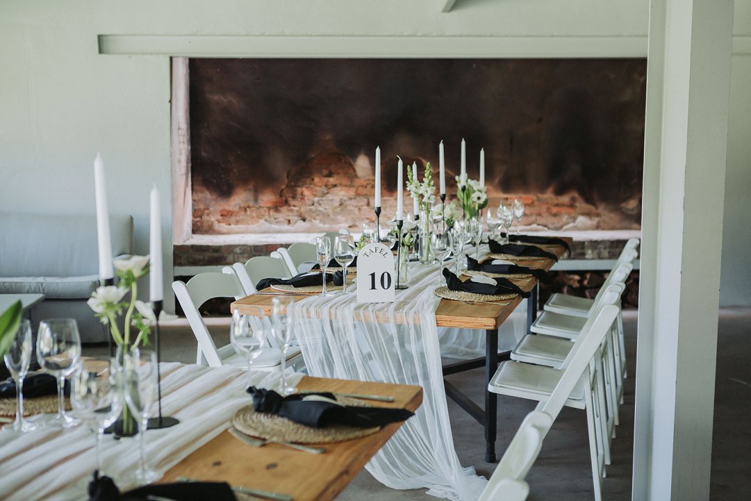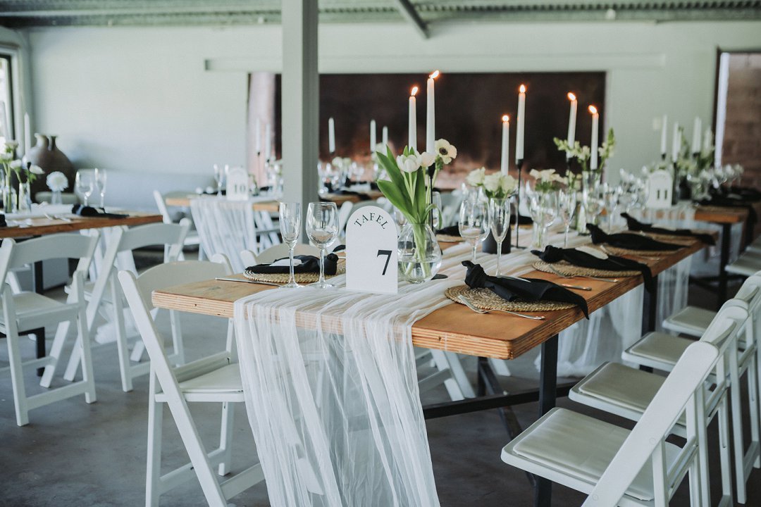 Ons het vir minimalistiese swart en wit dekor gegaan op die hout tafels met vars blomme, kerse en glas houers om alles lig en skoon te hou.
