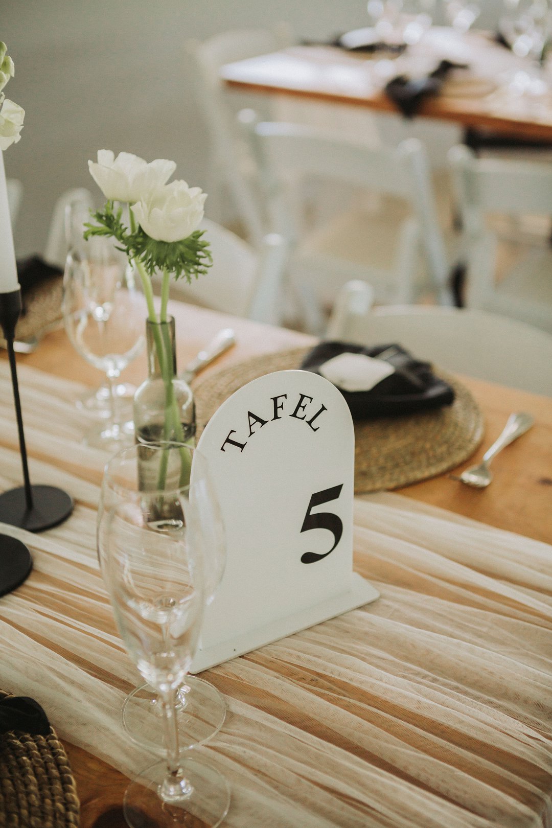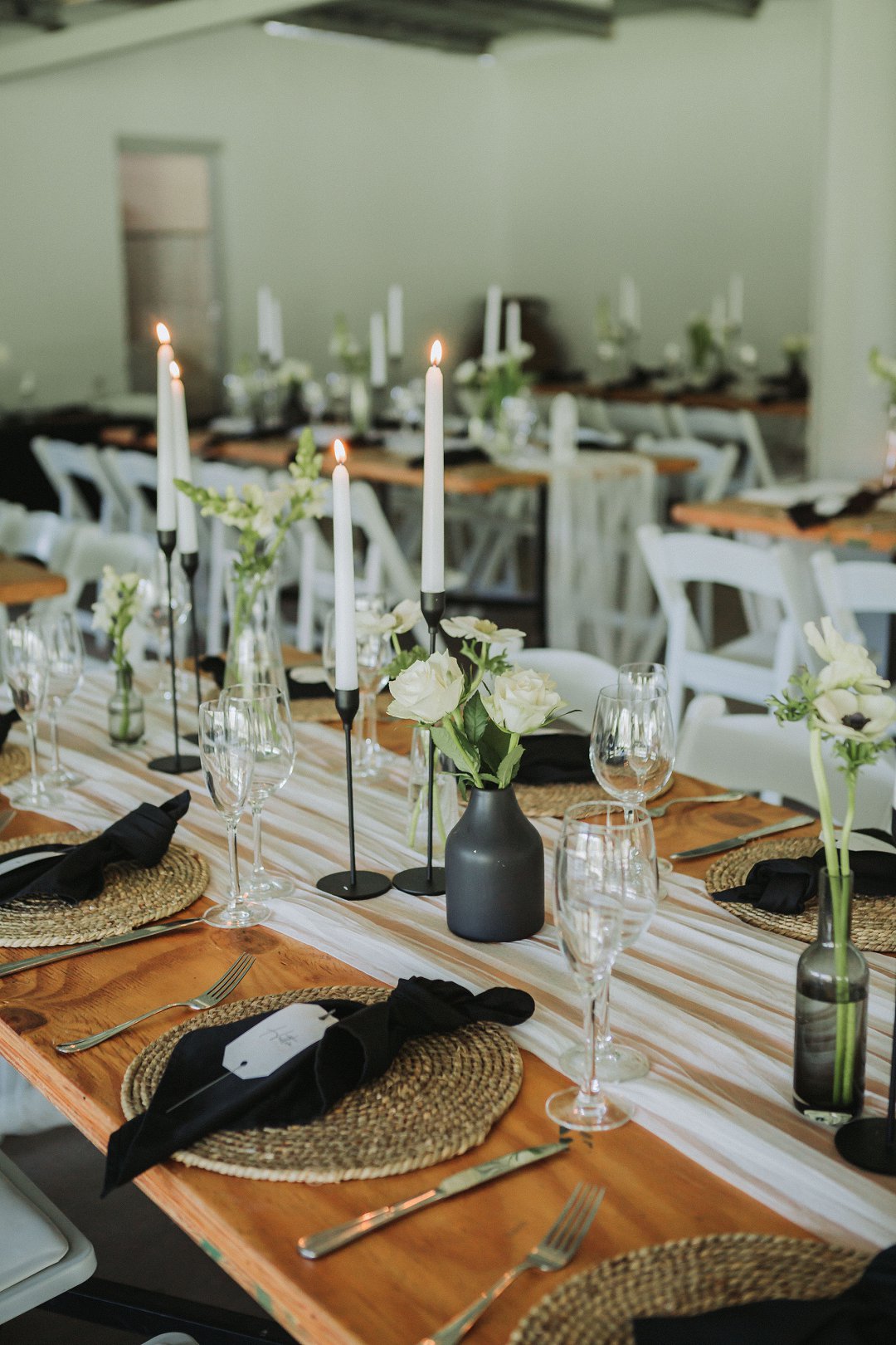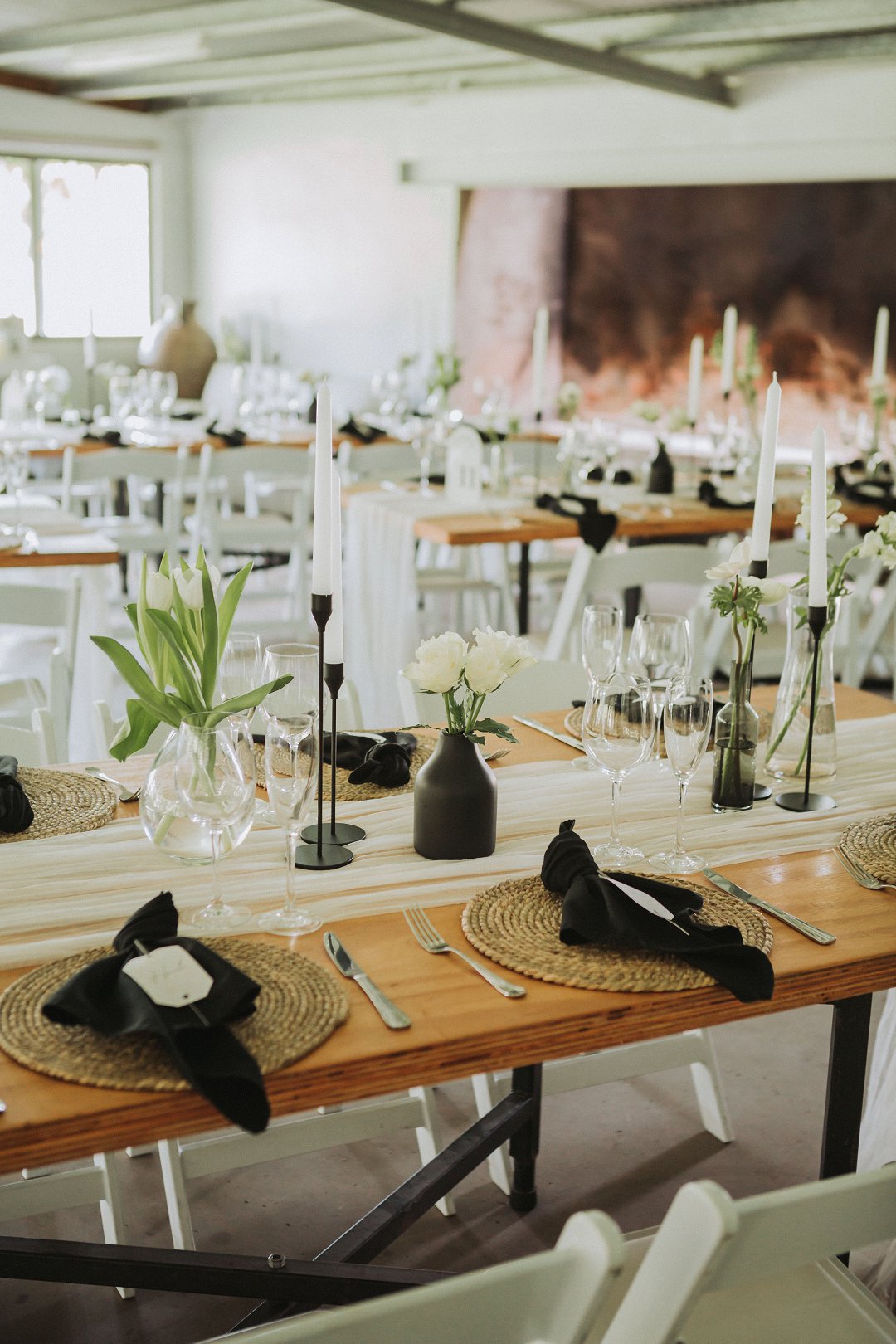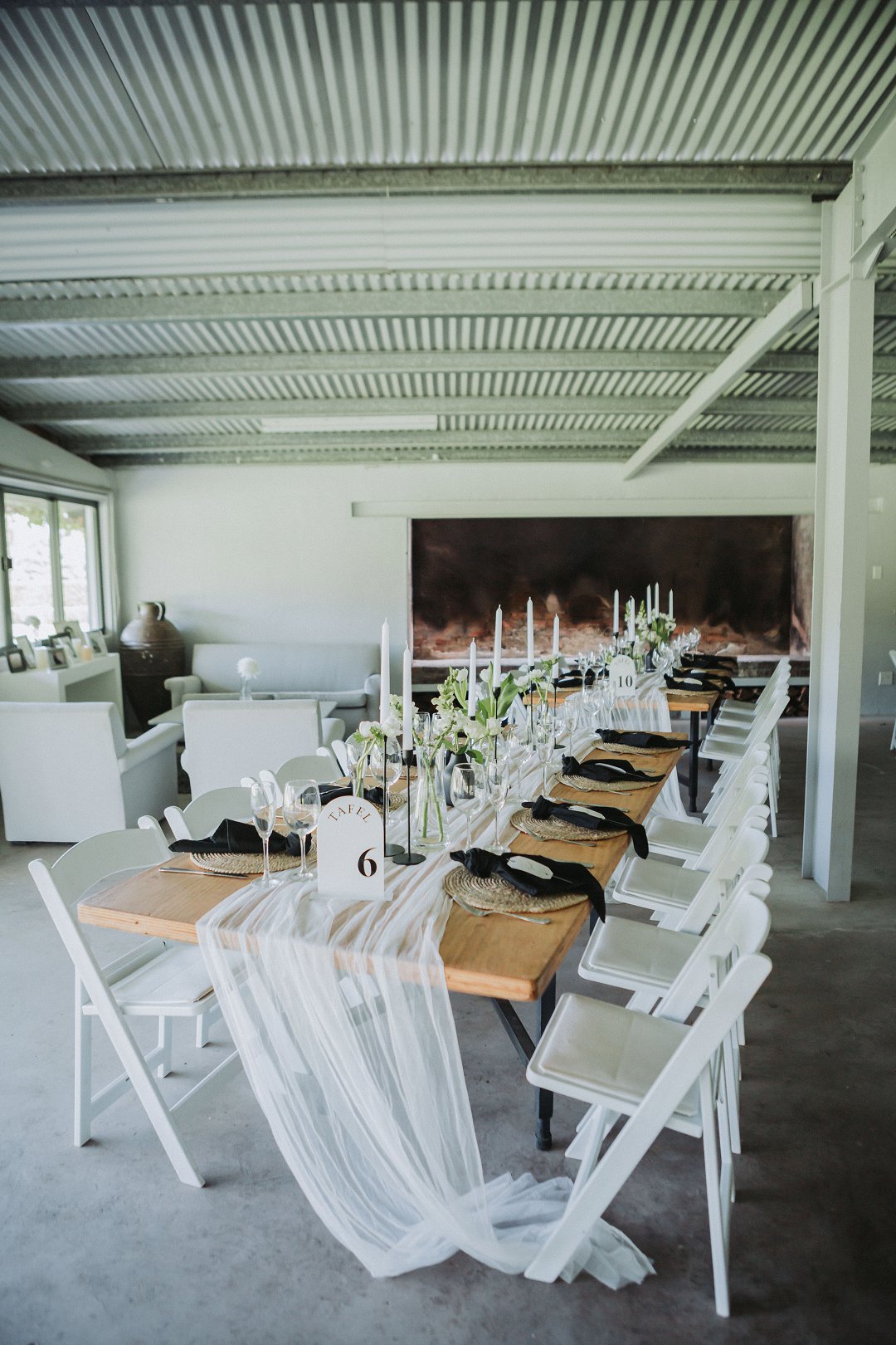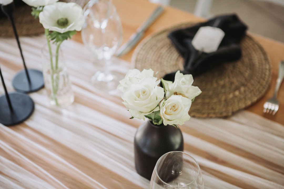 Ons het vir minimalistiese swart en wit dekor gegaan op die hout tafels met vars blomme, kerse en glas houers om alles lig en skoon te hou.