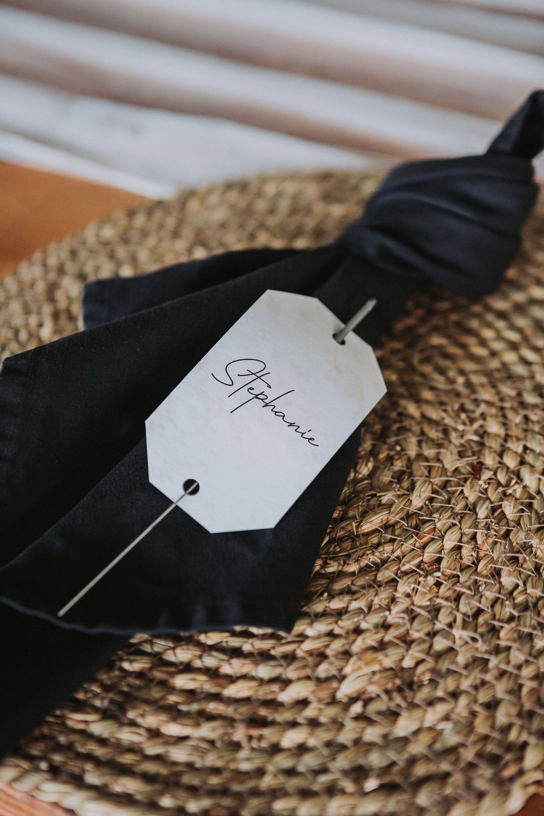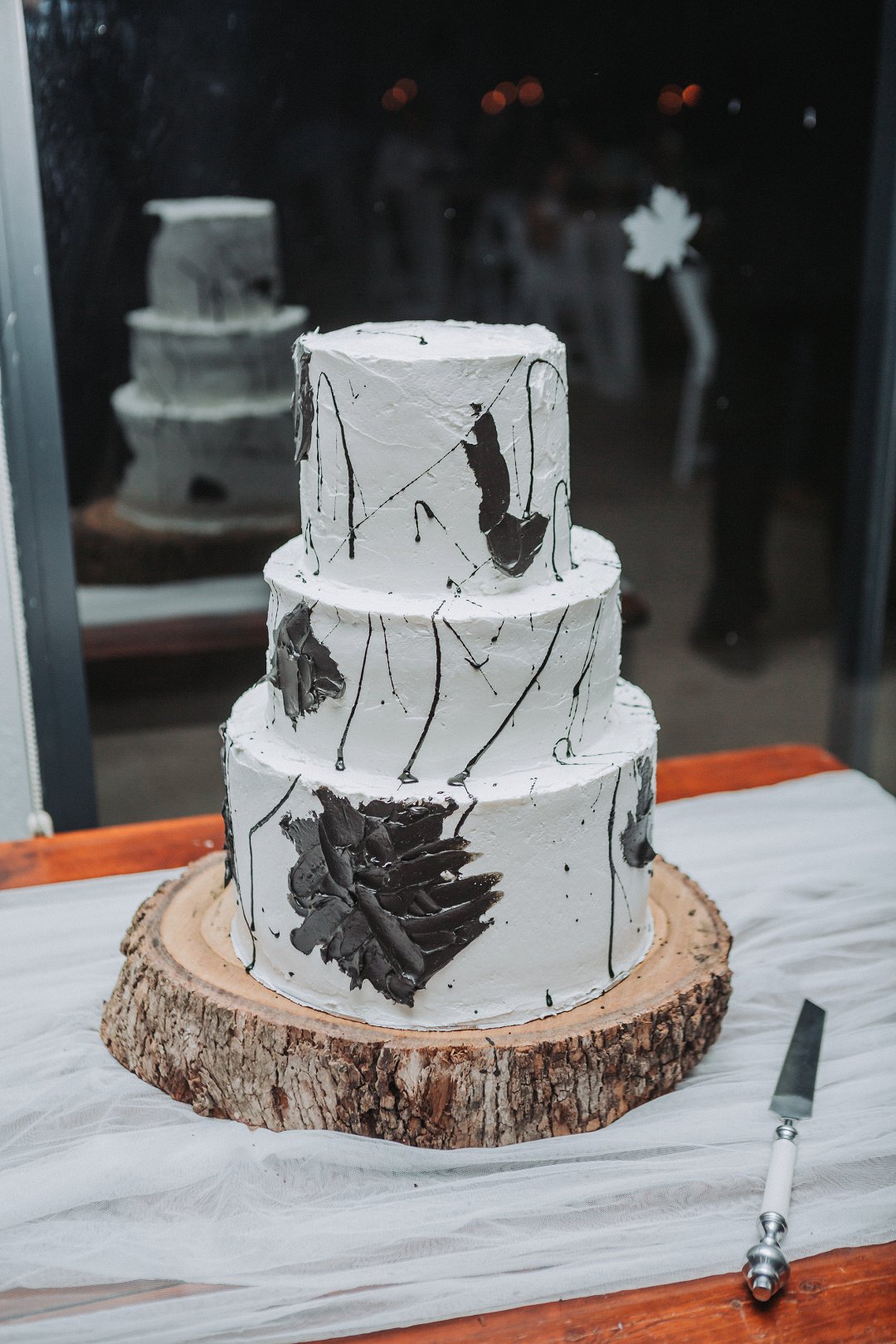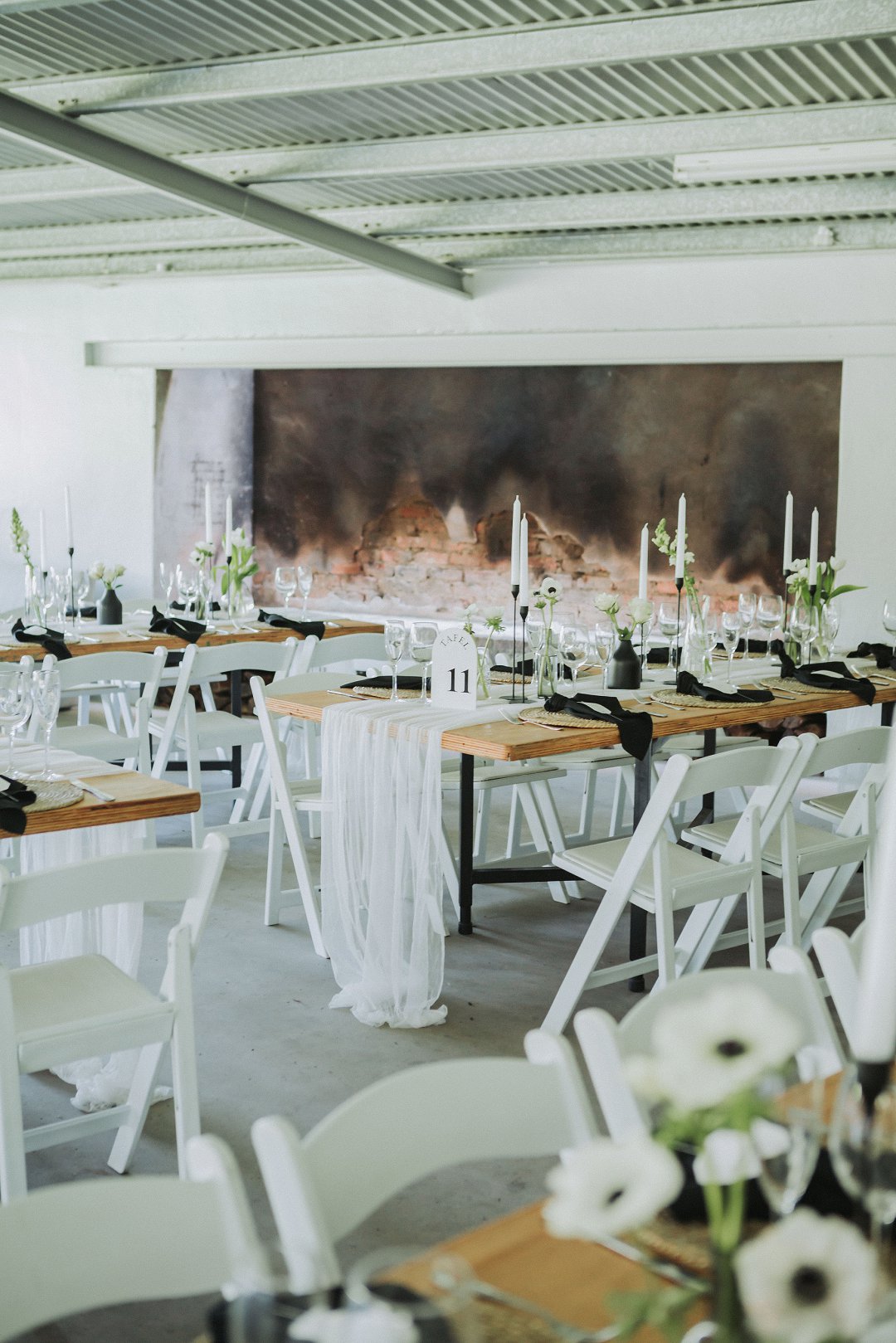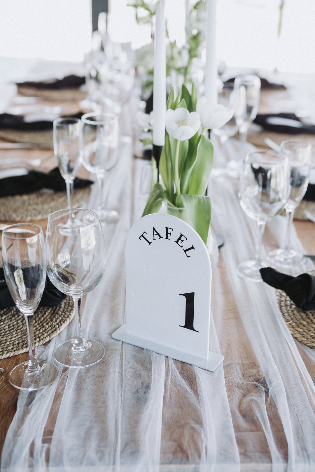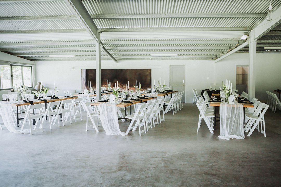 Ons het vir minimalistiese swart en wit dekor gegaan op die hout tafels met vars blomme, kerse en glas houers om alles lig en skoon te hou.