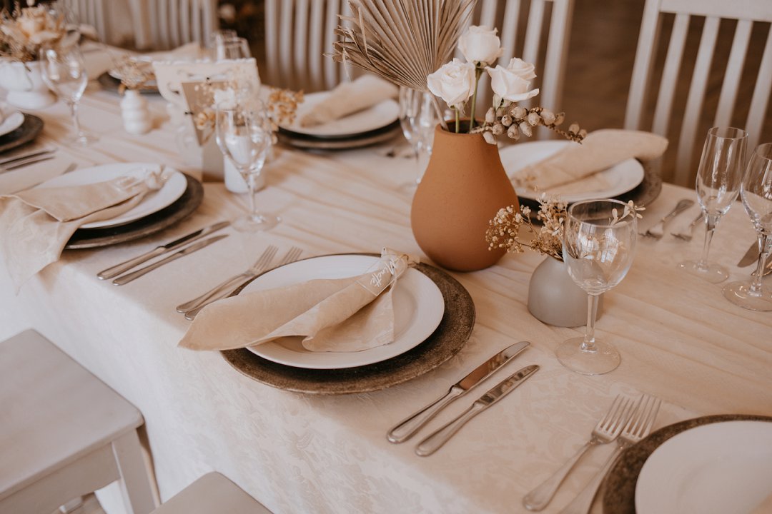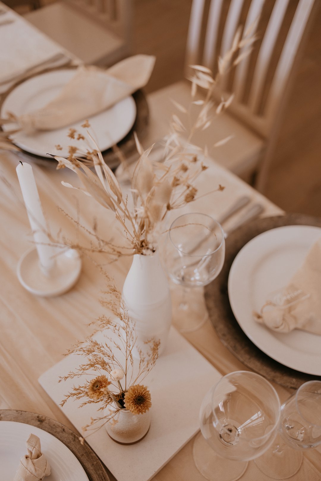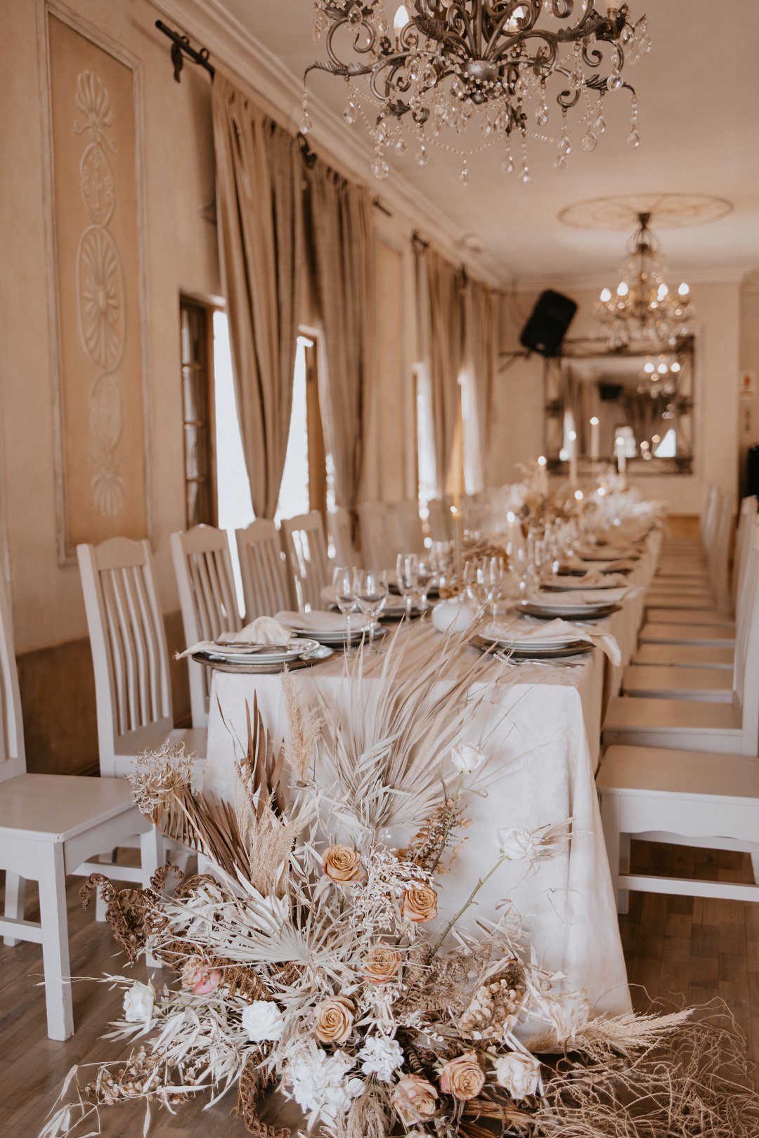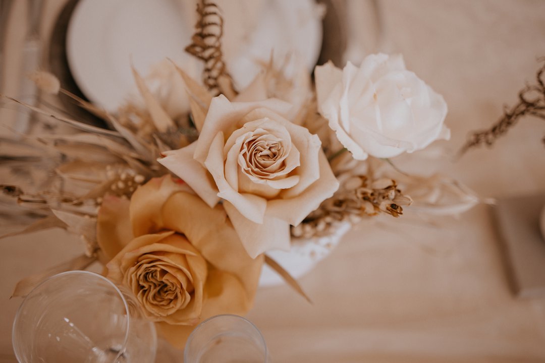 Ons dekor inspirasie was Minimal with forever detail. Die gedroogte blomme en plante speel op die forever, die kleure op minimal en die kerse, Zambiese rose en potjies die detail.