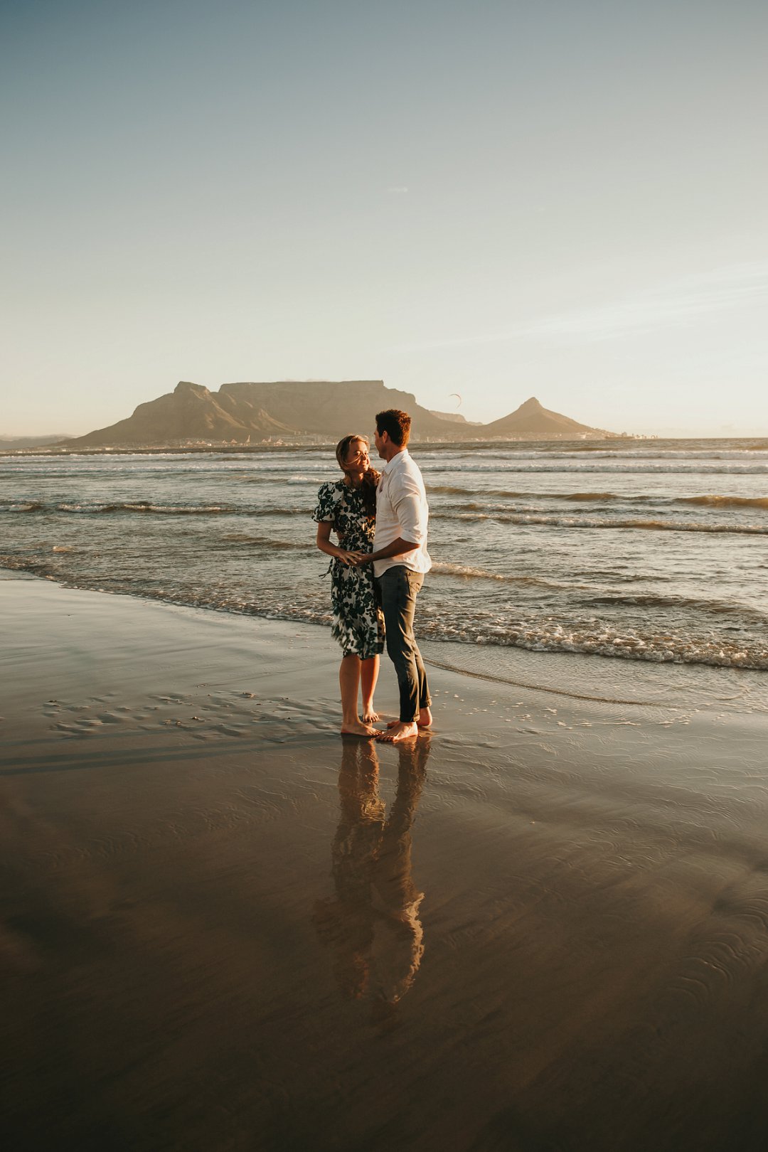 Ons deel graag met julle Pieter en Lize se Bloubergstrand verlowing fotosessie met branderplankryers in die agtergrond vir prettige element.