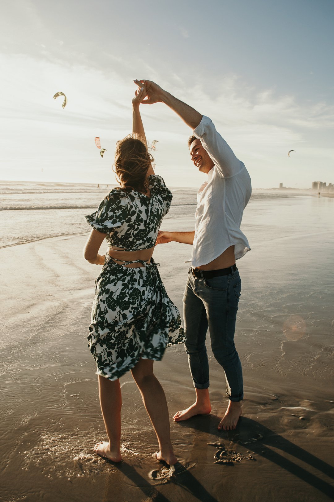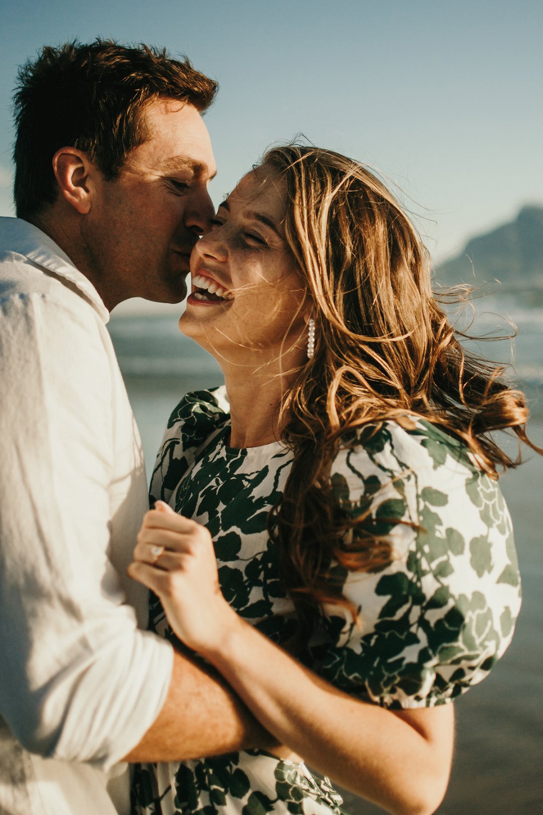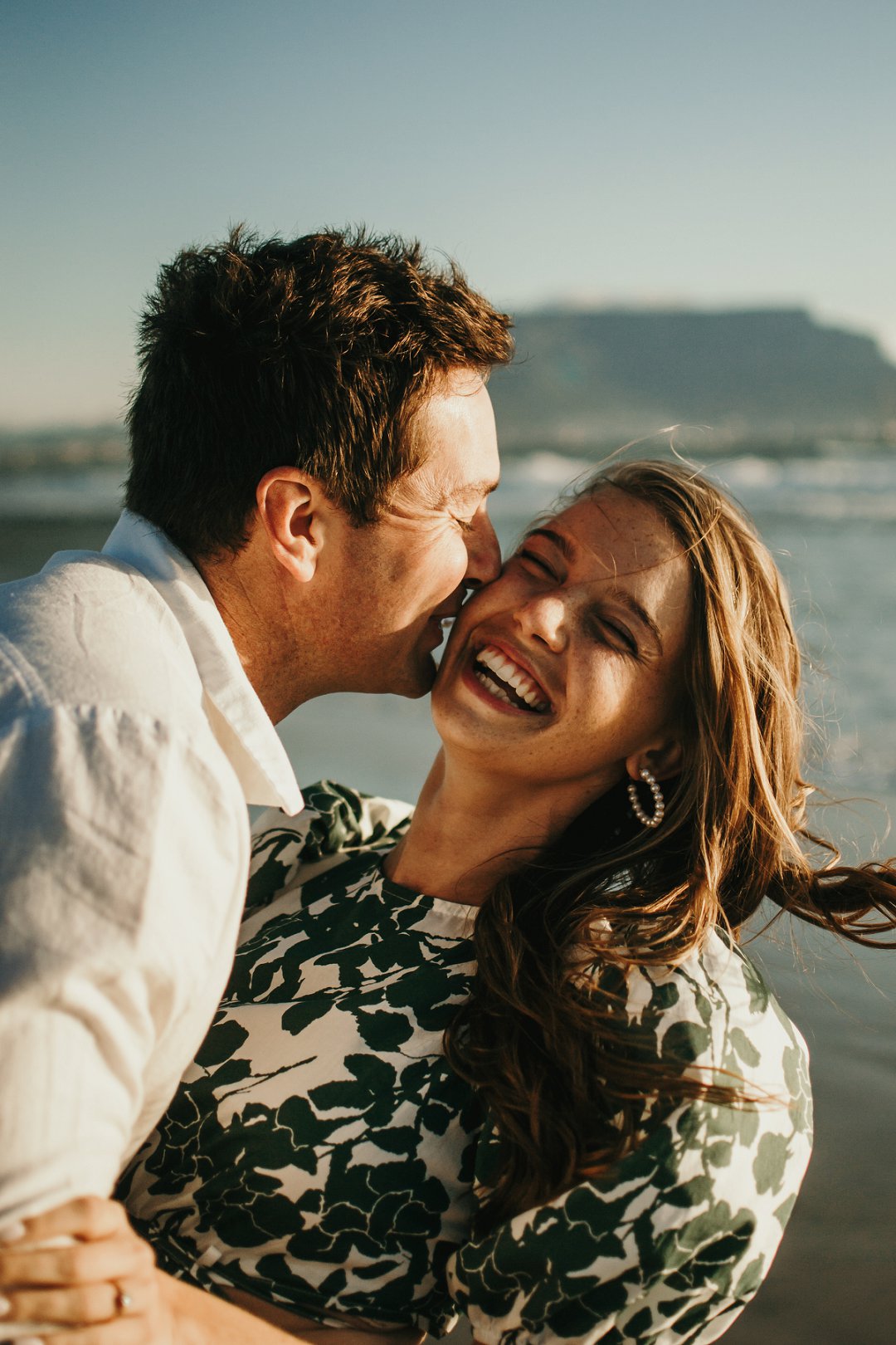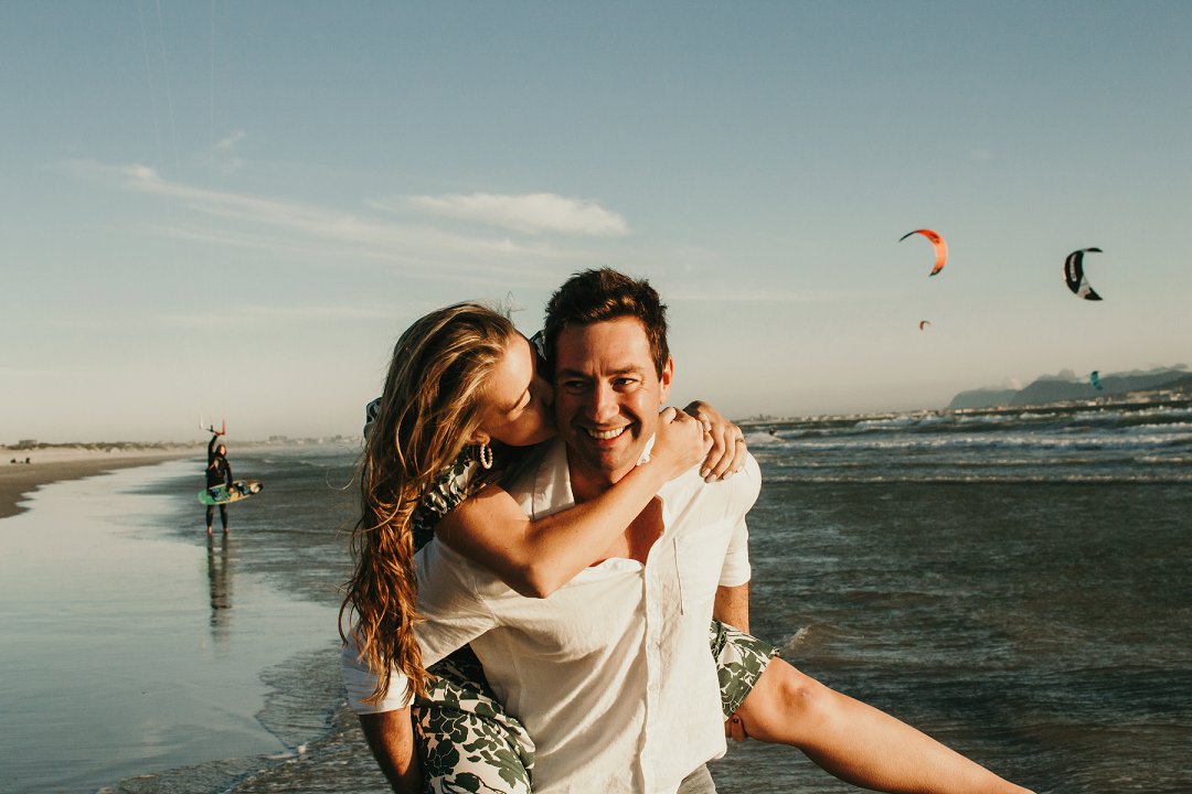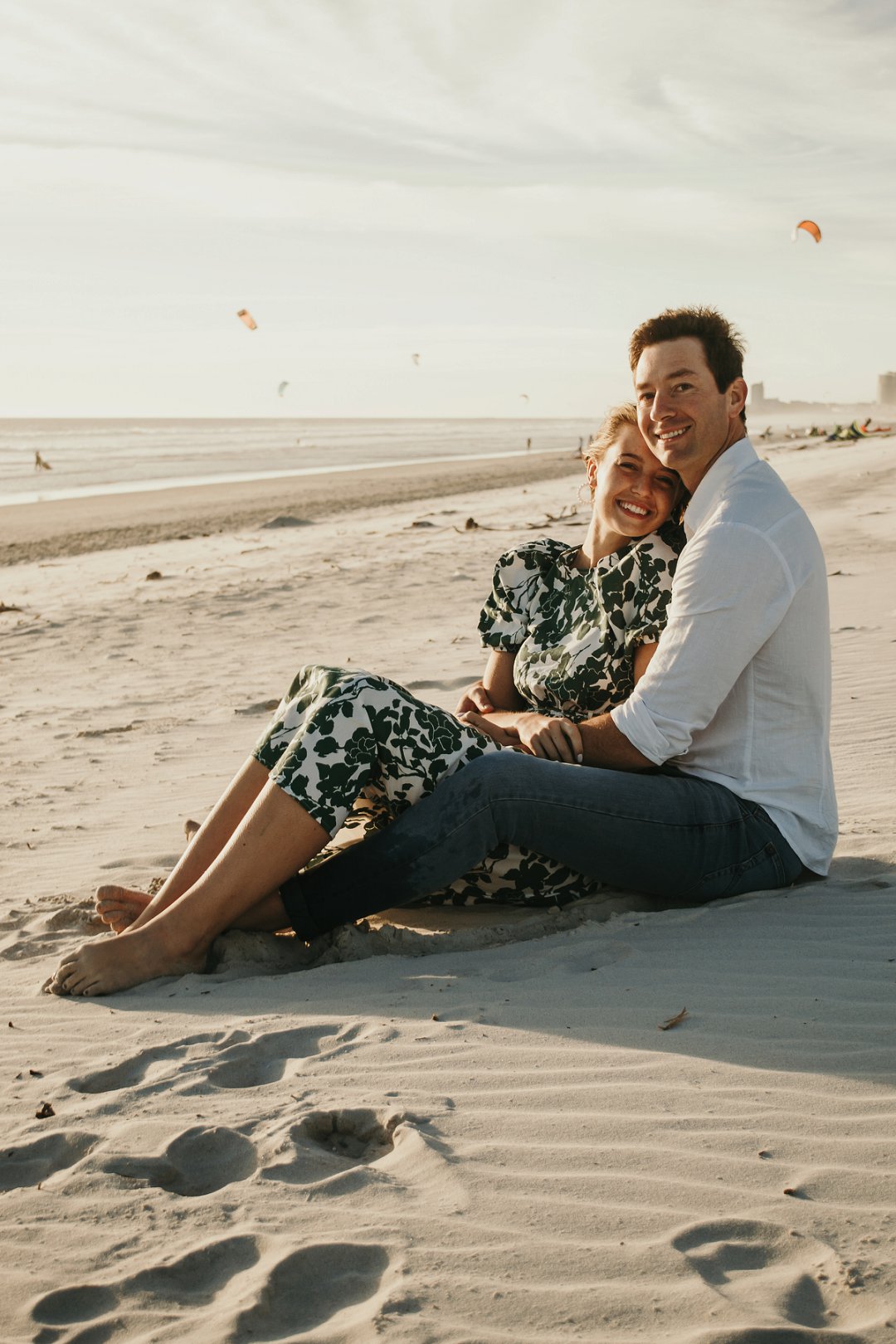 Ons deel graag met julle Pieter en Lize se Bloubergstrand verlowing fotosessie met branderplankryers in die agtergrond vir prettige element.