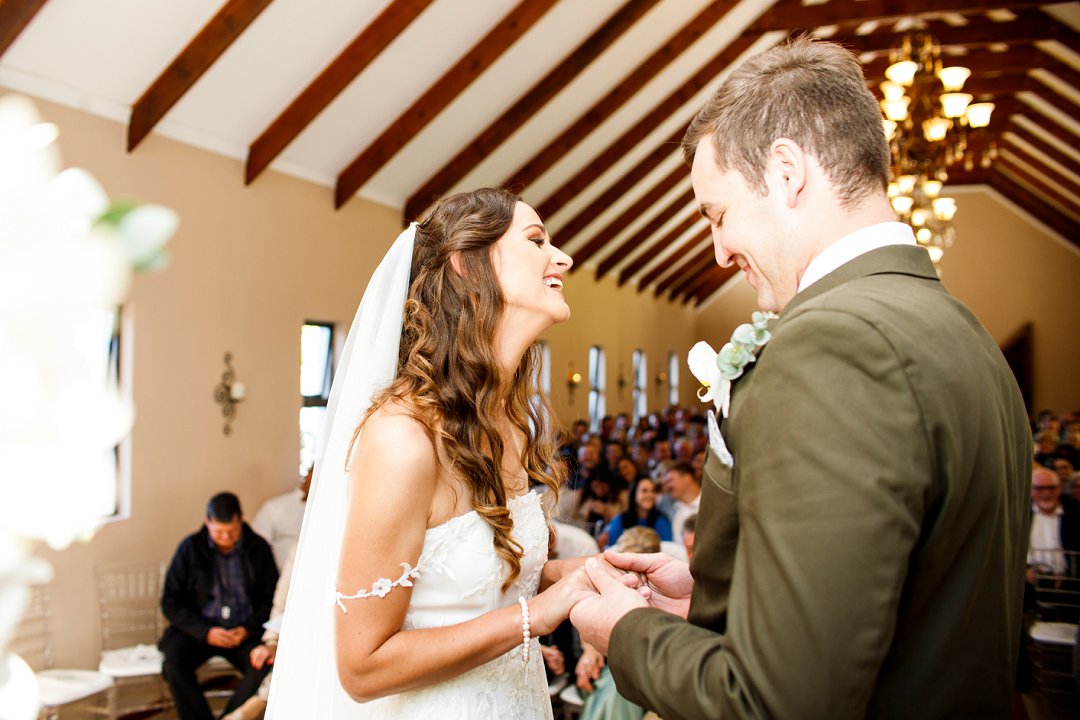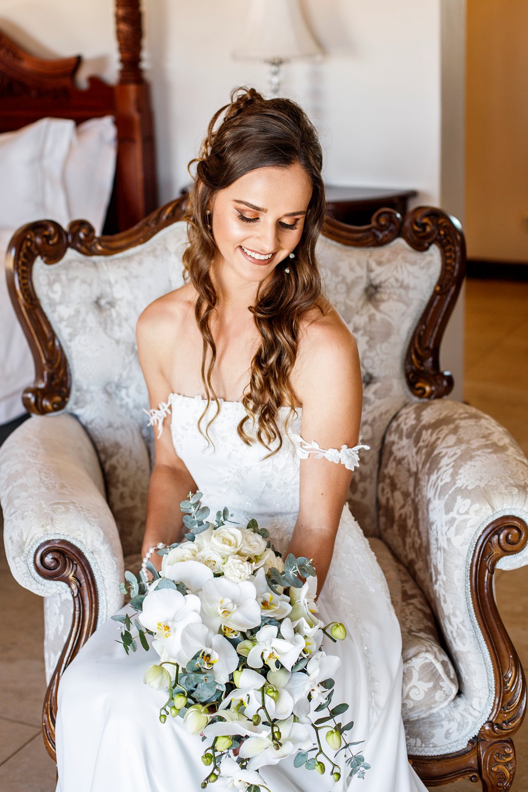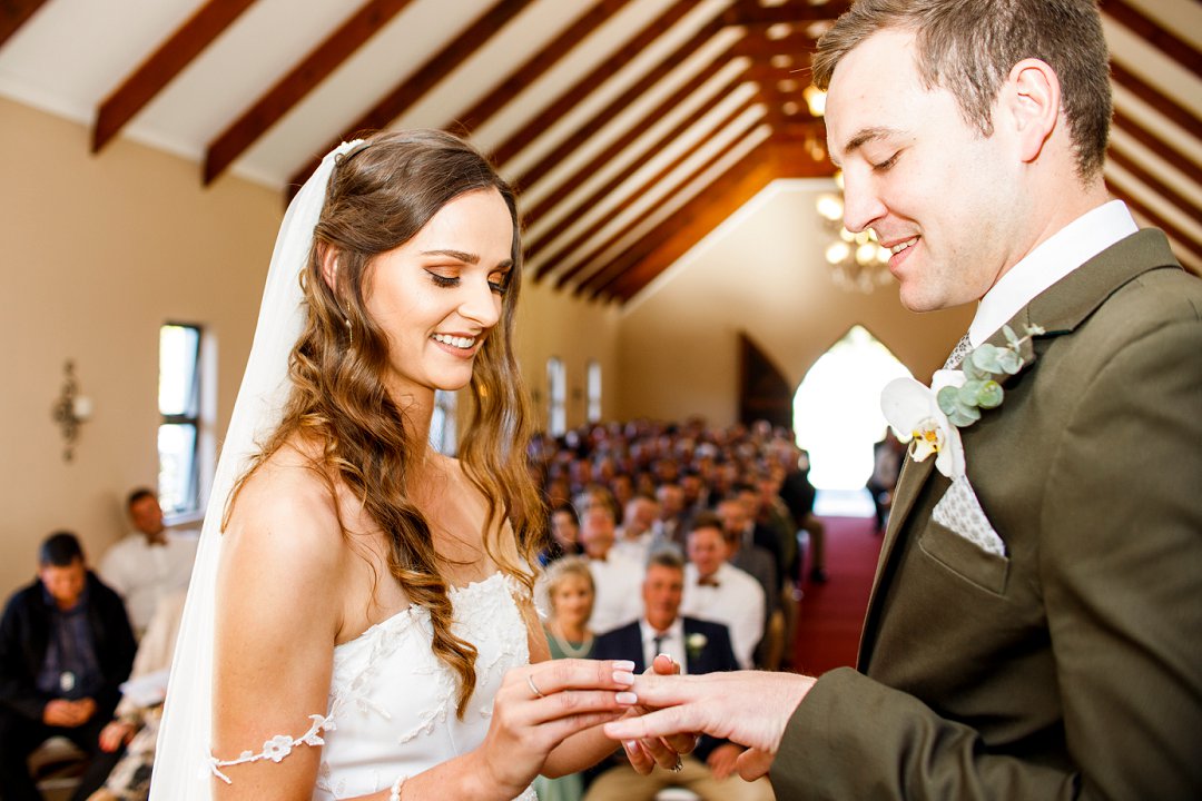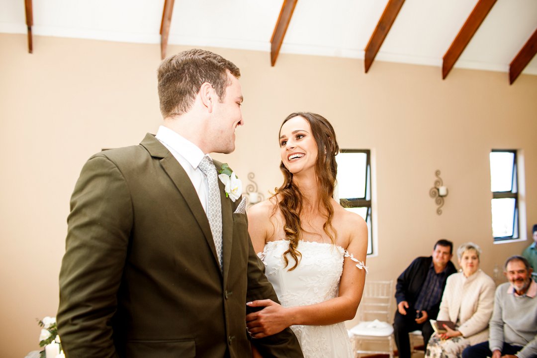 Die bruid lyk asemrowend mooi in haar borsbuis kant trourok. Haar elegansie straal deur in elke detail, en die romantiese kantwerk komplementeer haar figuur op ʼn betowerende manier. Die bruidegom lyk eweneens uitstekend in sy olyf groen pak. Saam het die Micaela en Herman ʼn oogverblindende paartjie gevorm wat ʼn blywende indruk op almal gemaak het.