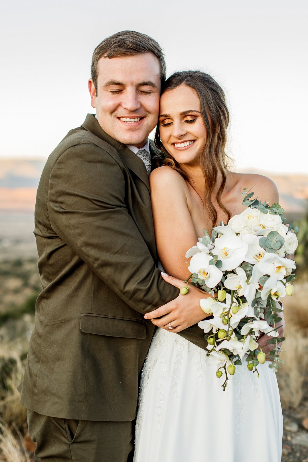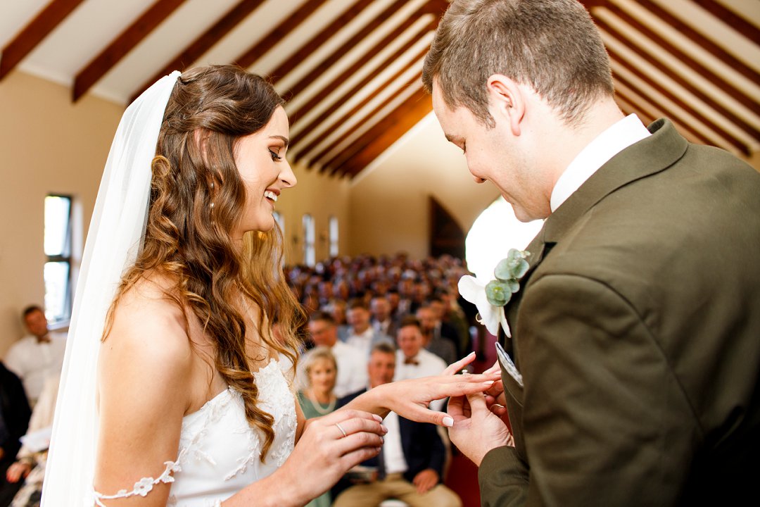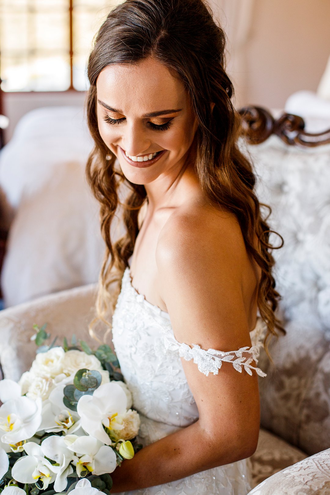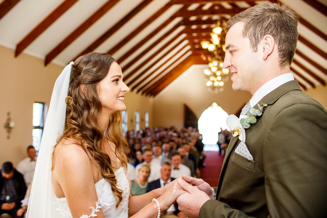 Die bruid lyk asemrowend mooi in haar borsbuis kant trourok. Haar elegansie straal deur in elke detail, en die romantiese kantwerk komplementeer haar figuur op ʼn betowerende manier. Die bruidegom lyk eweneens uitstekend in sy olyf groen pak. Saam het die Micaela en Herman ʼn oogverblindende paartjie gevorm wat ʼn blywende indruk op almal gemaak het.