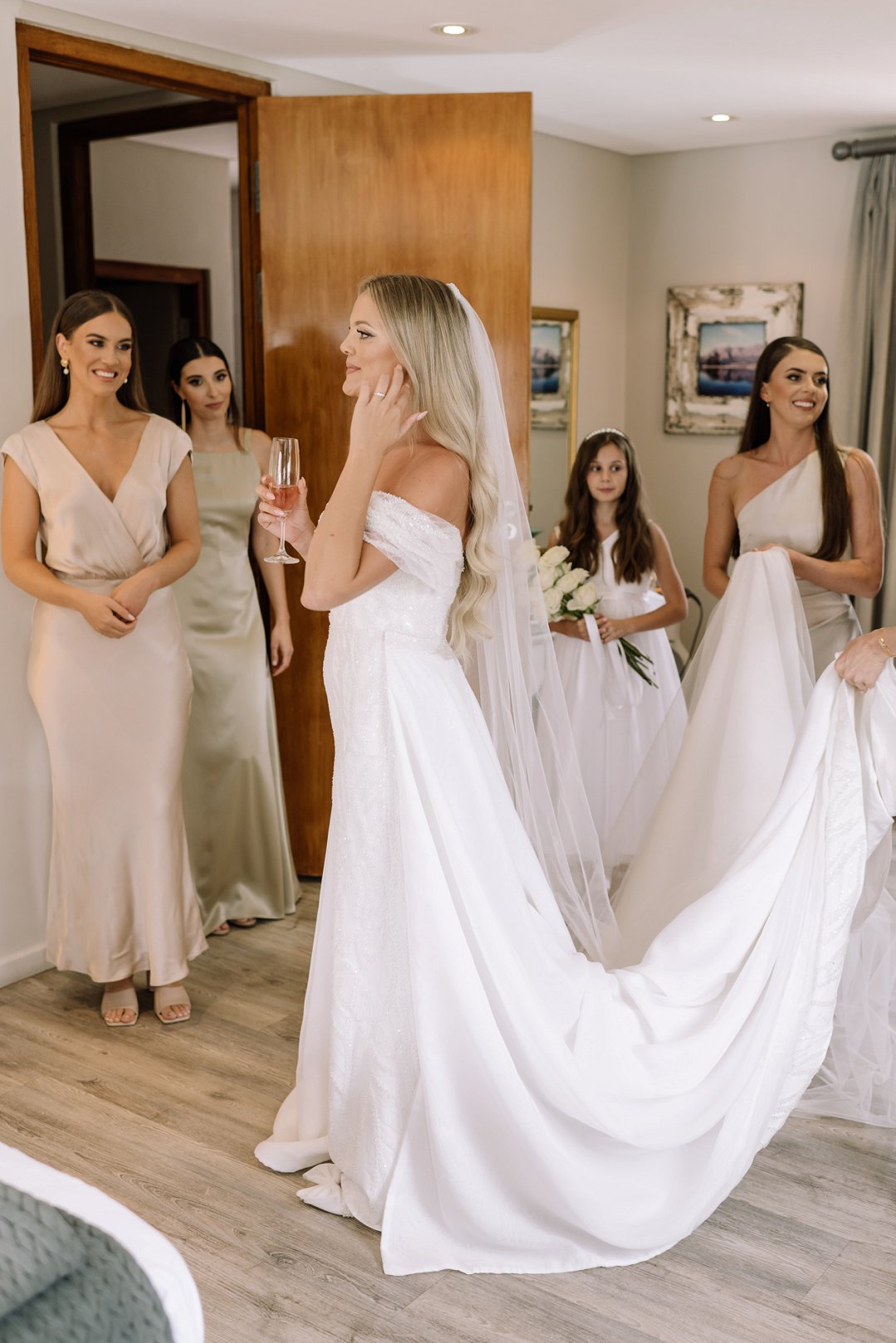 Voordat ek selfs verloof was, het ek geweet dat ek wil hê Nicolle van House of Santos my trourok moet ontwerp. Ek is absoluut mal oor alles wat sy maak! Ek was in Australië en sy is natuurlik in Suid-Afrika. So ons het ʼn hele klomp video-oproepe gehad om die rok te ontwerp. Ek het nie baie van kant gehou nie, en ek was ook nie mal oor ʼn eenvoudige rok nie – dit is mos die een dag waarop jou rok bietjie EKSTRA kan wees! En so het Nicolle die pragtigste beaded rok vir my ontwerp.