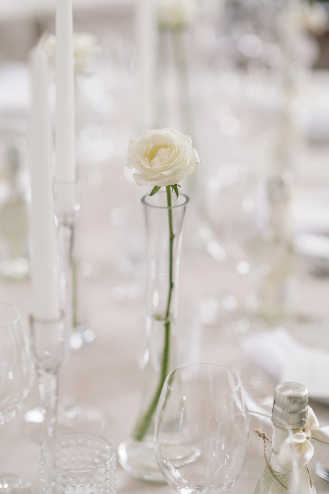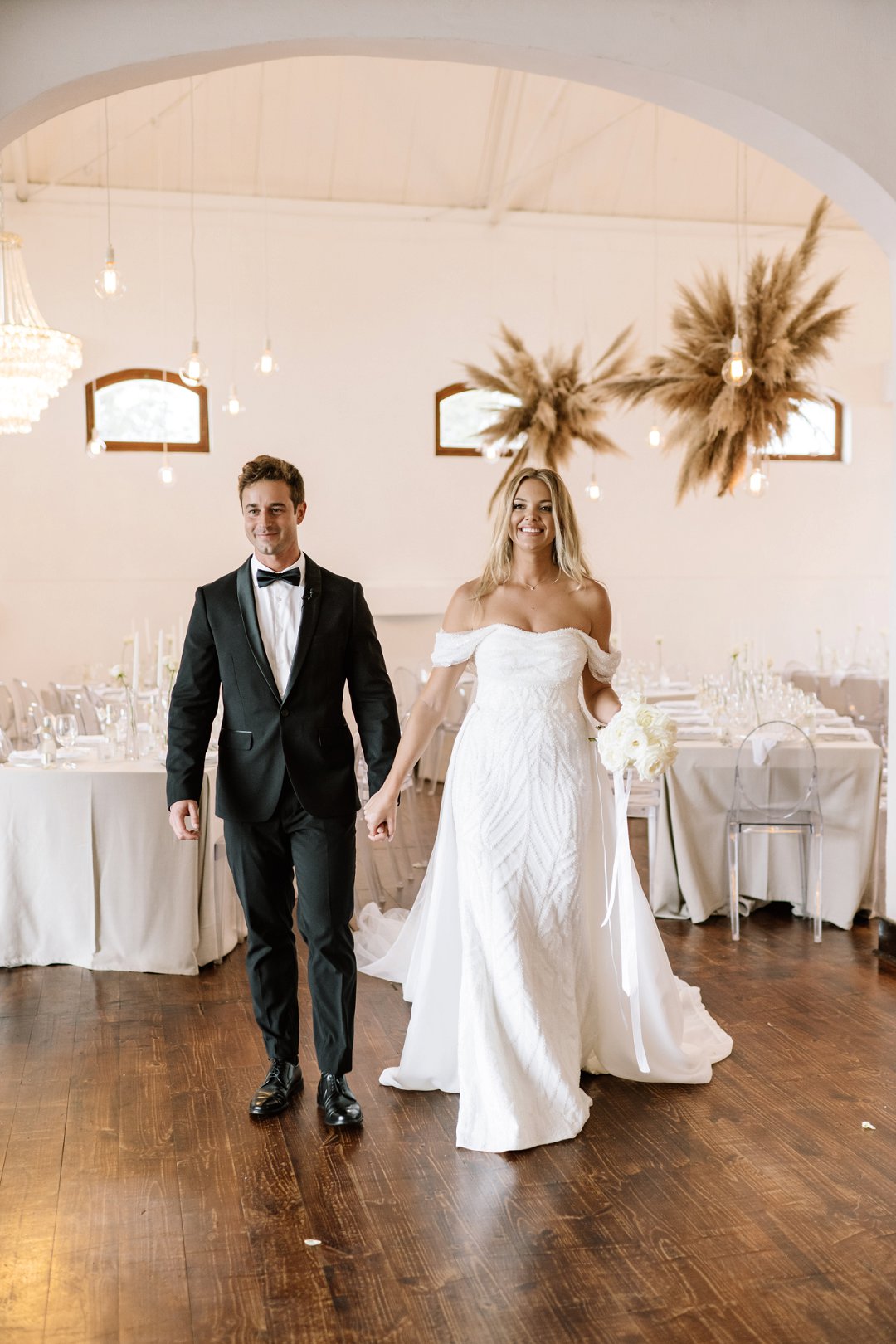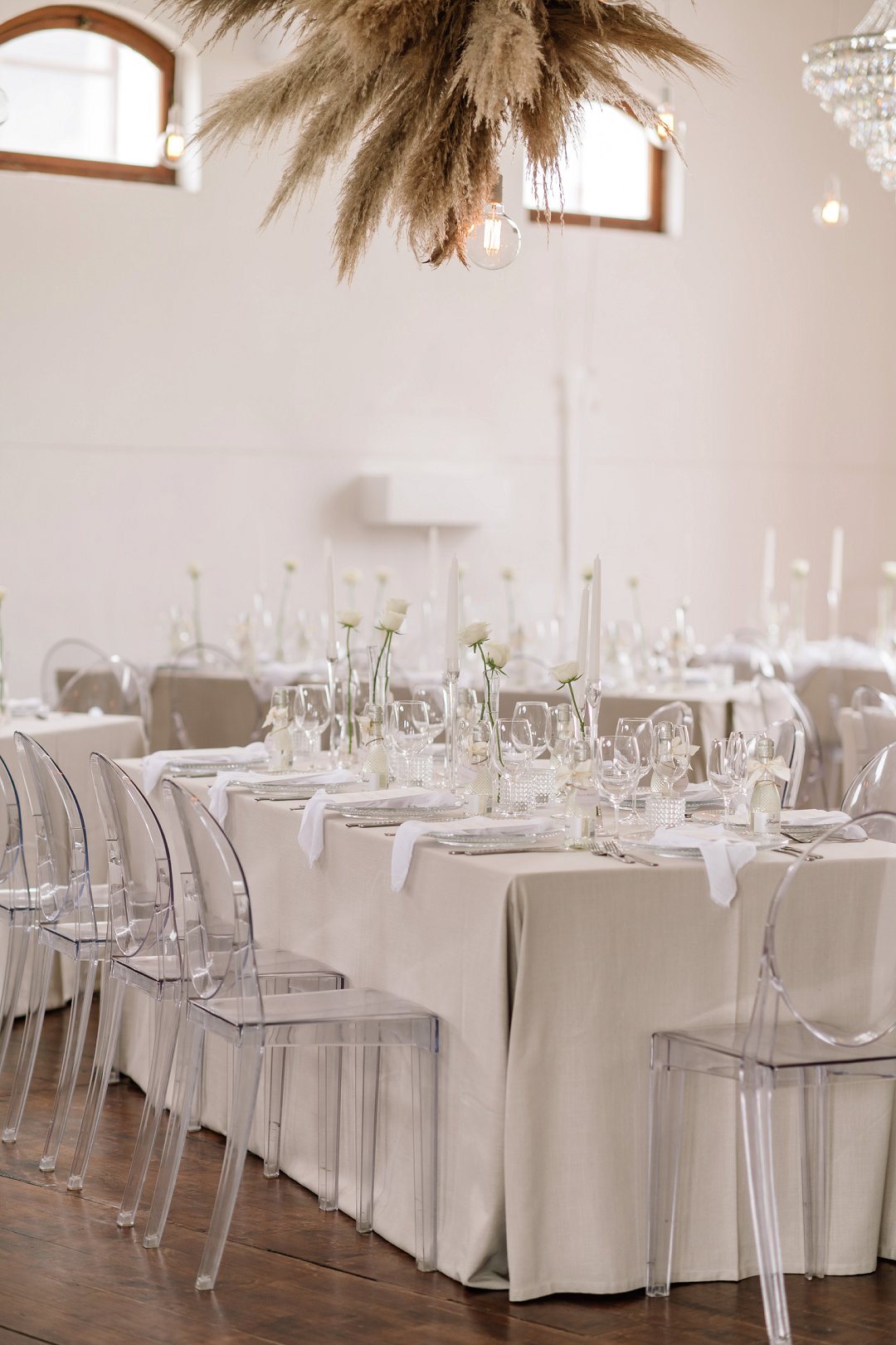 Ons wou dit baie neutraal hou – so ons het wit en sjampanje gekies. Zorgvliet se onthaalarea is klaar só mooi, so ons het nie baie nodig gehad nie. Een ding wat ek graag wou hê was pampasgras wat van die dak hang en Morné van Joli Creations het dit só mooi vir my gedoen! My blomme was net wit rose, baie eenvoudig maar dis wat ons wou hê!
