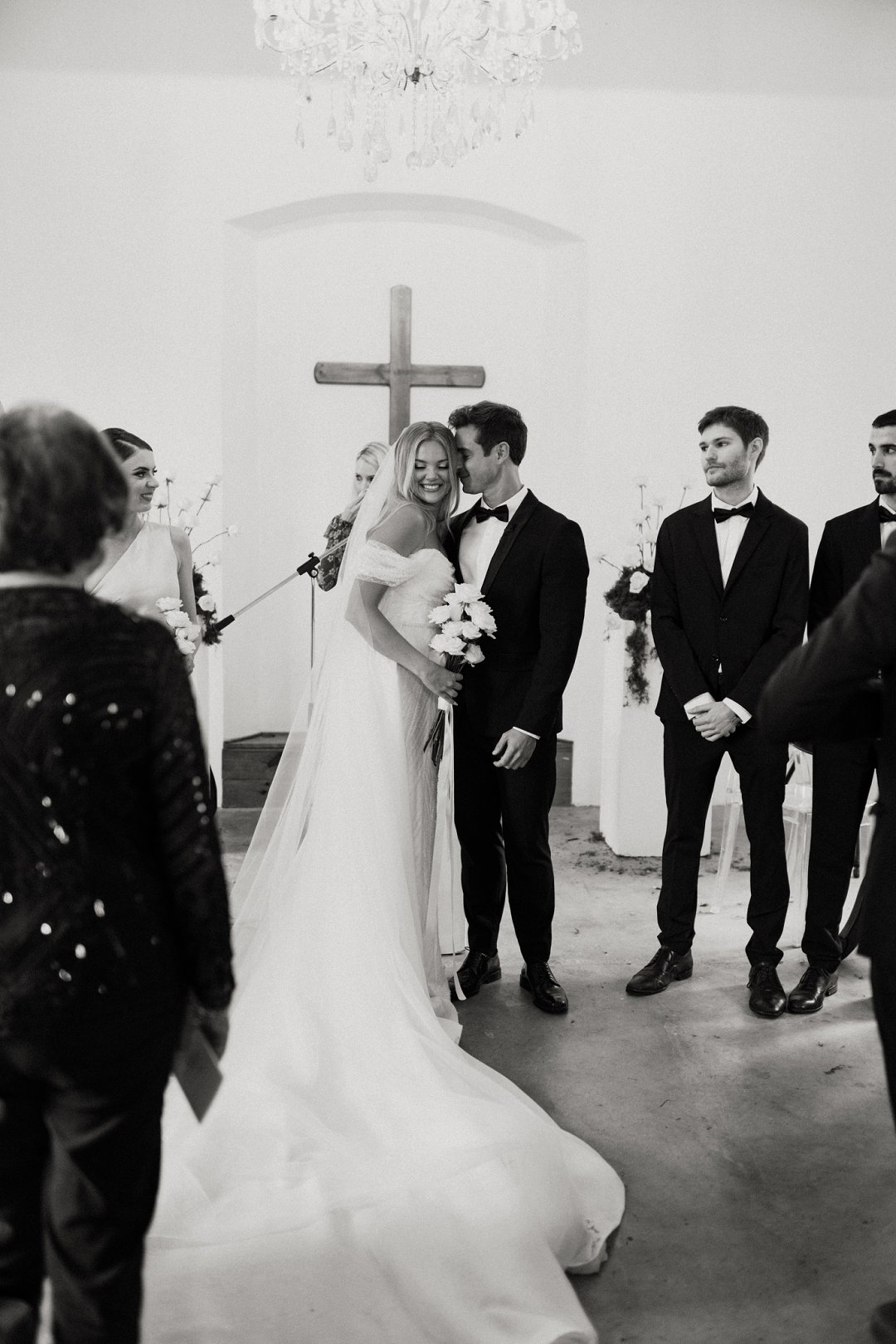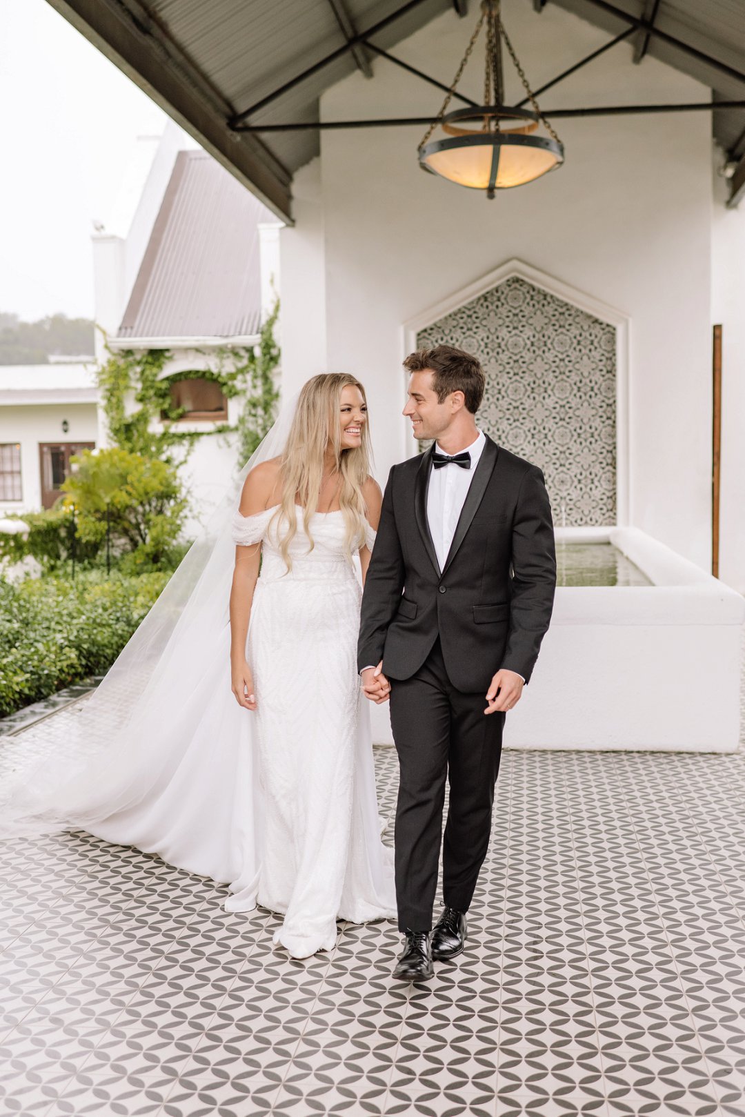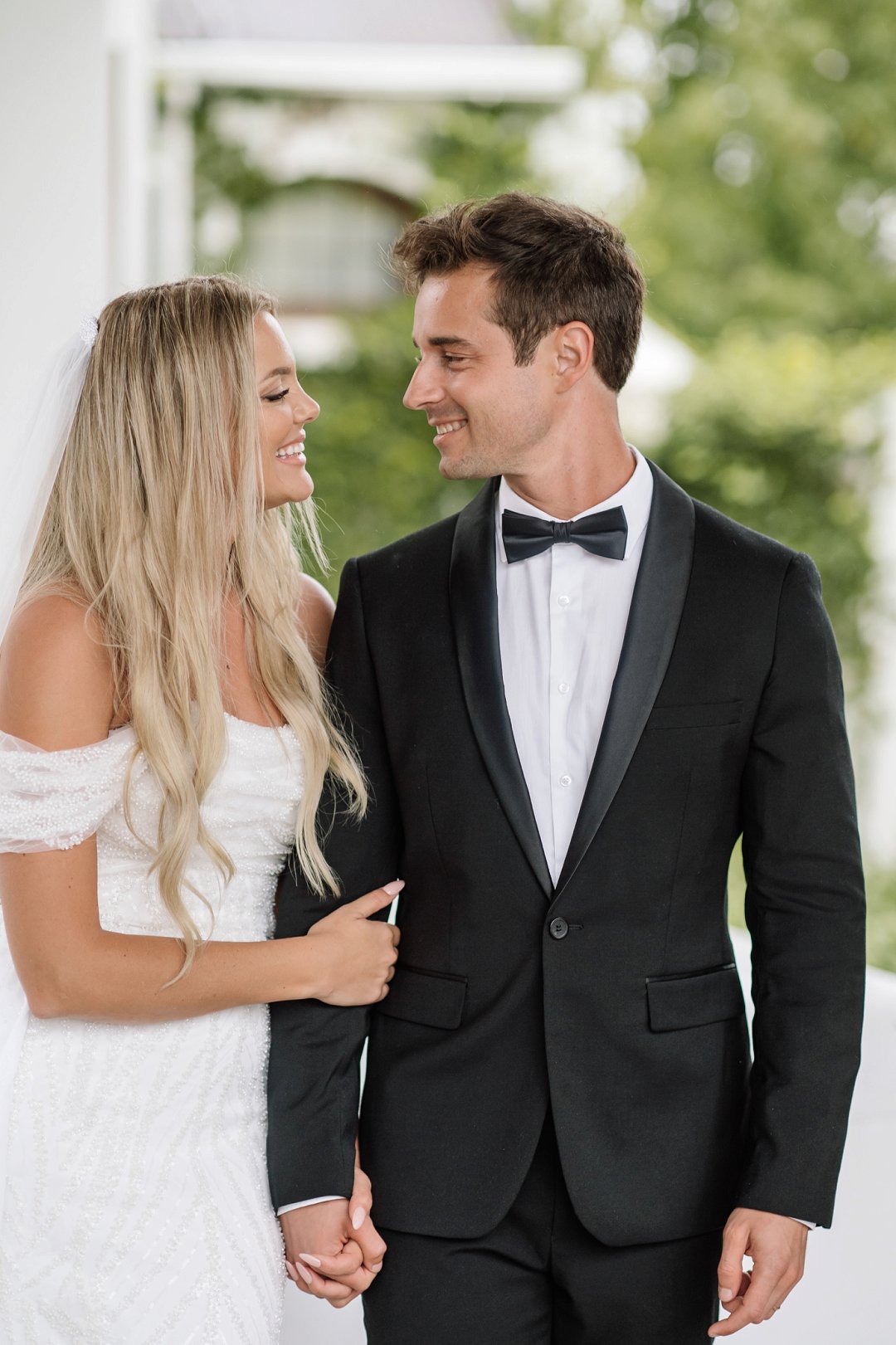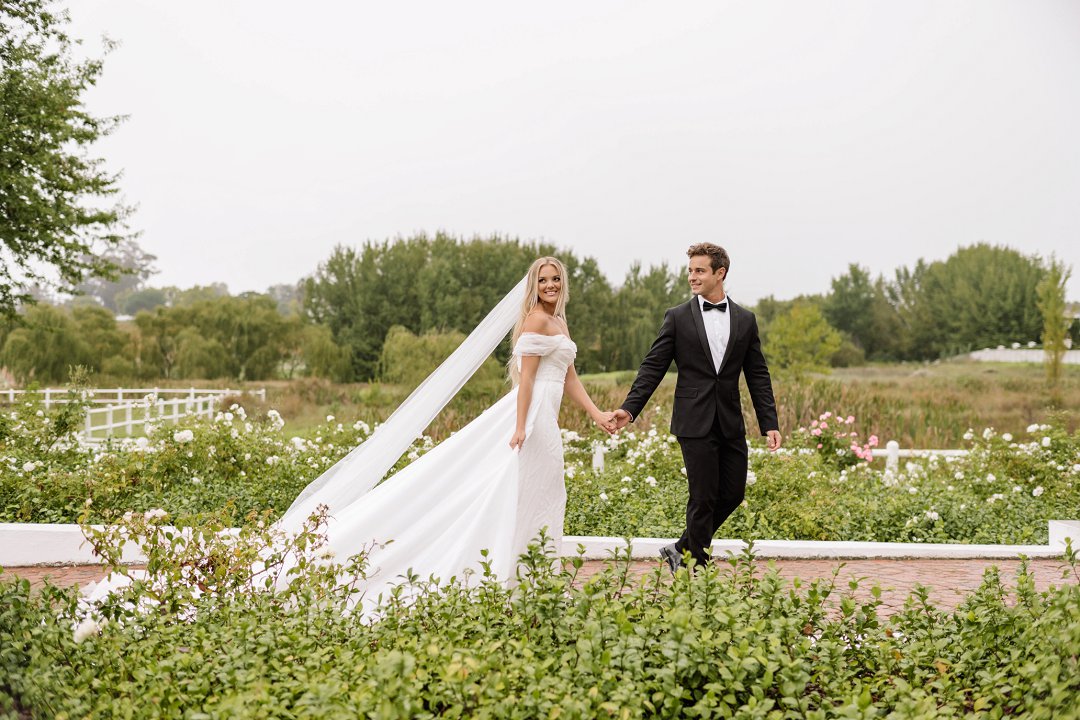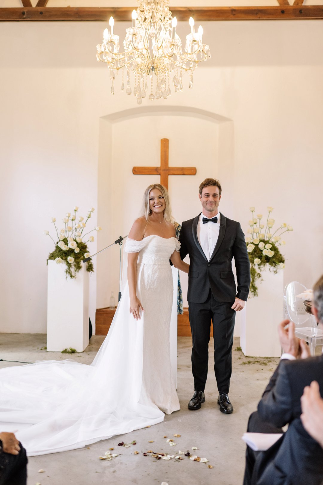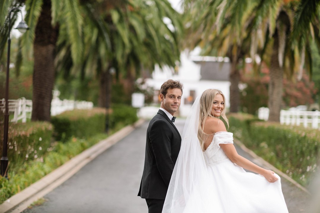 Ons is totaal-en-al dolverlief op die Michelle se trourok! Die lang sluier en oop skouers, te same met die fyn kralewerk detail op die trourok is dit ʼn besonderse trourok wat haar voorkoms baie goed gekomplimenteer het. Die bruidegom se swart troupak met die strikdas is so deftig en werk perfek saam met die troue se styl.
