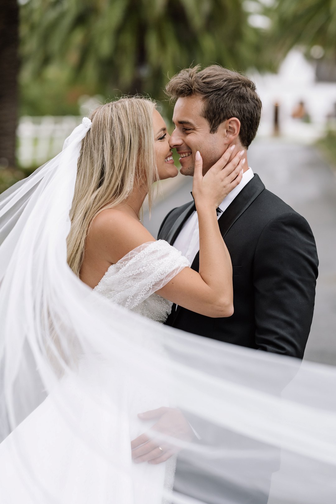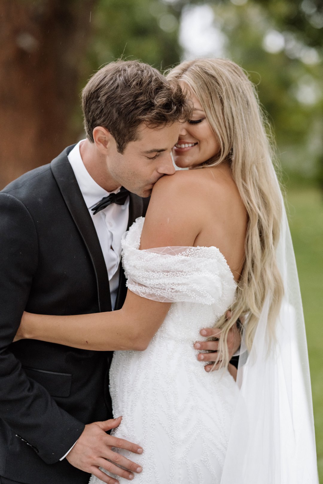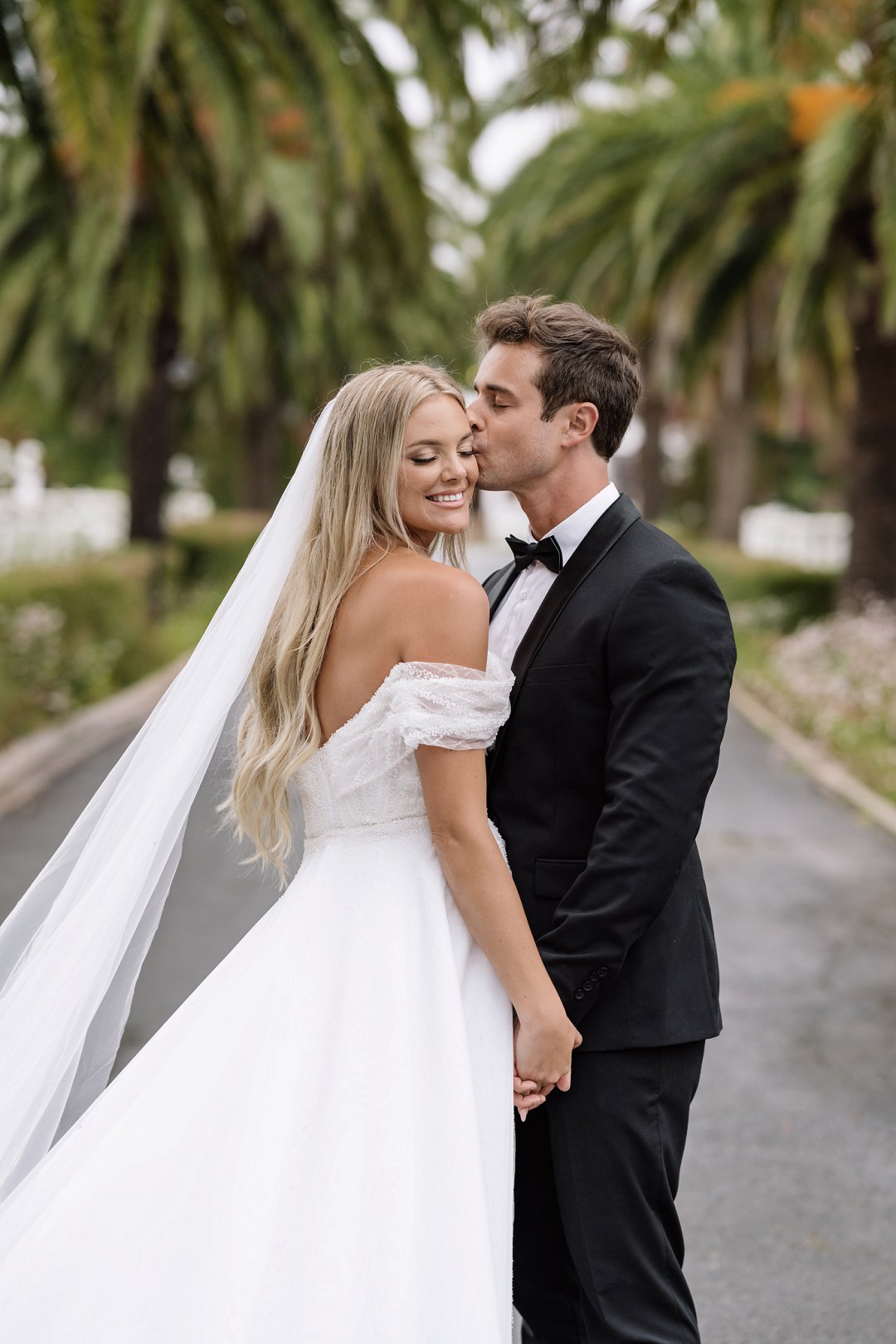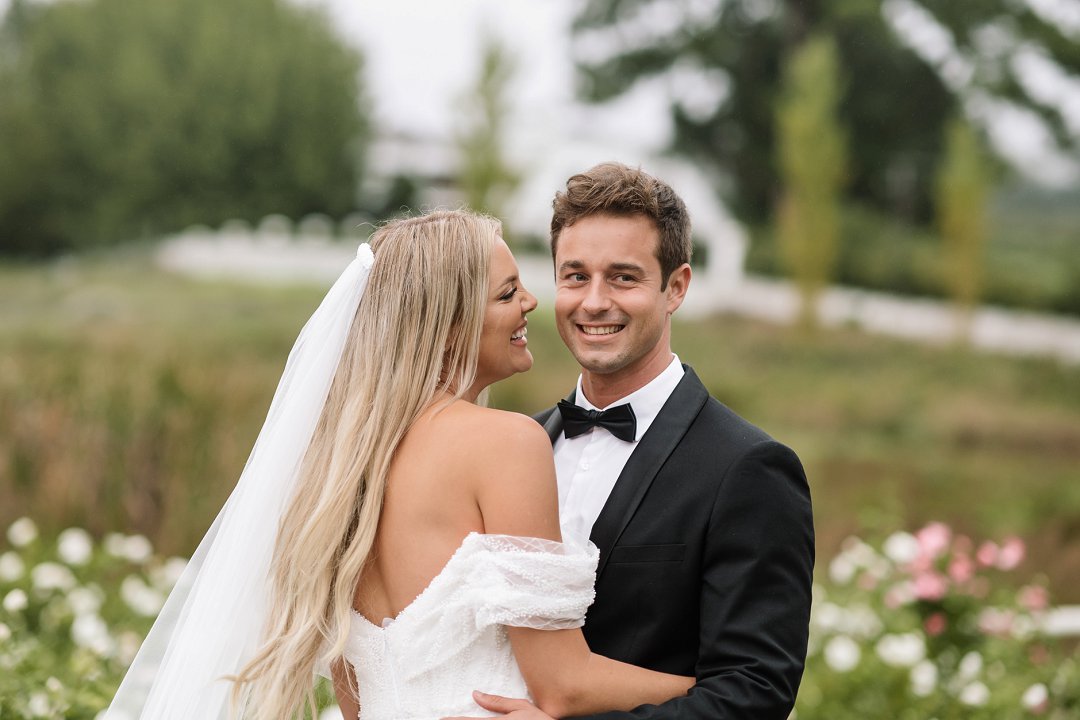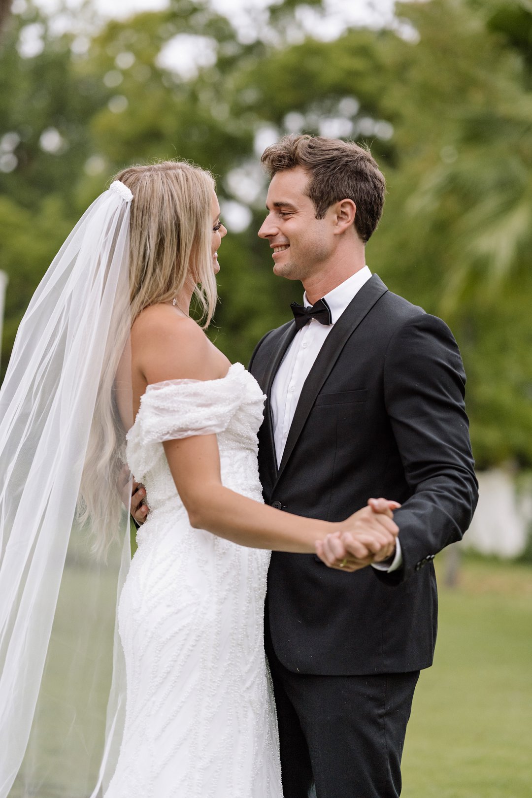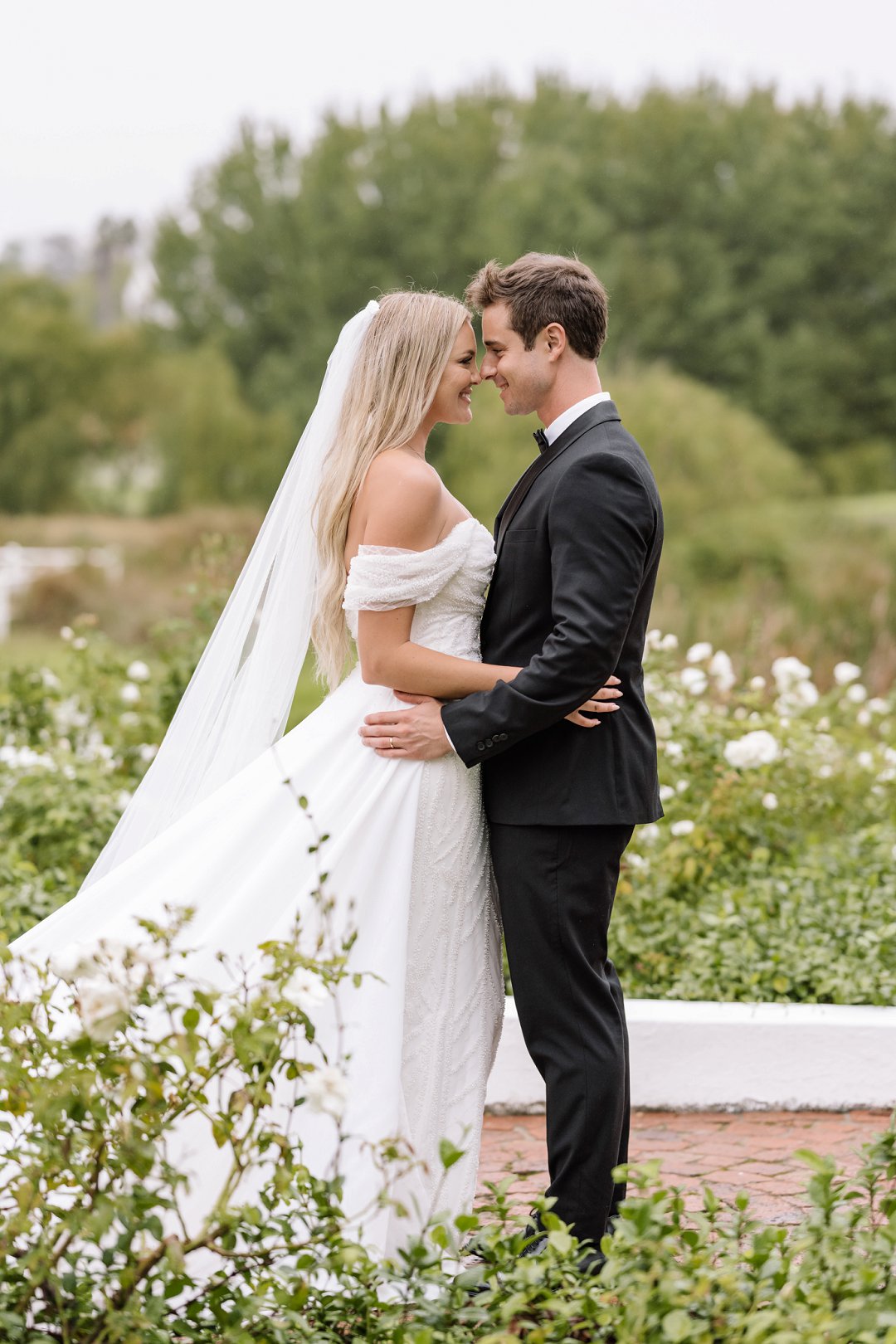 Ons is totaal-en-al dolverlief op die Michelle se trourok! Die lang sluier en oop skouers, te same met die fyn kralewerk detail op die trourok is dit ʼn besonderse trourok wat haar voorkoms baie goed gekomplimenteer het. Die bruidegom se swart troupak met die strikdas is so deftig en werk perfek saam met die troue se styl.