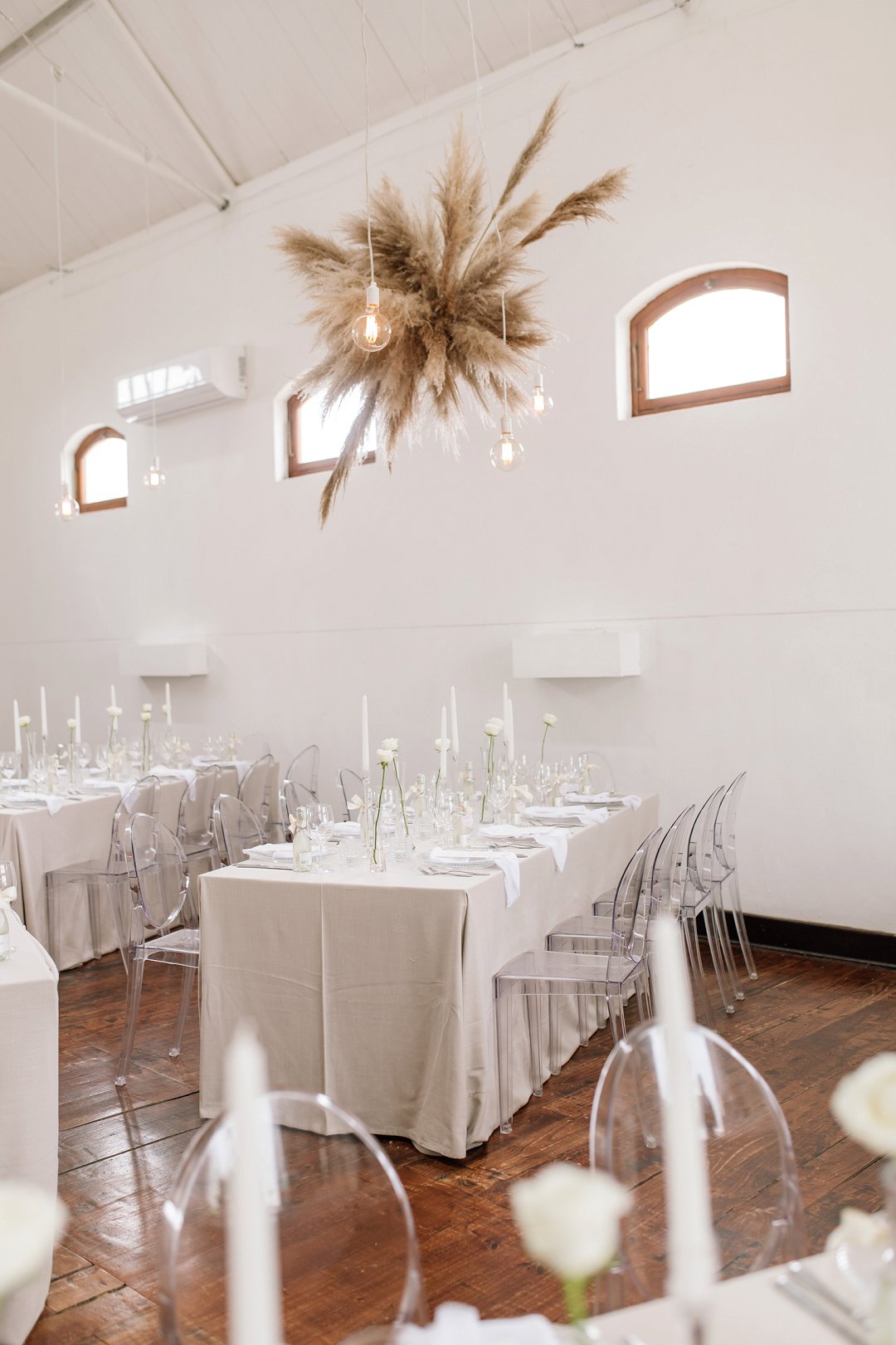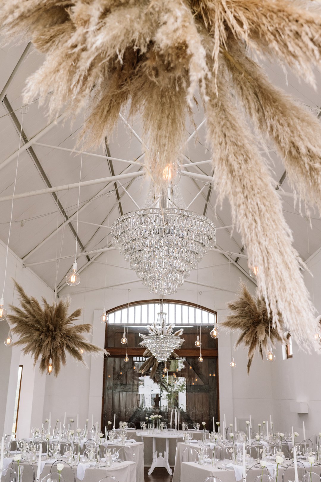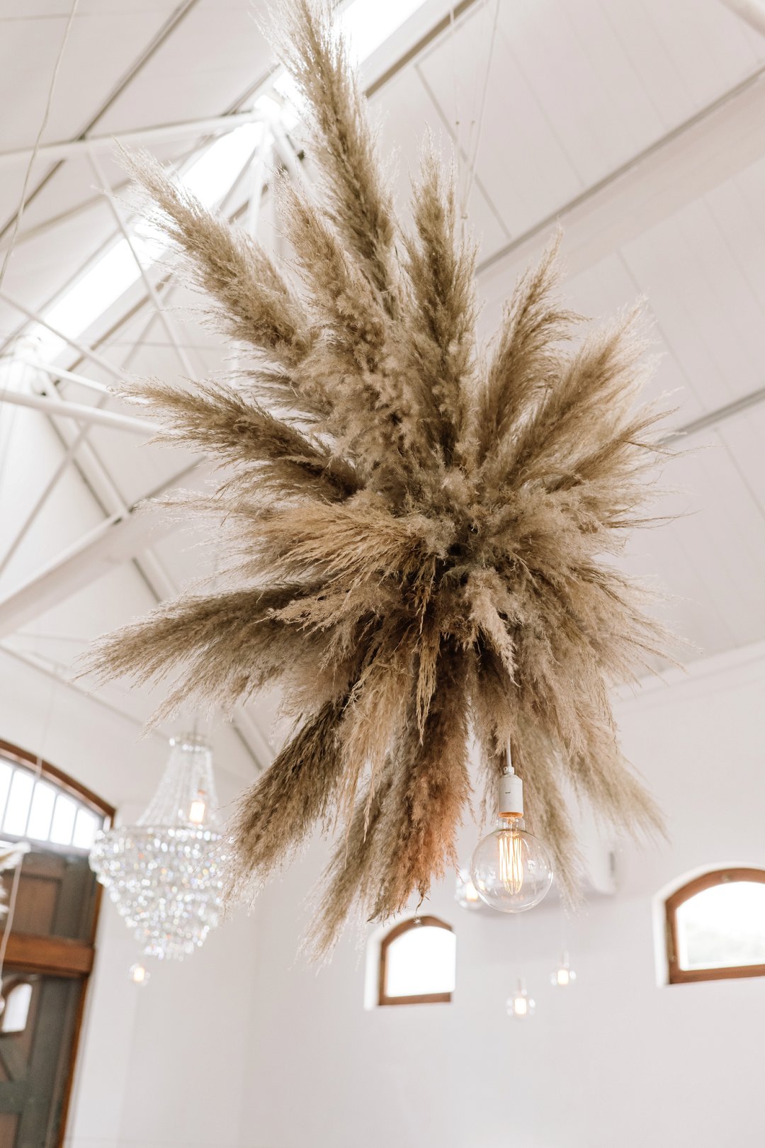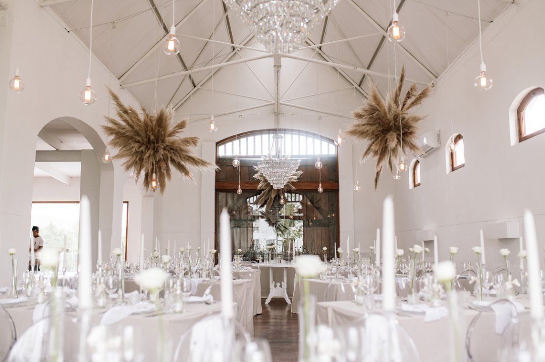 Ons wou dit baie neutraal hou – so ons het wit en sjampanje gekies. Zorgvliet se onthaalarea is klaar só mooi, so ons het nie baie nodig gehad nie. Een ding wat ek graag wou hê was pampasgras wat van die dak hang en Morné van Joli Creations het dit só mooi vir my gedoen! My blomme was net wit rose, baie eenvoudig maar dis wat ons wou hê!