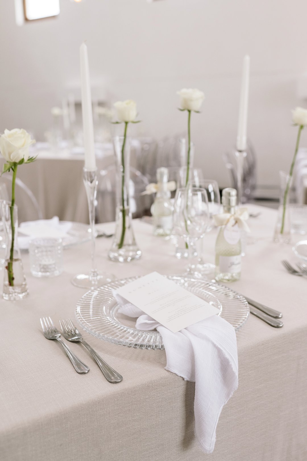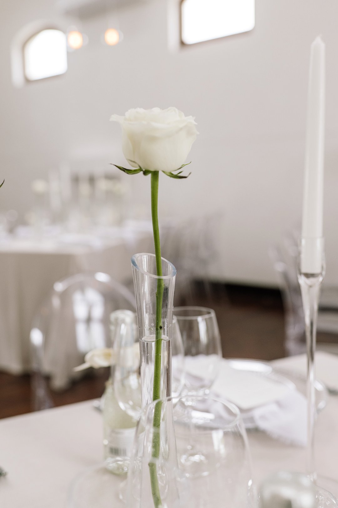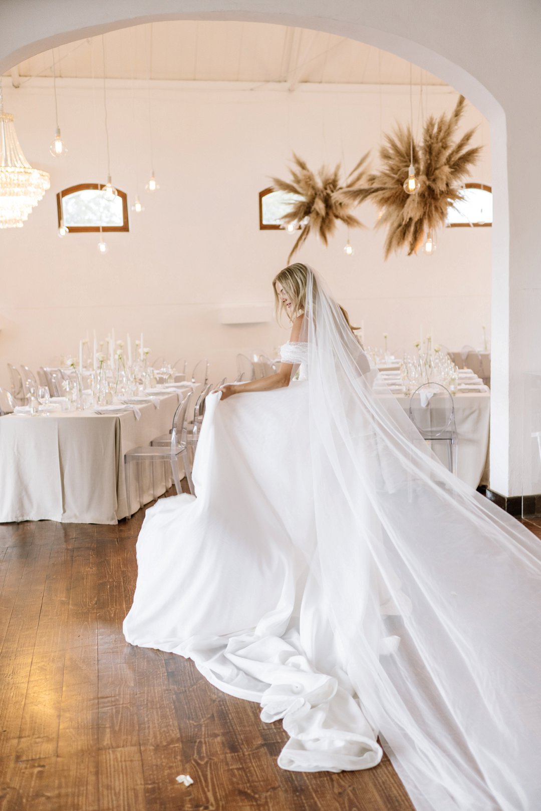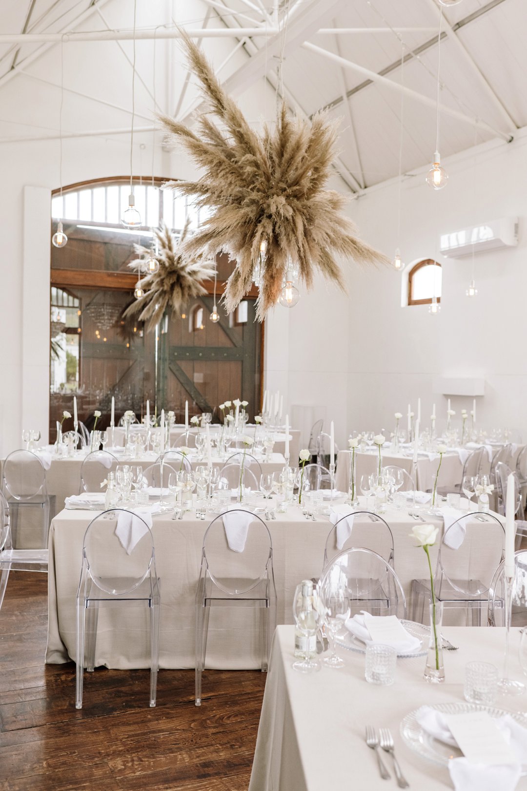 Ons wou dit baie neutraal hou – so ons het wit en sjampanje gekies. Zorgvliet se onthaalarea is klaar só mooi, so ons het nie baie nodig gehad nie. Een ding wat ek graag wou hê was pampasgras wat van die dak hang en Morné van Joli Creations het dit só mooi vir my gedoen! My blomme was net wit rose, baie eenvoudig maar dis wat ons wou hê!