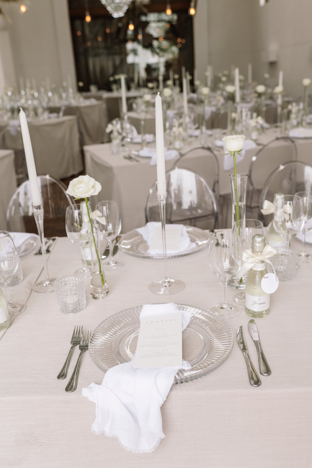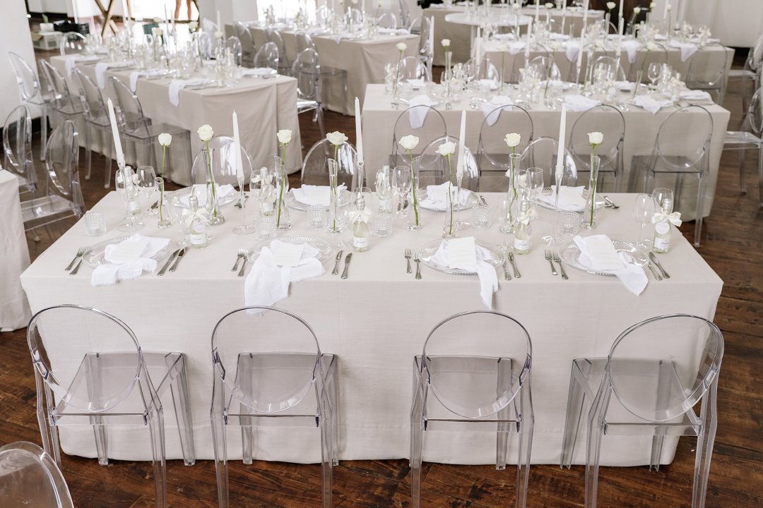 Michelle en Erni se trou dekor was besonders mooi met hul sagte sjampanje en wit kleurskema. Dié gedroogte pampas gras wat van uit die trou venue se dubbel volume dak hang skep die illusie van hoogte en spasie en pas by die hele tema van die paartjie se troue. Sjampanje kleur tafeldoeke met deurskynende stoele skep ʼn deftige voorkoms. Daar is slegs wit rose gebruik op die gaste tafels en alles was verskillende tekstuur glas potte. Die glas kers houers met die spierwit dun kerse in skep ook hoogte aan die tafel en gee ʼn romantiese voorkoms aan die onthaal lokaal later die aand.