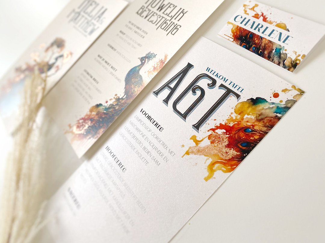Diep blou, groen, pers en goud kan ʼn pragtige kombinasie skep. Pou-illustrasie is die middelpunt of ʼn fokuspunt op die trou uitnodiging en kan bo, onder of in ʼn hoek op die oorblywende trou skryfbehoeftes geplaas word. I Do – Creative Concepts het ʼn hoë-gehalte karton en tekstuur papier gebruik wat die kleurpalet komplementeer. Oorweeg dit om metaal aksente te gebruik vir ʼn tikkie luuksheid. ʼn Klassieke gevoel word bygevoeg deur klasieke lettertipes en tipografie te gebruik saam met ʼn vintage kleurpalet – wat die gevoel gee van ʼn gedrukte boek.