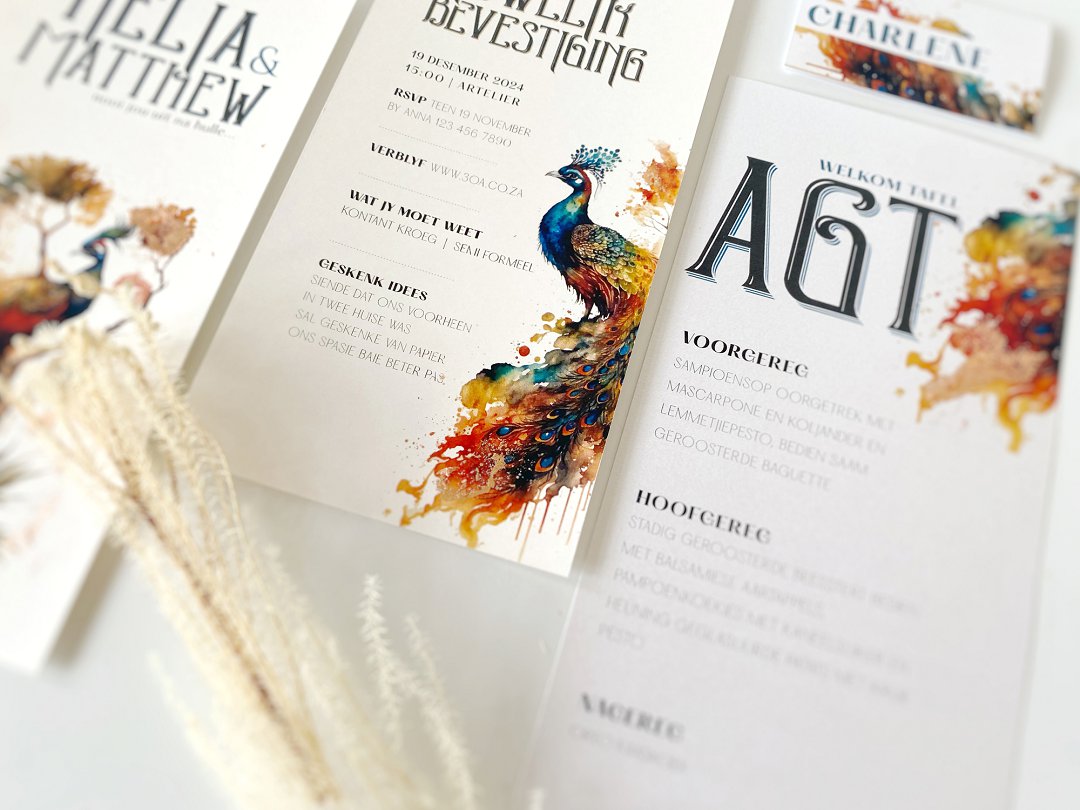 Die kunstige waterverf pou geïnspireerde trou skryfbehoeftes is ʼn unieke trou skryfbehoefte stel vir paartjies opsoek na ʼn bietjie kleur. Die talentvolle trou skryfbehoefte ontwerpers van I Do – Creative Concepts het hierdie unieke pou geïnspireerde trou skryfbehoefte stel ontwerp. Hierdie waterverf pou geïnspireerde trou uitnodiging en trou skryfbehoeftes is ʼn pragtige en unieke manier om die toon aan te gee vir jou spesiale dag. Die ryk en lewendige kleurpalet is geïnspireer deur pouvere.