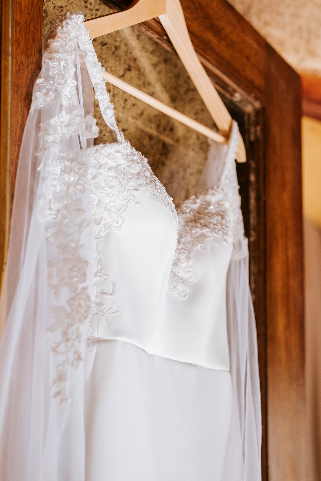 My trourok was perfek. Die idee wat ek in my kop gehad het, het Carike Nel Designs ʼn droom laat waar word. Dit was ʼn nou passende spierwit rok. Lae oop rug en lang sleep. Op die punt van die sleep was twee pêrel hartjies met my en Ampie se voorletters geborduur.