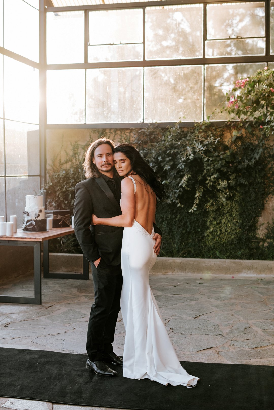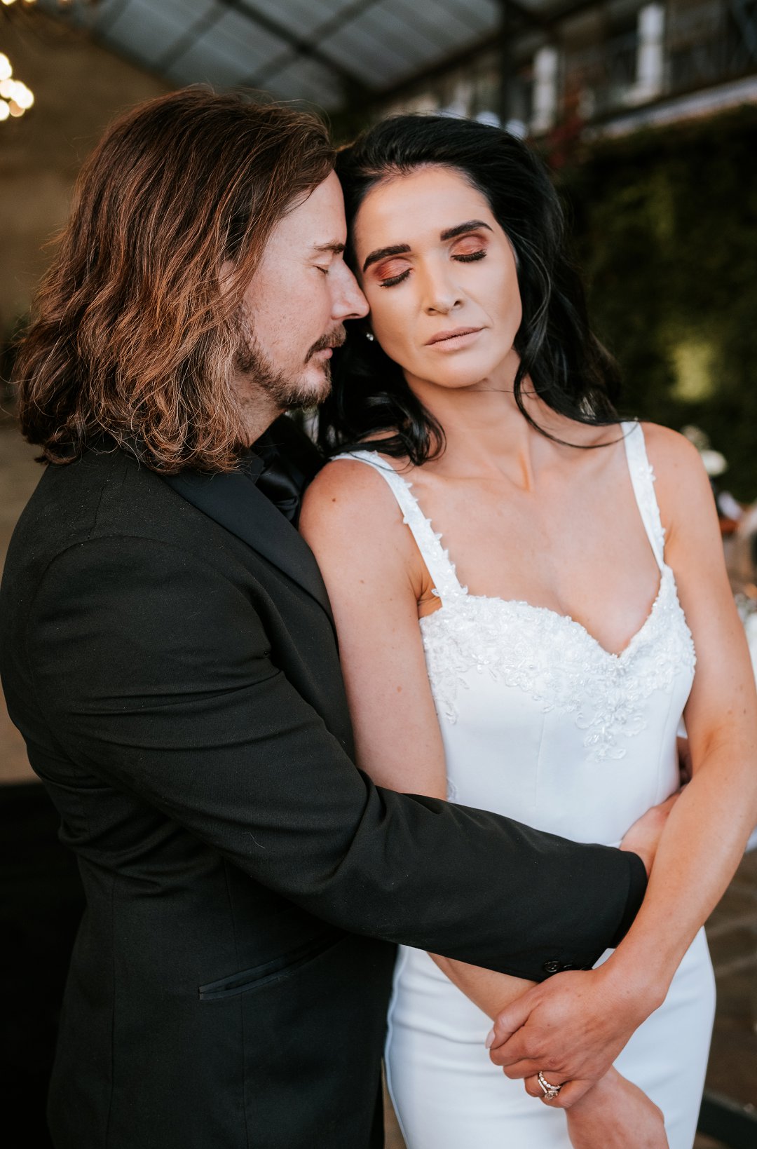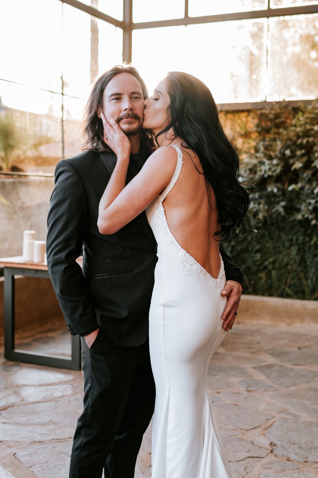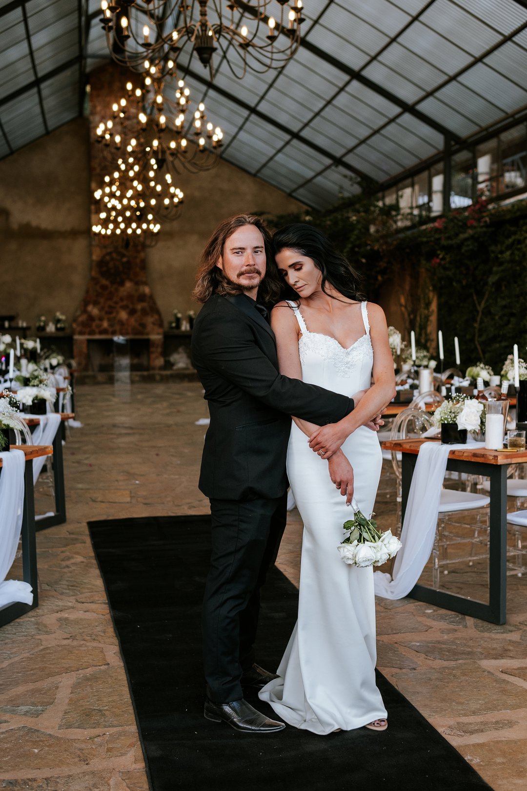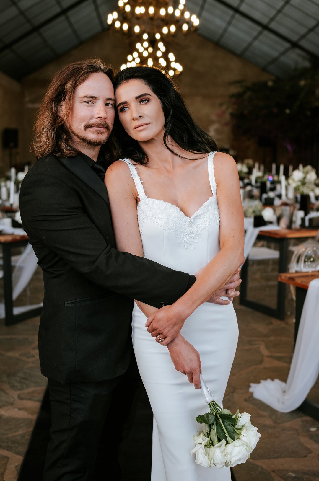 Elaine het beeldskoon gelyk in haar trourok. Ons is veral gaande oor die simplistiese styl van haar trourok en die lae oop rug. Dit pas só mooi by haar en die wit roos handruiker komplimenteer haar voorkoms. Ampie het baie dapper gelyk in ʼn volledige swart uitrusting.